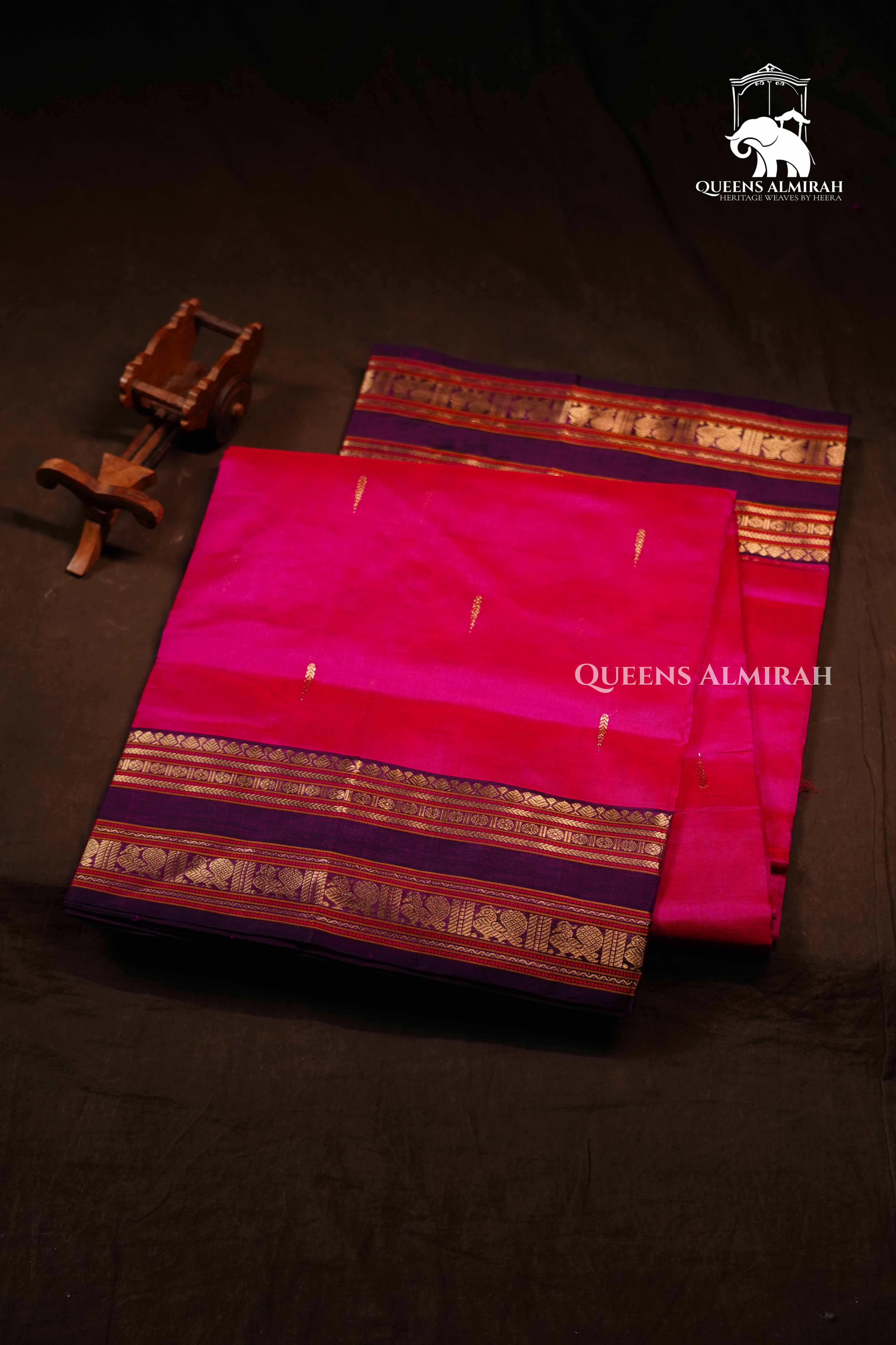 Embrace timeless grace with these handwoven Chettinad silk cotton sarees, known for their rich colors, intricate motifs, and lightweight comfort. Striking magenta body with golden zari buttas, paired with a deep purple border featuring intricate temple designs.