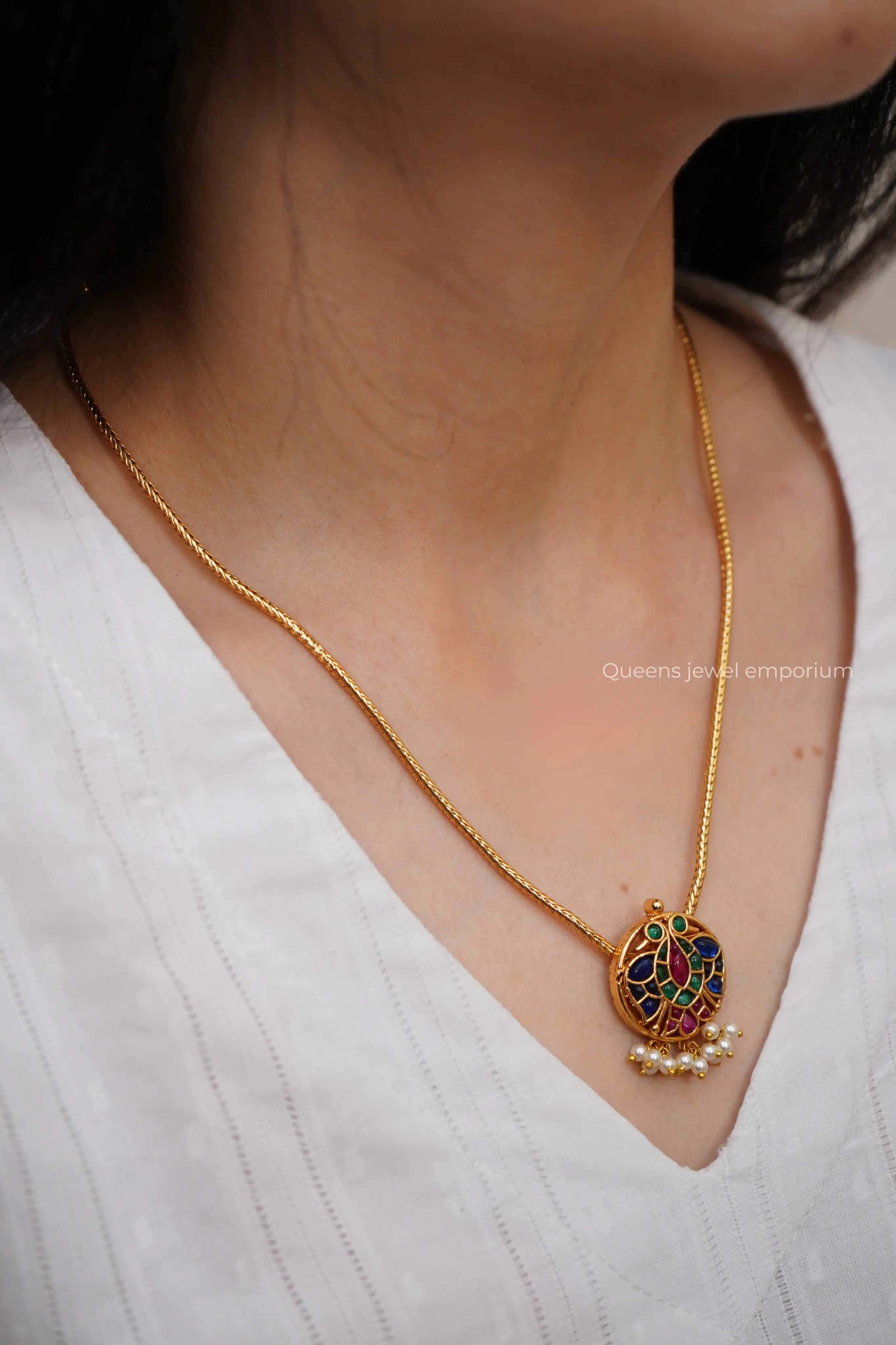 Elevate your traditional South Indian look with our MAHILAM NECKLACE. Handmade with Kemp stones and a pearl ball hanging, this minimal set is a perfect balance of elegance and tradition. Adorned with gold plating and silver alloy, it adds a touch of sophistication to any attire.