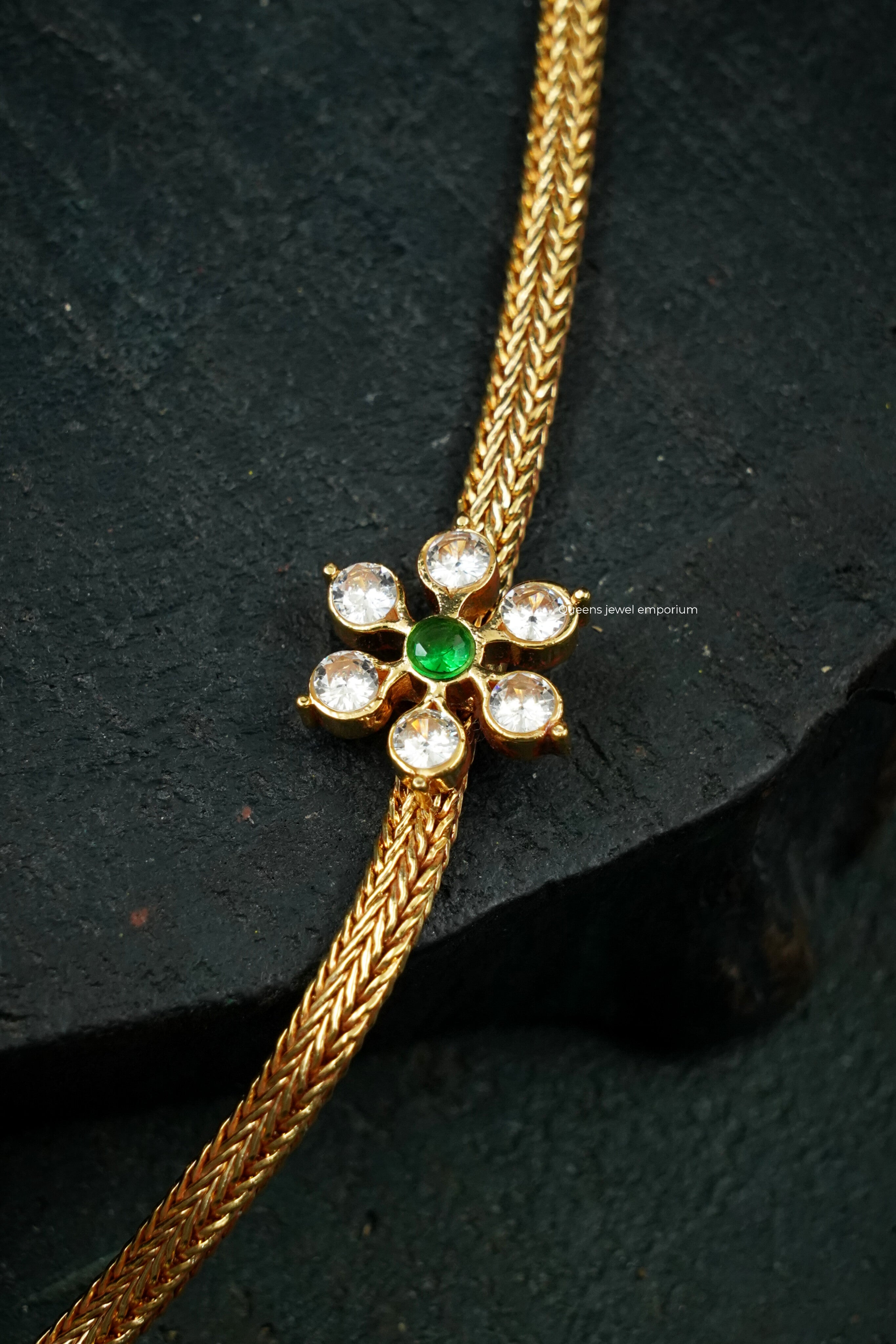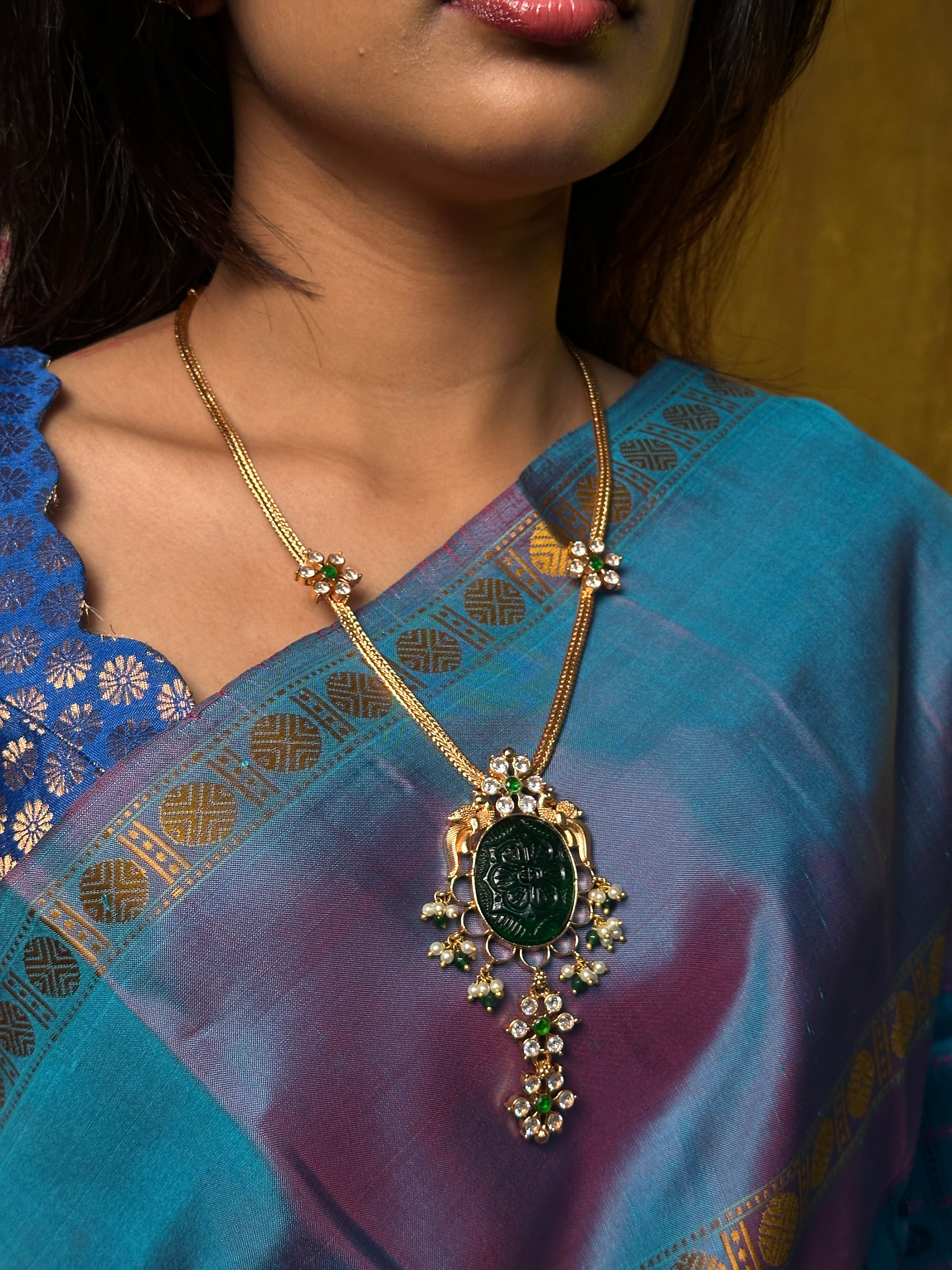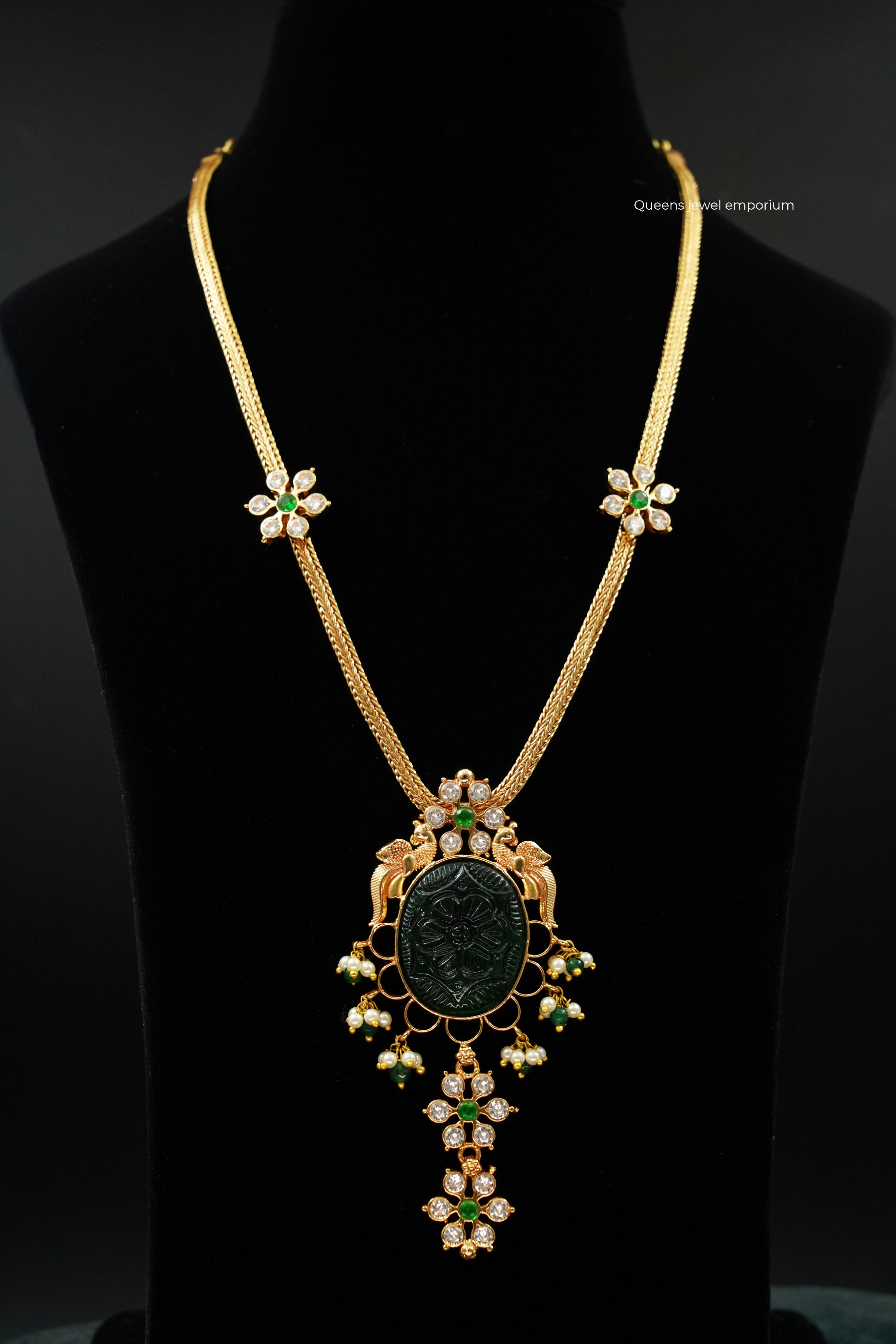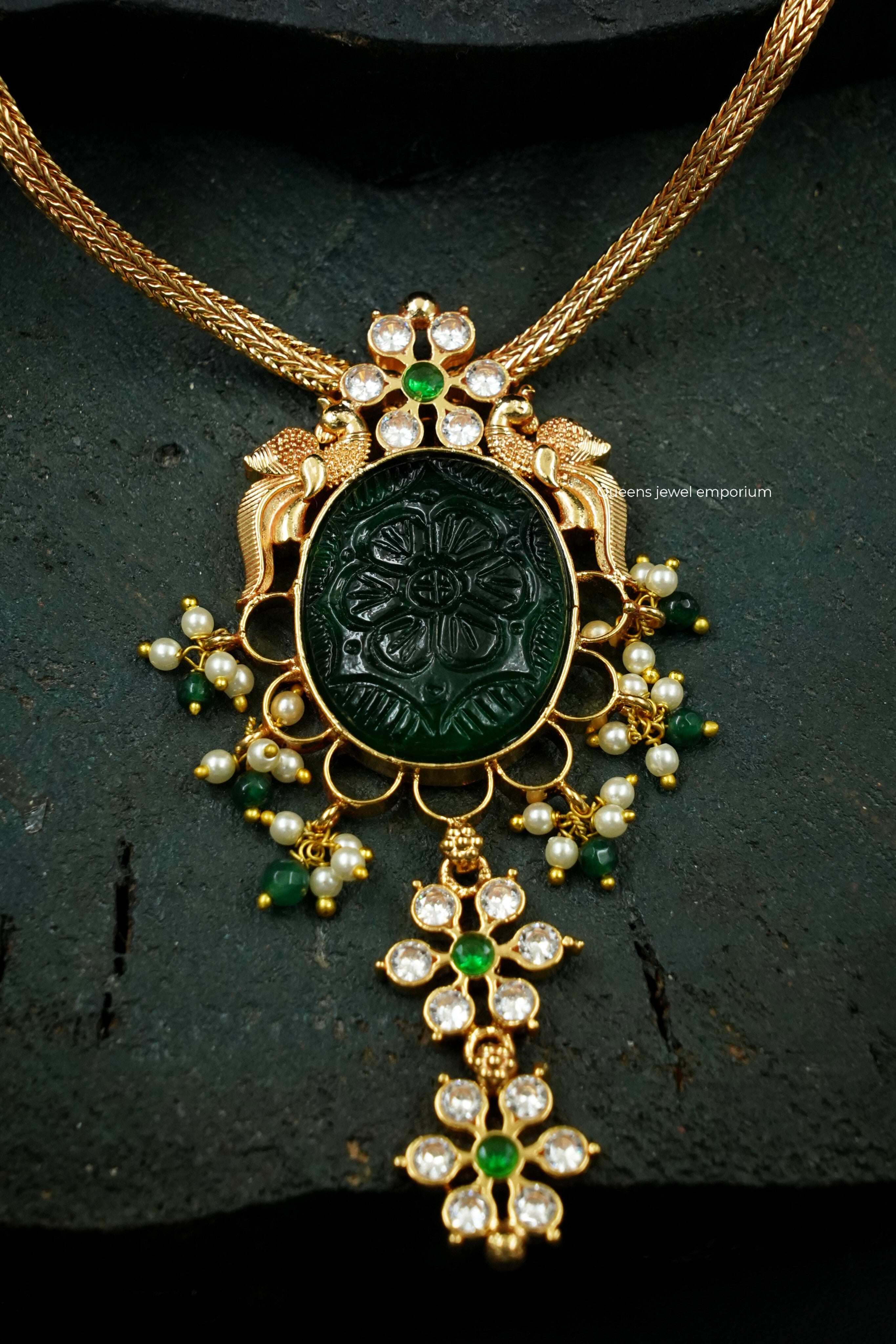A striking pendant featuring an oval green carved stone framed by detailed two nagas kizhi motifs on the sides. The zircon floral top adds a bright sparkle, while zircon floral drops with baby pearl hangings give it a graceful temple finish.Crafted with Queens Jewel Emporium’s signature lasting shine.