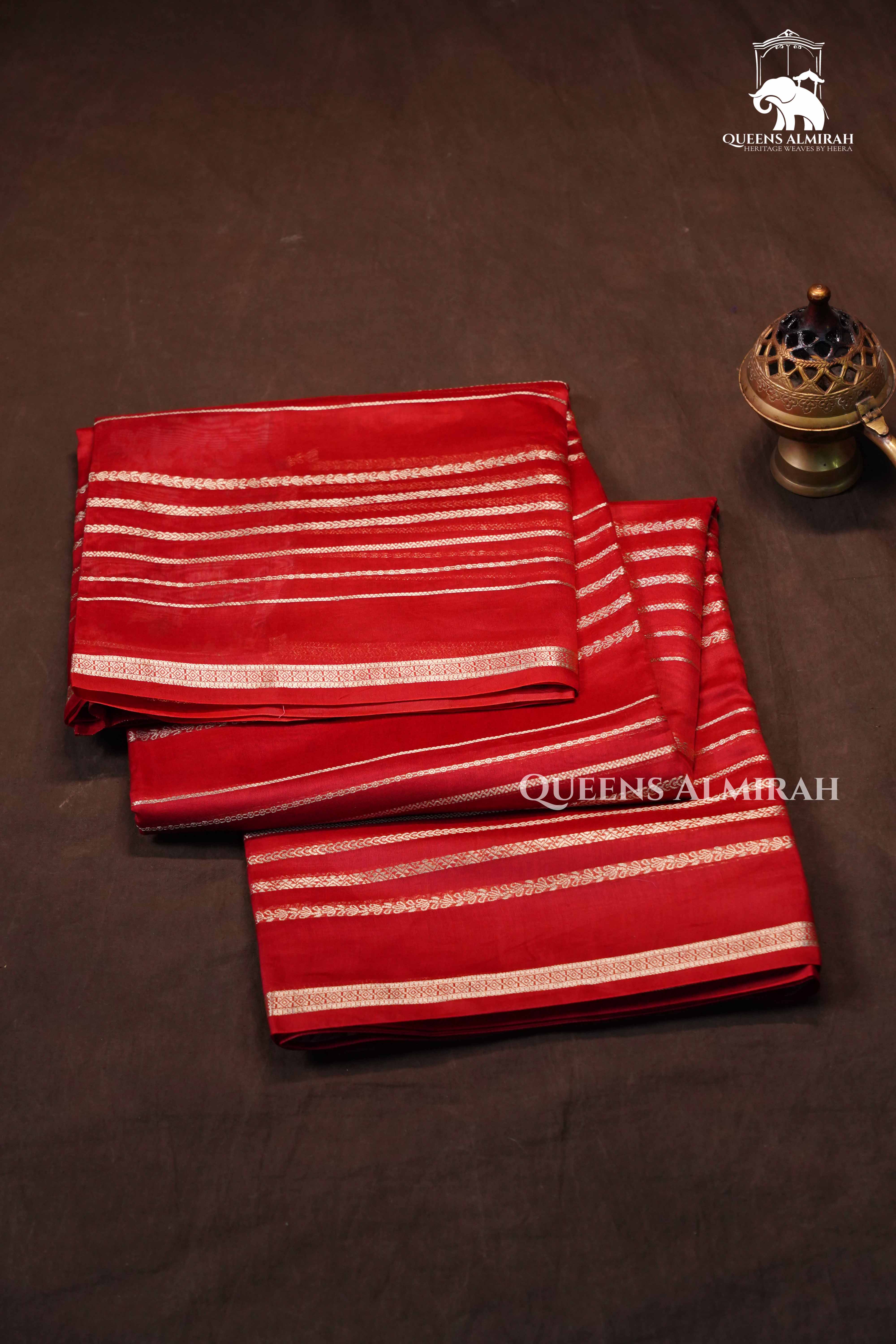 An elegant Dark Red Chanderi silk cotton saree, featuring delicate golden zari stripes across the body and a beautifully woven floral pattern on the blouse. Lightweight yet classy, this saree strikes the perfect balance between comfort and sophistication, making it ideal for festive gatherings, traditional occasions, and evening celebrations.
