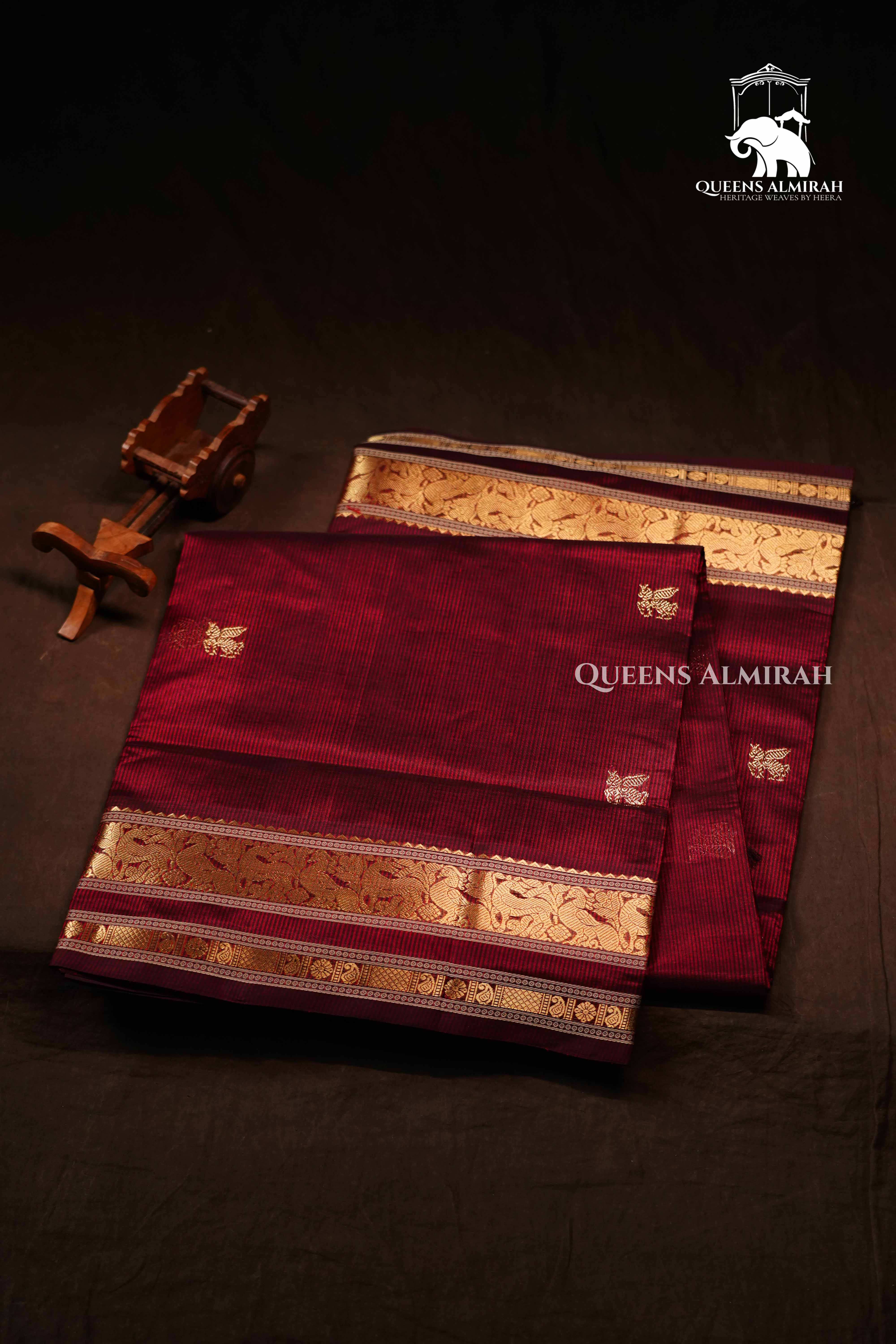 “A Maroon Chettinad silk cotton saree adorned with subtle pinstripes and an opulent golden zari border featuring intricate floral motifs, exuding traditional grandeur and sophistication.”