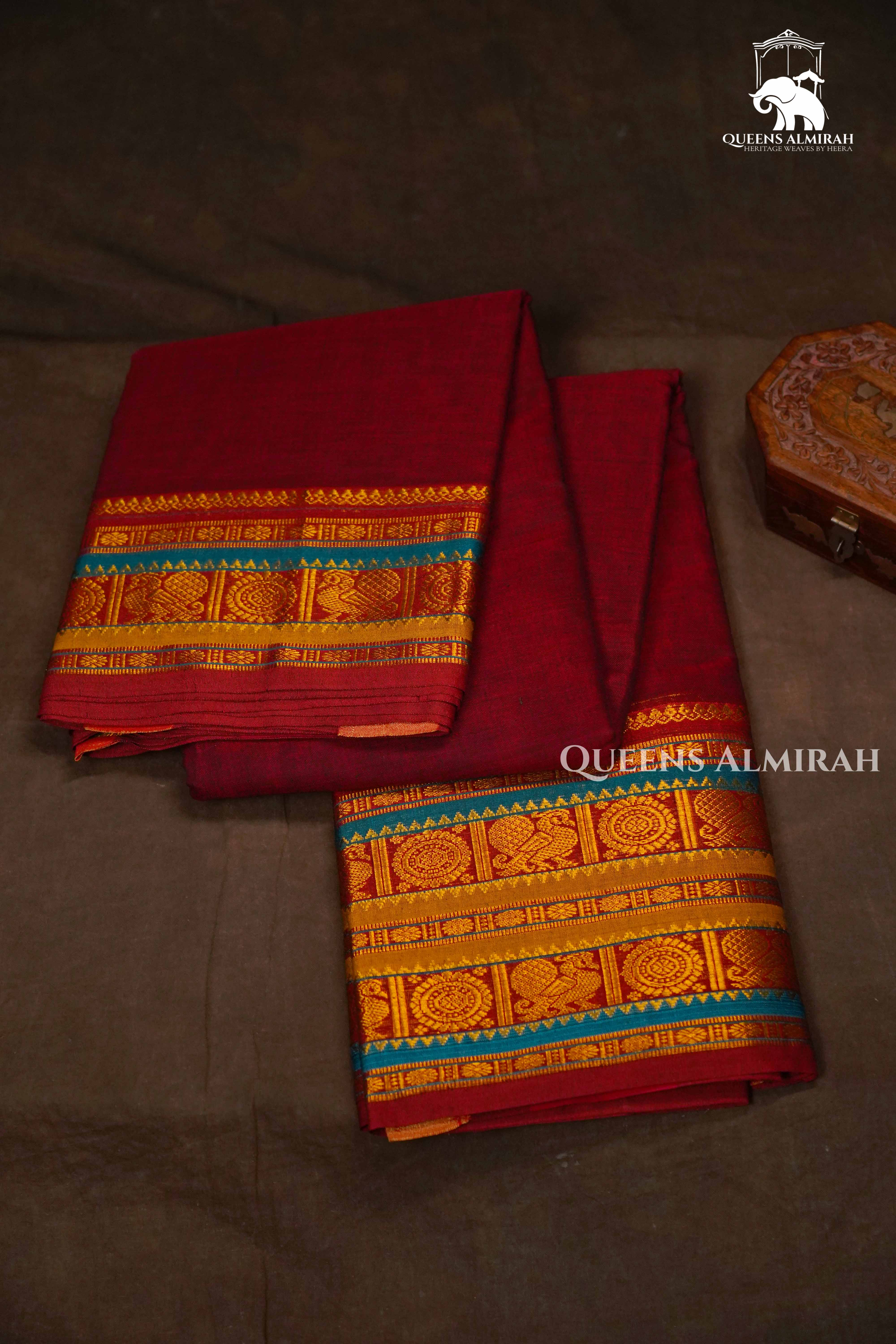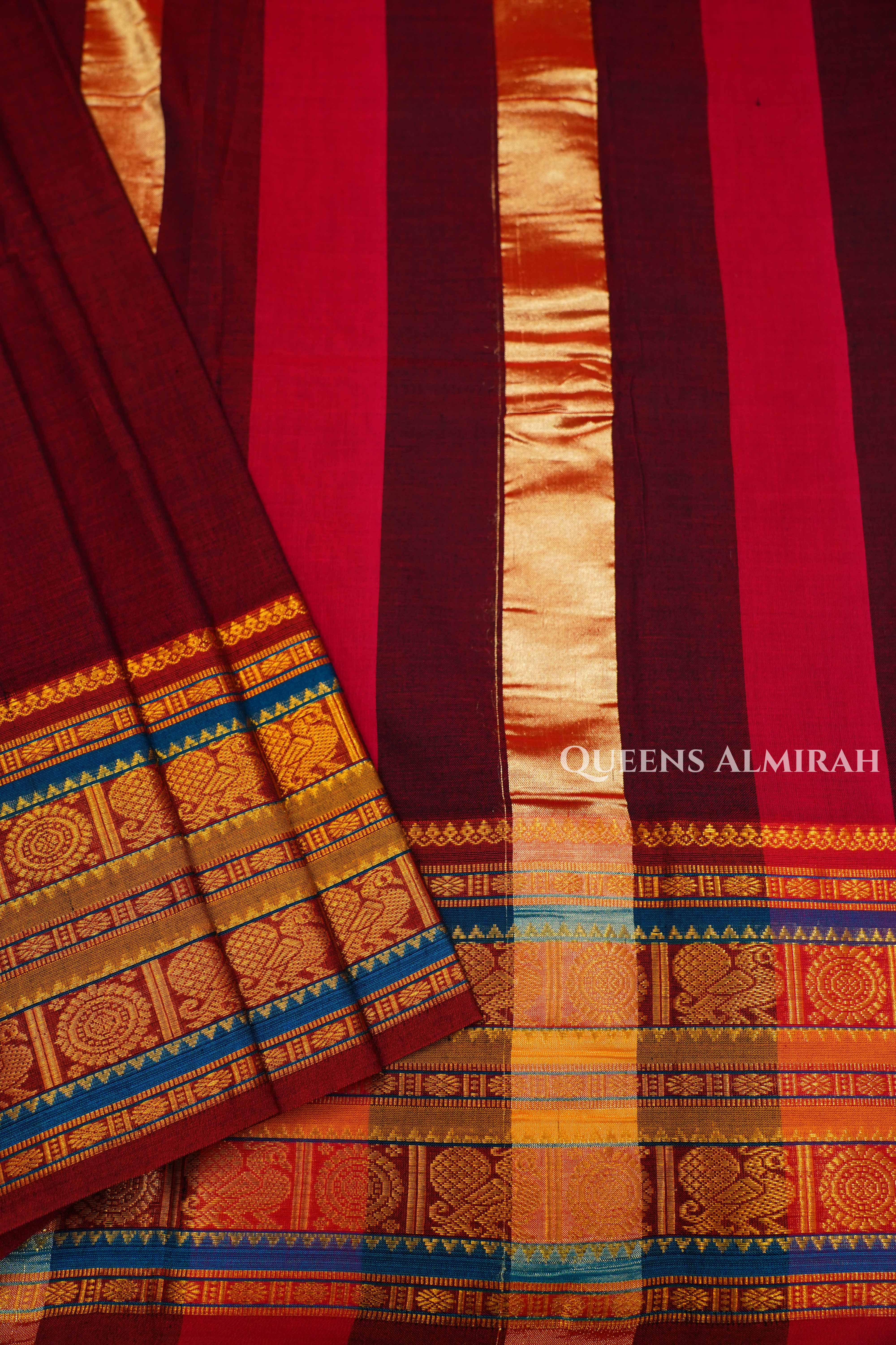 "Rich Maroon Elegance: Drape yourself in timeless charm with this maroon silk saree featuring bold maroon and red stripes on the body, complemented by an intricately woven golden zari border with hints of royal blue. Perfect for weddings, festive celebrations, and traditional occasions, this saree exudes heritage and grace."