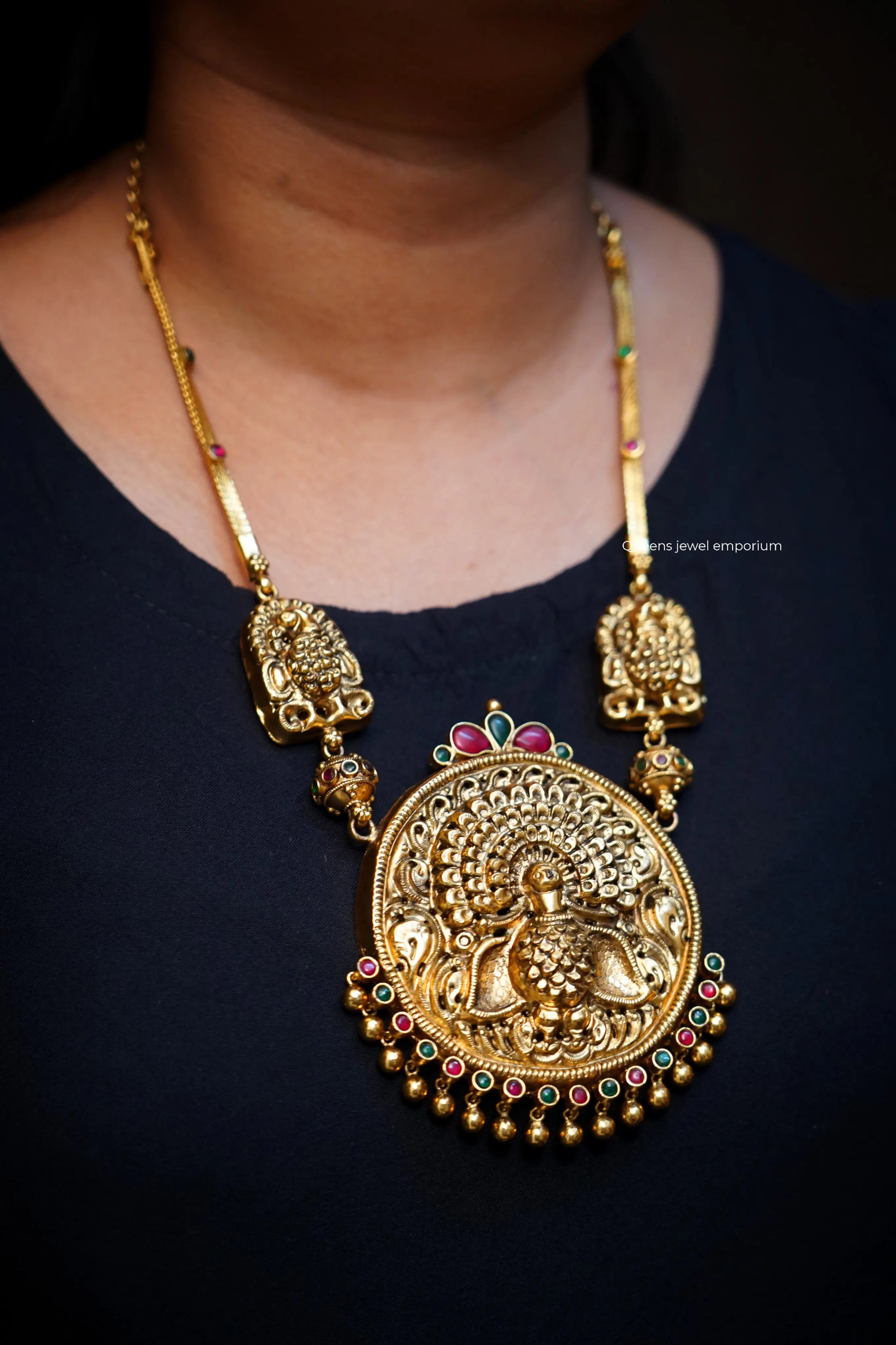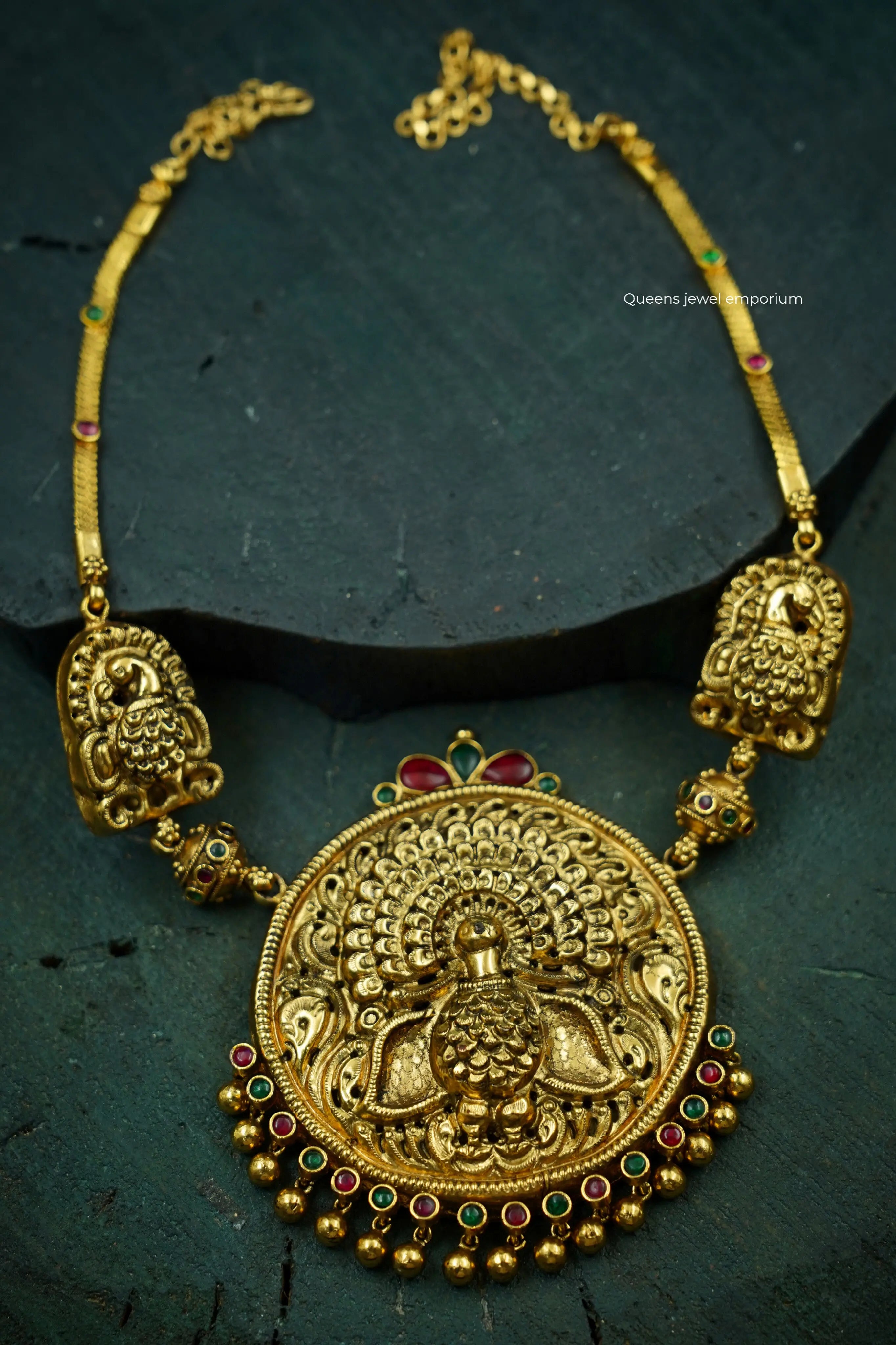 A striking round-shaped pendant adorned with a bold peacock Nagas motif at the center, flanked by two elegant peacock Nagas motifs. Finished with traditional gold ball hangings, this design captures timeless grandeur in every detail.Truly a treasure to pass down for generations.