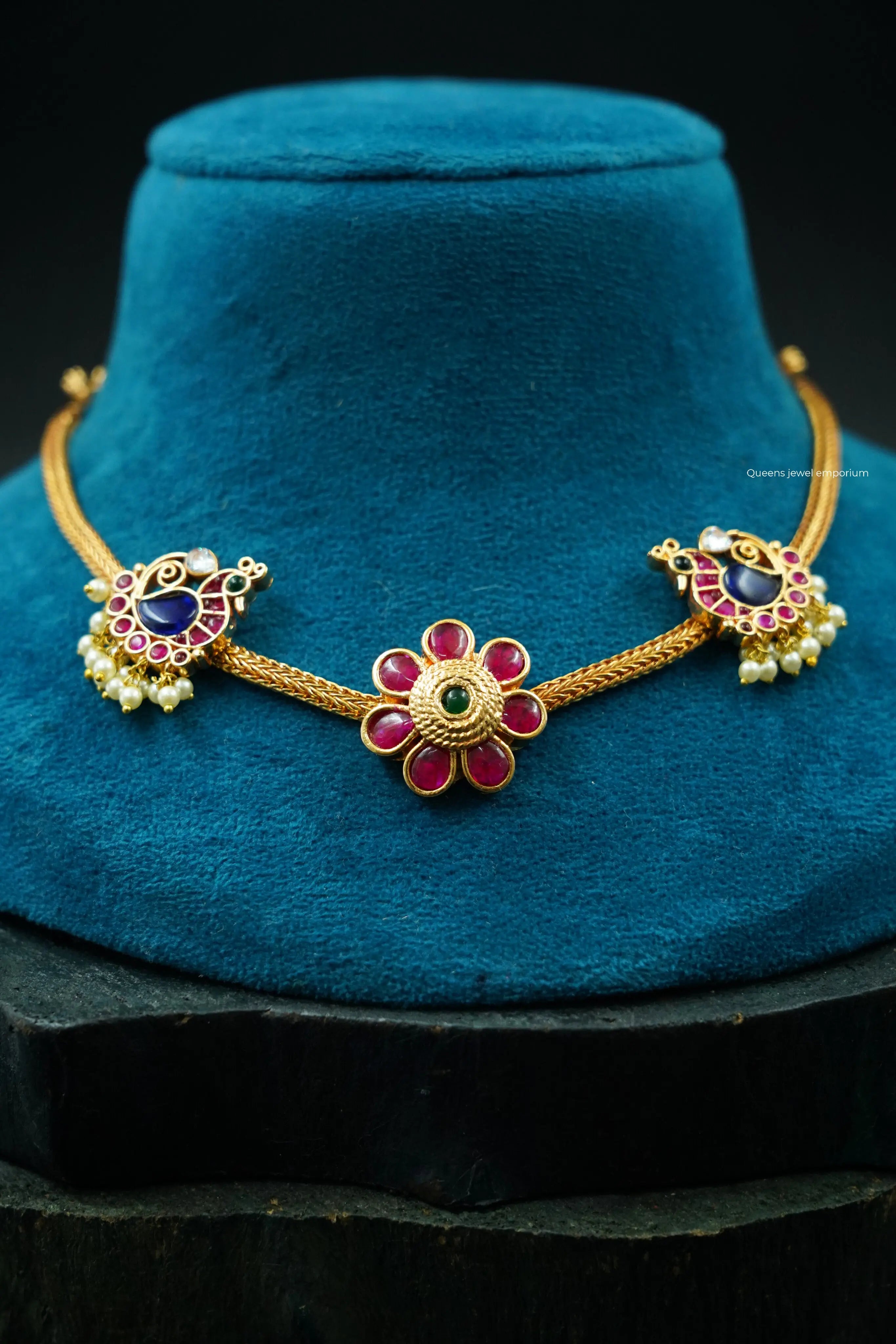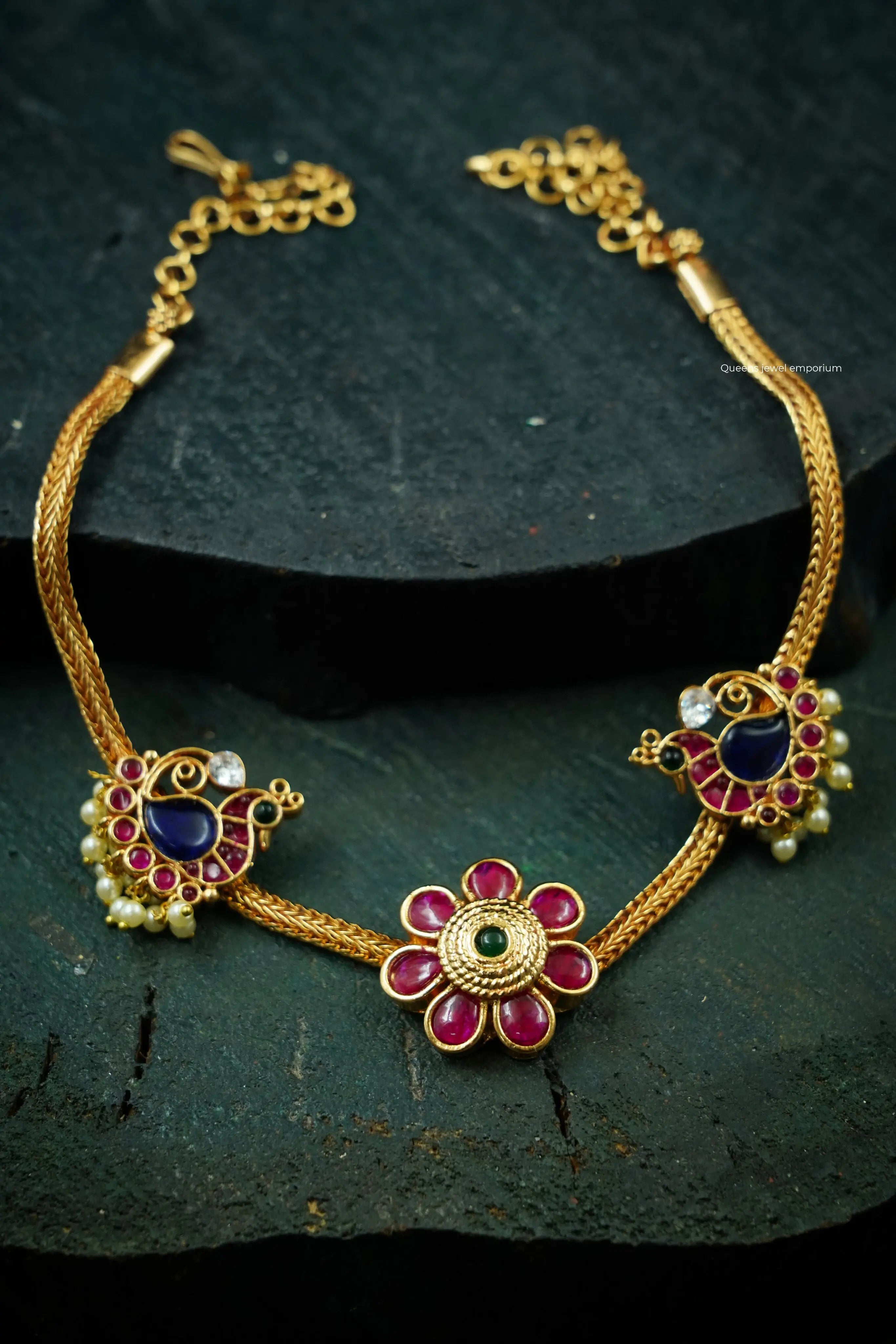 This elegant necklace features a timeless floral motif set with rich red kemp stones, framed by two graceful peacock designs on the sides. A classic piece that blends traditional artistry with refined charm.Tradition reimagined with beauty,One-of-a-kind jewellery.