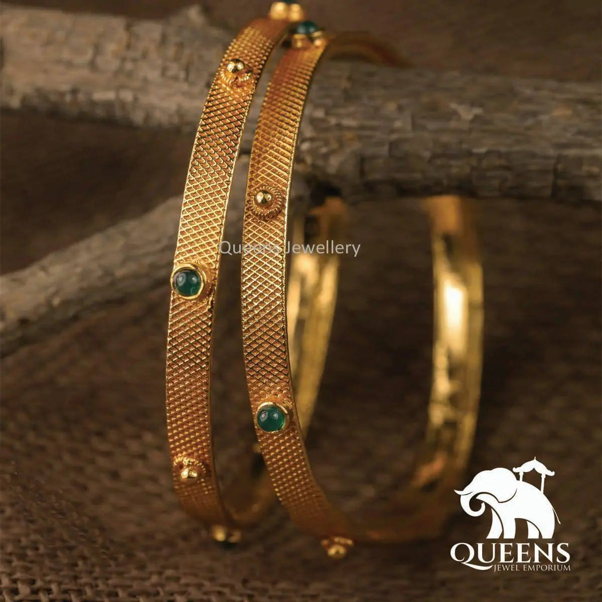 A very simple and elegant pair of plain bangles highlighted with small green stones for all occasions.