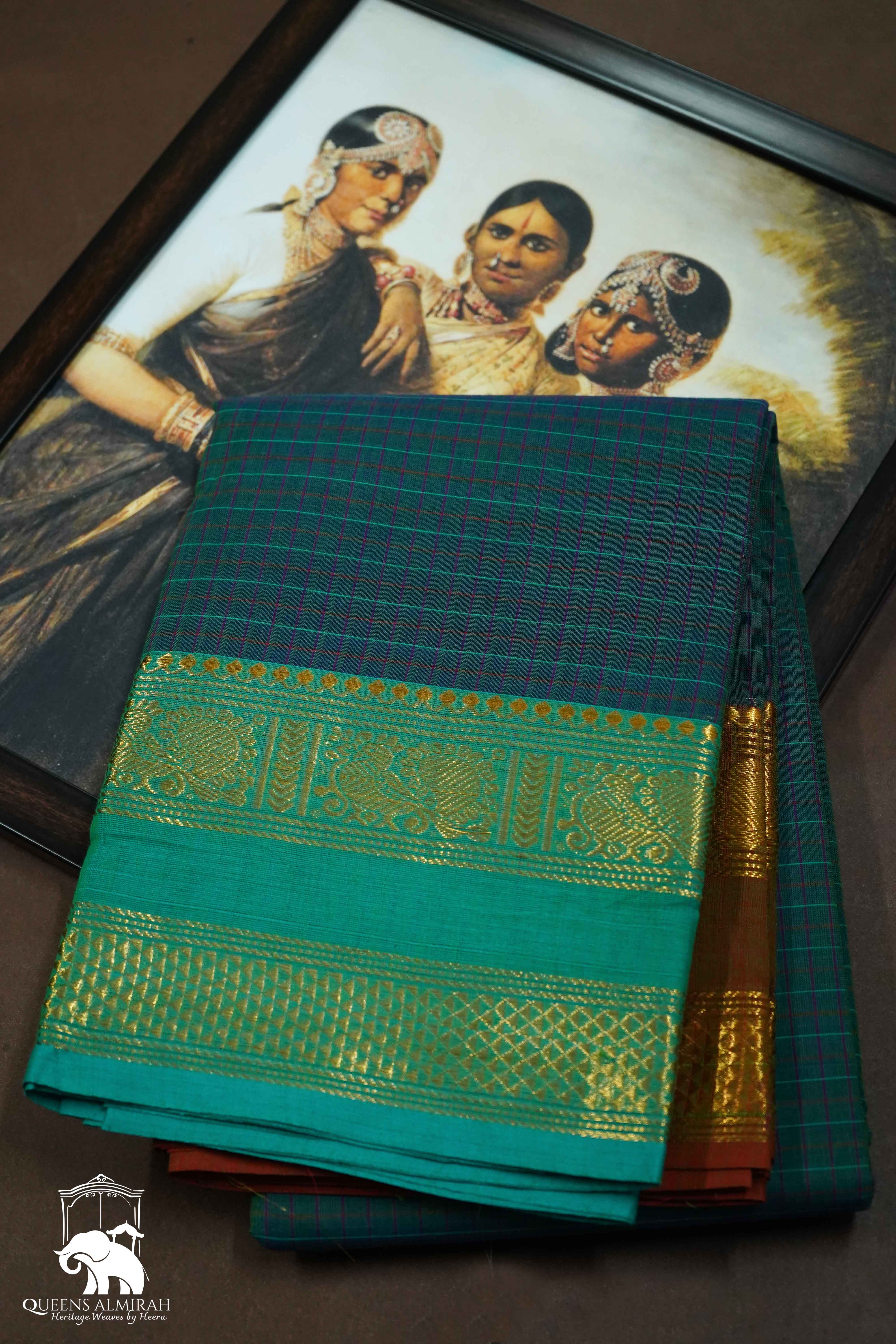 Experience the elegance and luxury of our MINERAL GREEN WITH DEEP SEA KANCHI COTTON SAREE. The golden rettapet border and double color border in peacock design add a touch of opulence to this traditional attire. Made from high-quality Kanchi cotton, this saree offers both comfort and an exquisite look. Elevate your style with this timeless piece.