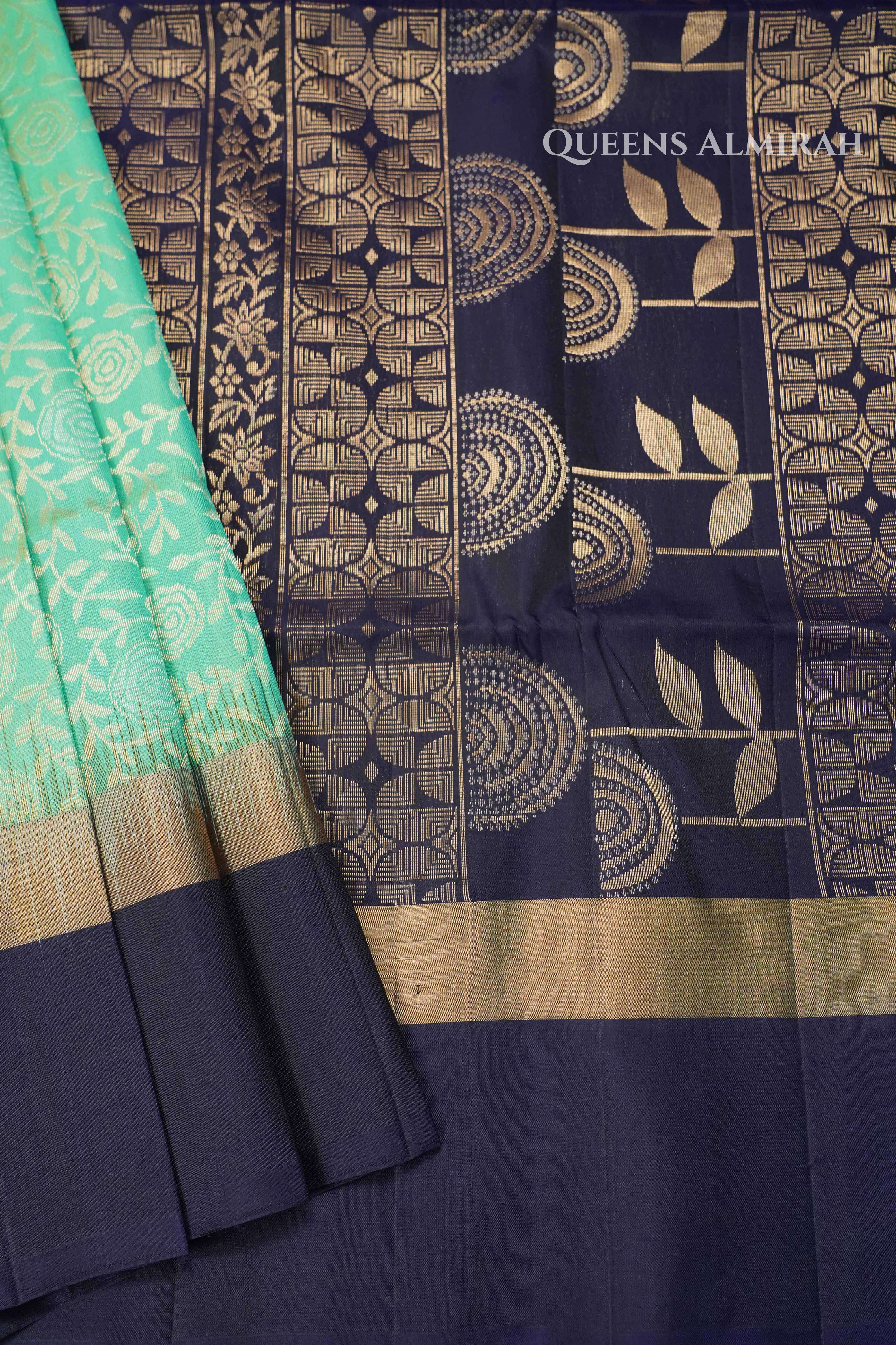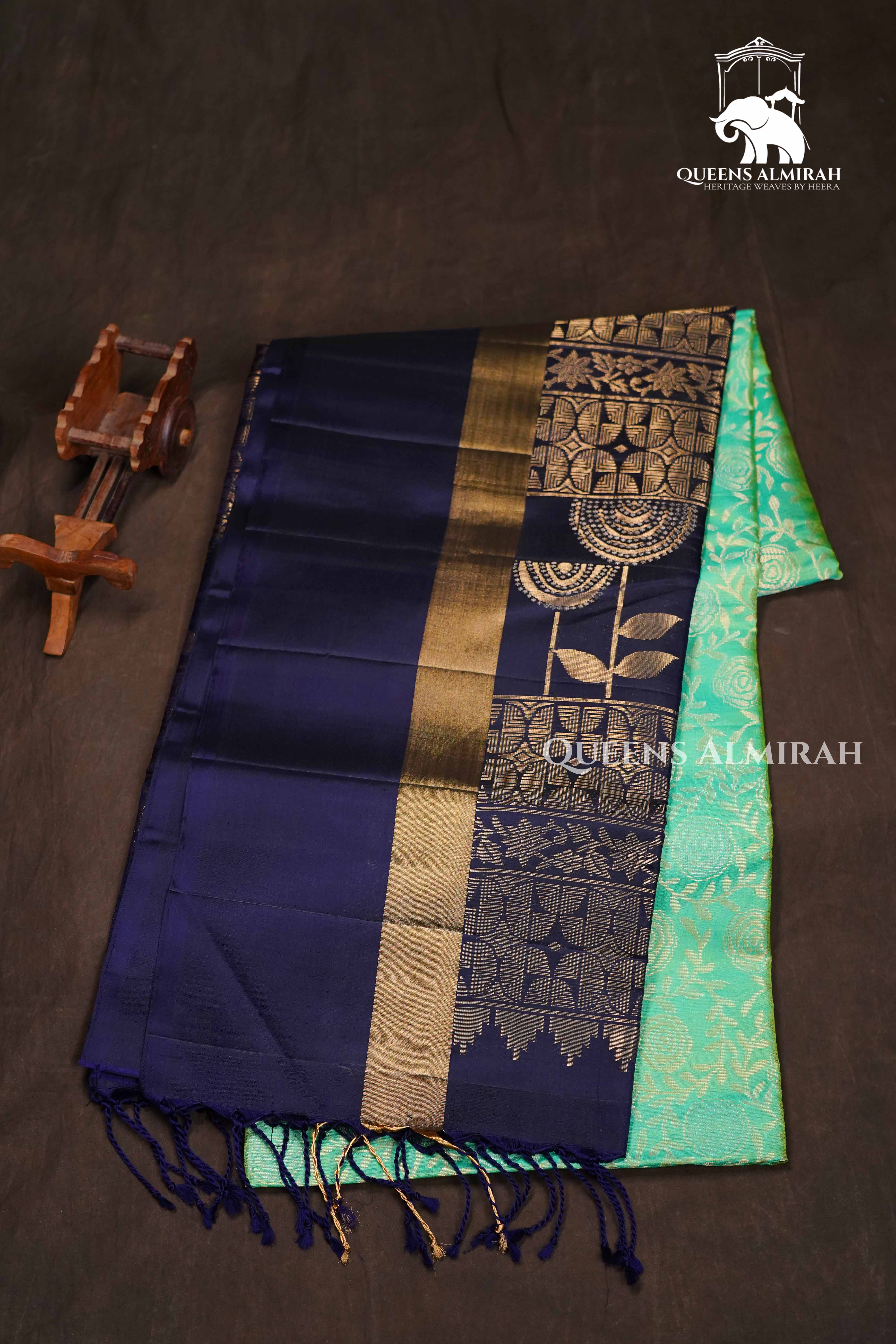 A stunning blend of tradition and elegance, this soft silk saree features a mint green body adorned with intricate floral zari motifs. The rich navy blue border and pallu are highlighted with classic gold zari weaving, creating a striking contrast that elevates its regal charm. Perfect for weddings, festivals, and grand occasions.