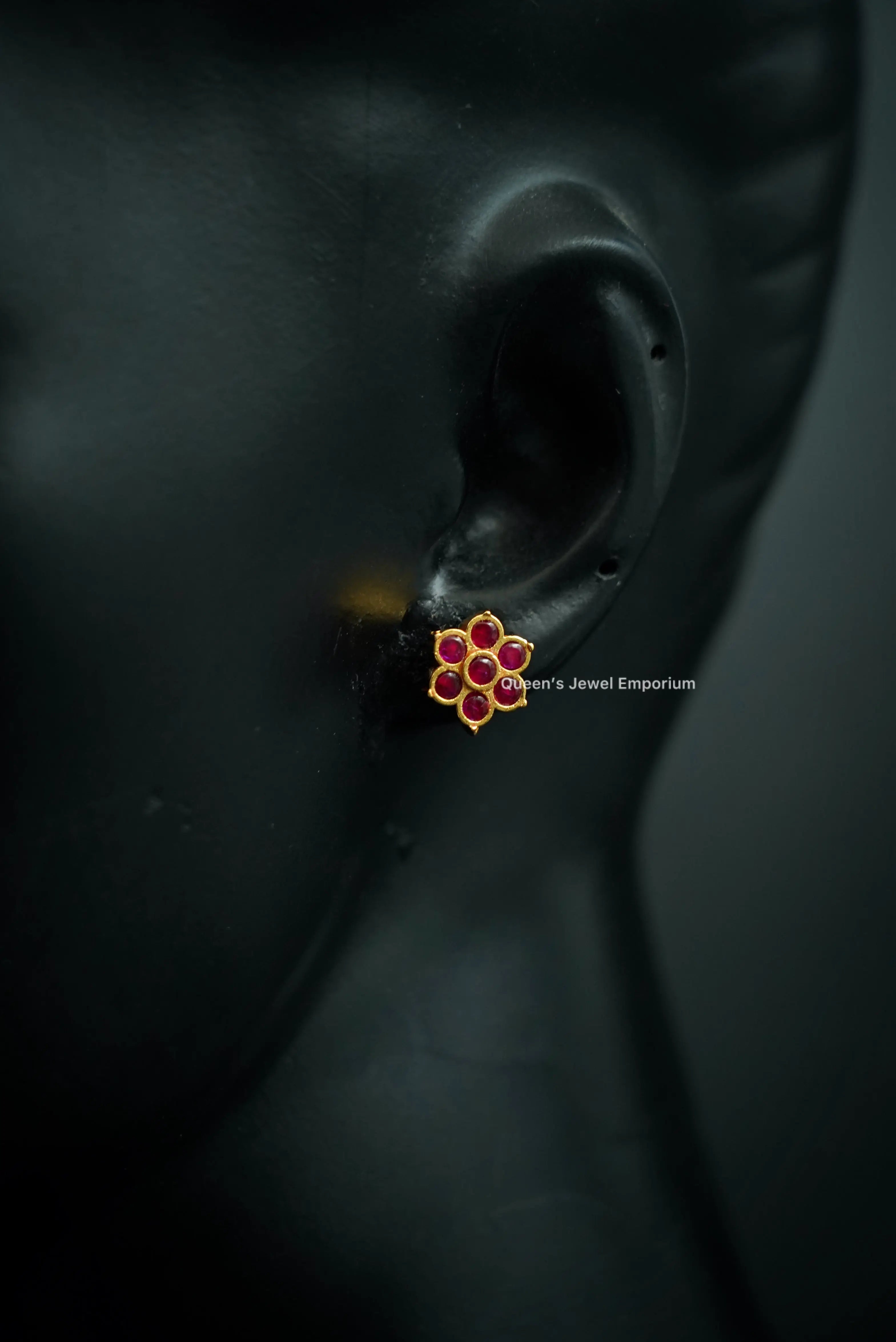 Exquisitely made with 24CT gold-plated silver alloy and utilizing various layers of gold sheet forming process. These stylish studs boast a timeless floral pattern with stunning ruby-red gemstones. A perfect choice for formal occasions and traditional attire. From the renowned Queen’s Jewel Emporium collection.