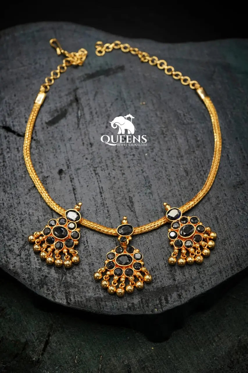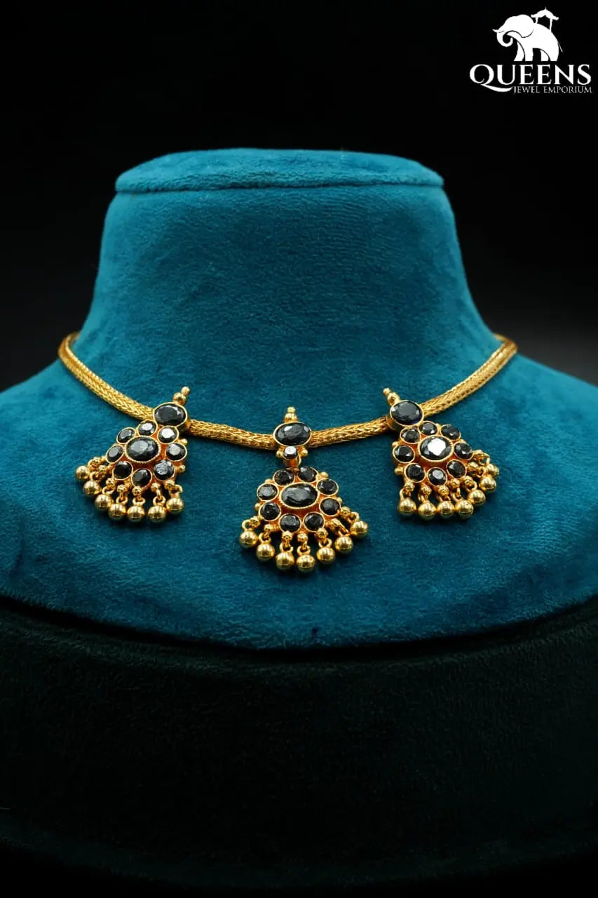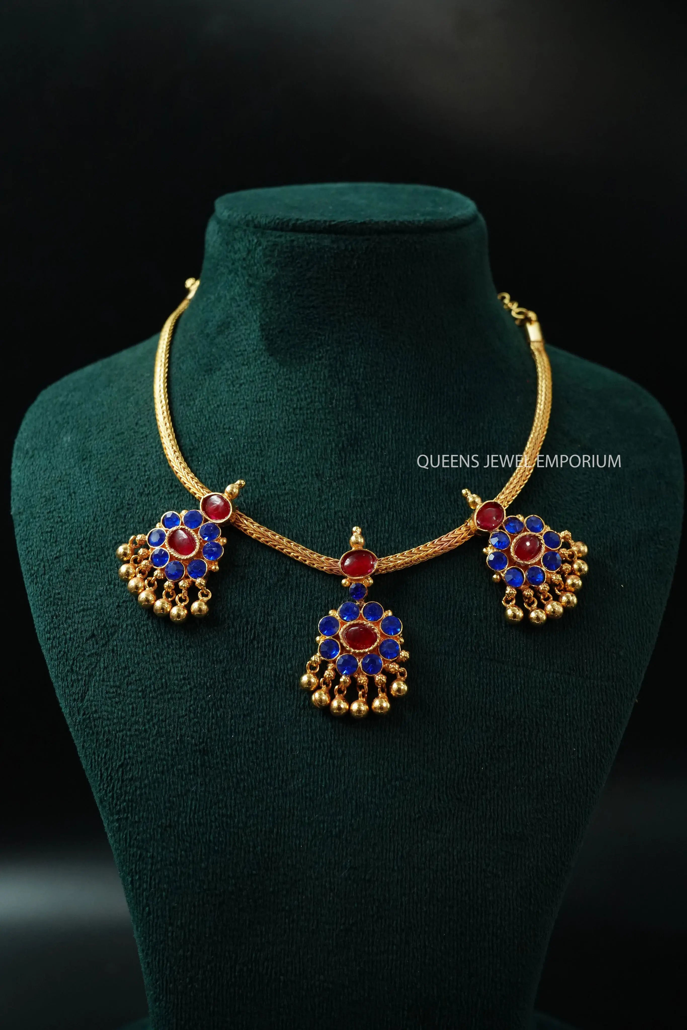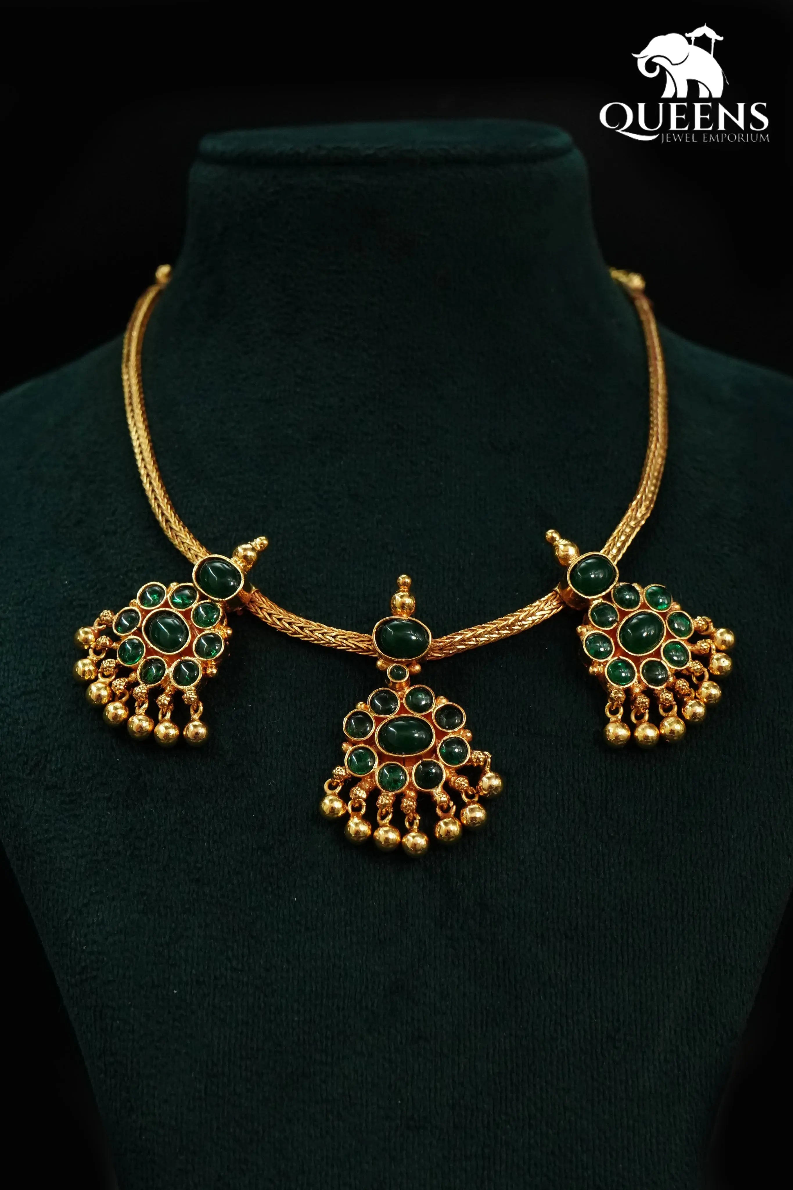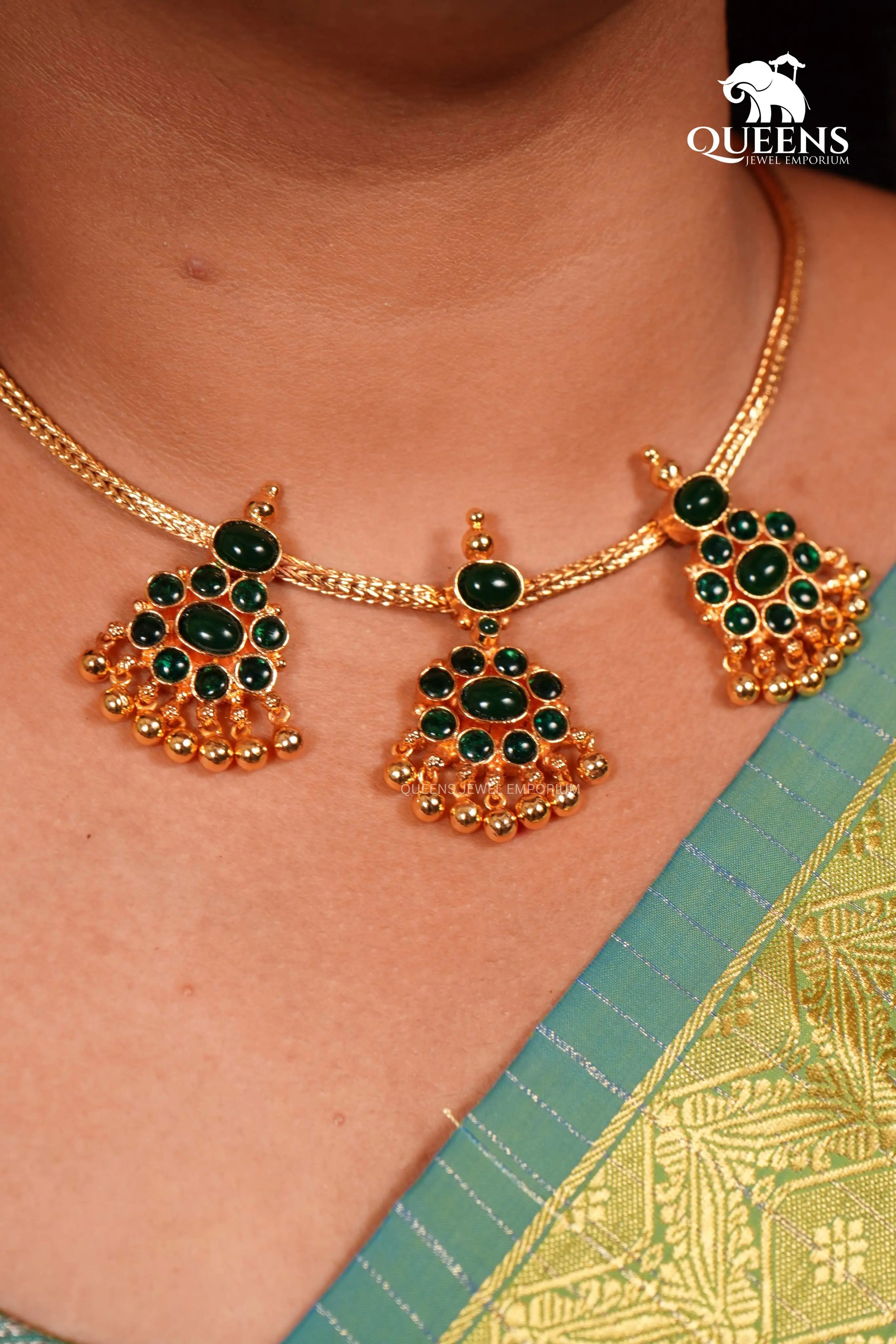 Moonu Pathakam Adigai , a beautifully crafted South Indian traditional jewellery piece. This Necklace is adorned with stunning Kemp and Zircon stones, giving it a gold-like appearance. Suitable for all ages, this design is inspired by olden day Ravi Varma paintings. Red kemp , Green kemp and Zircon stones.