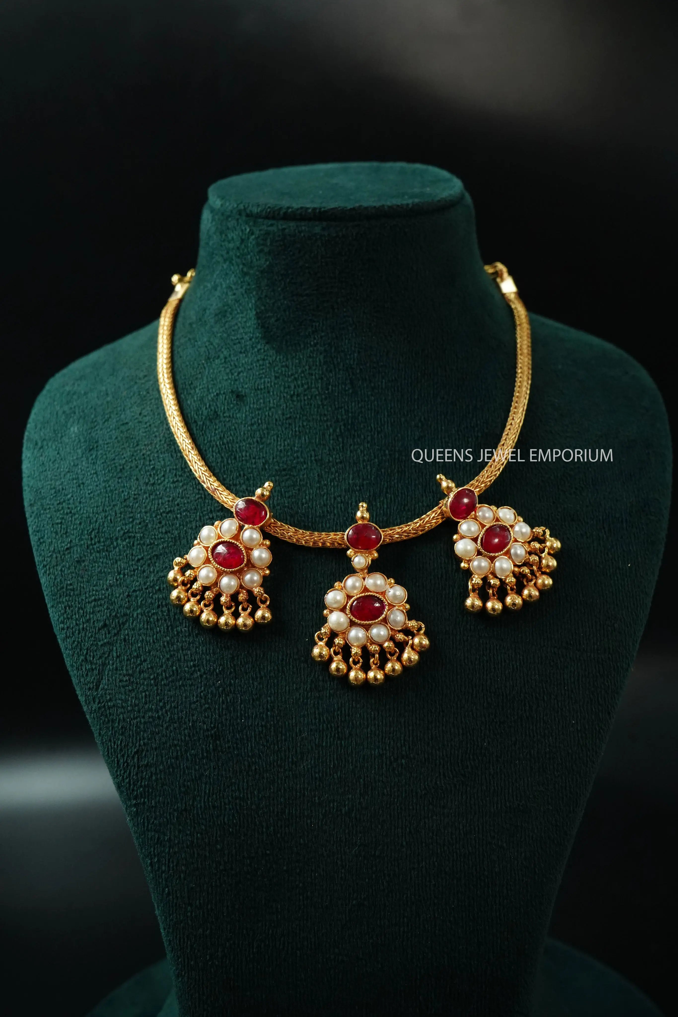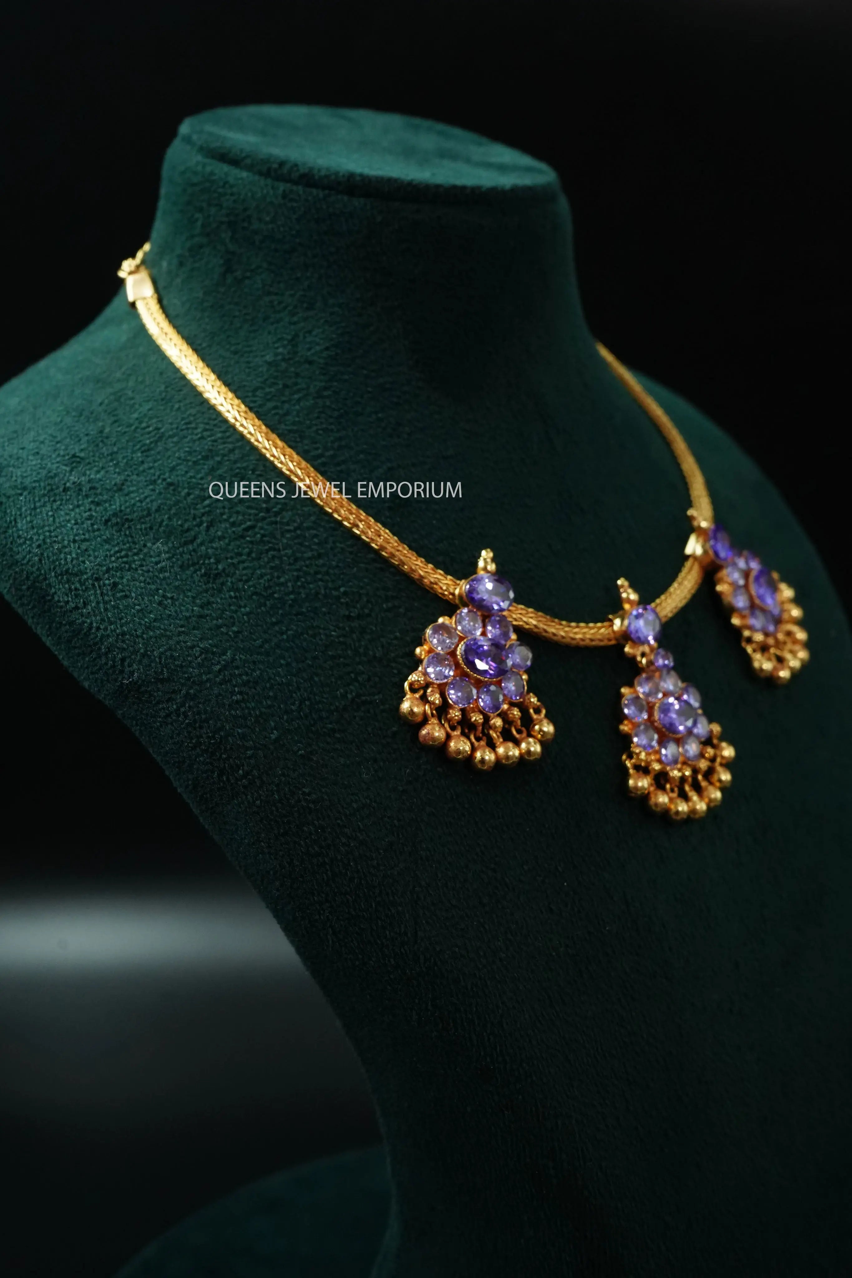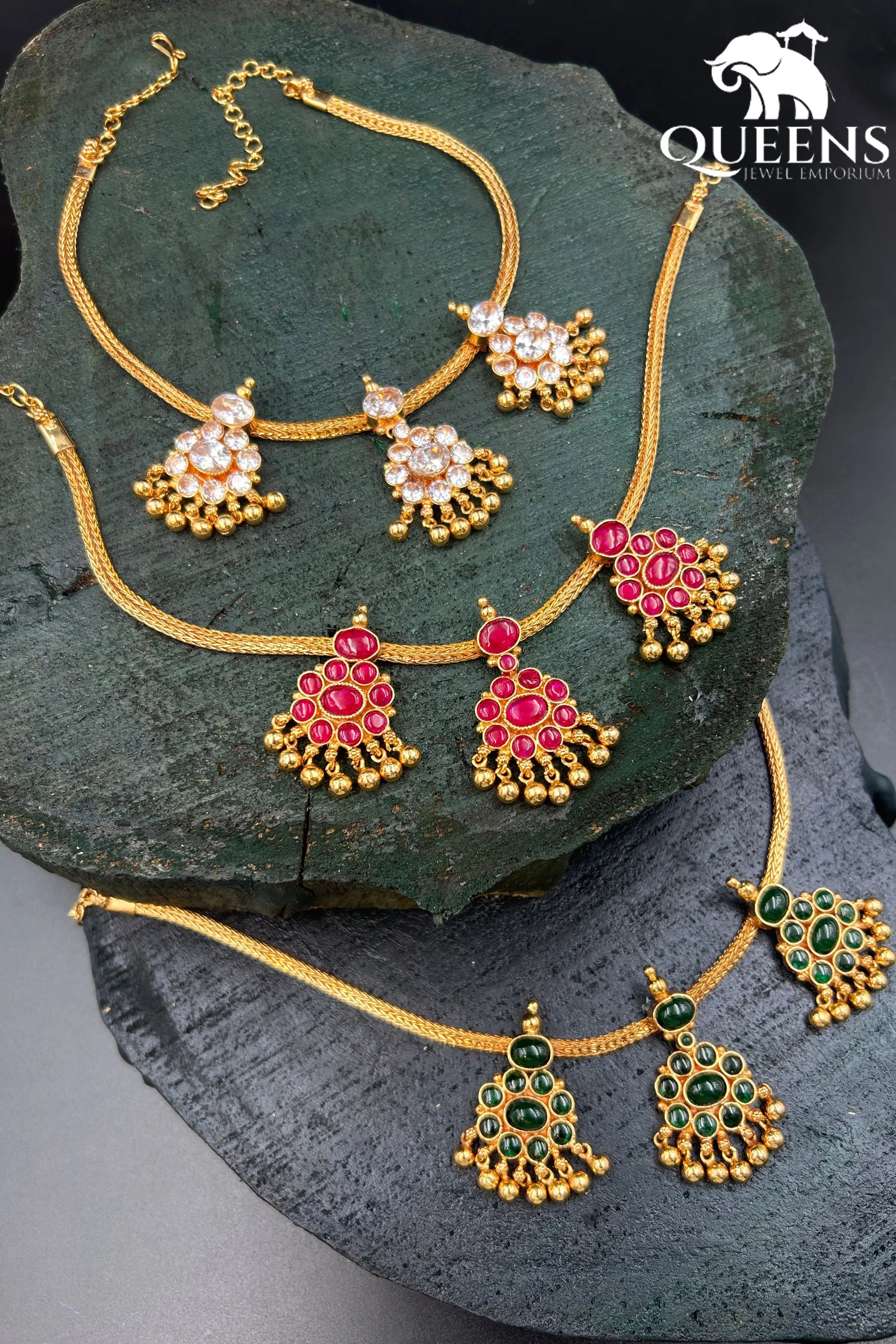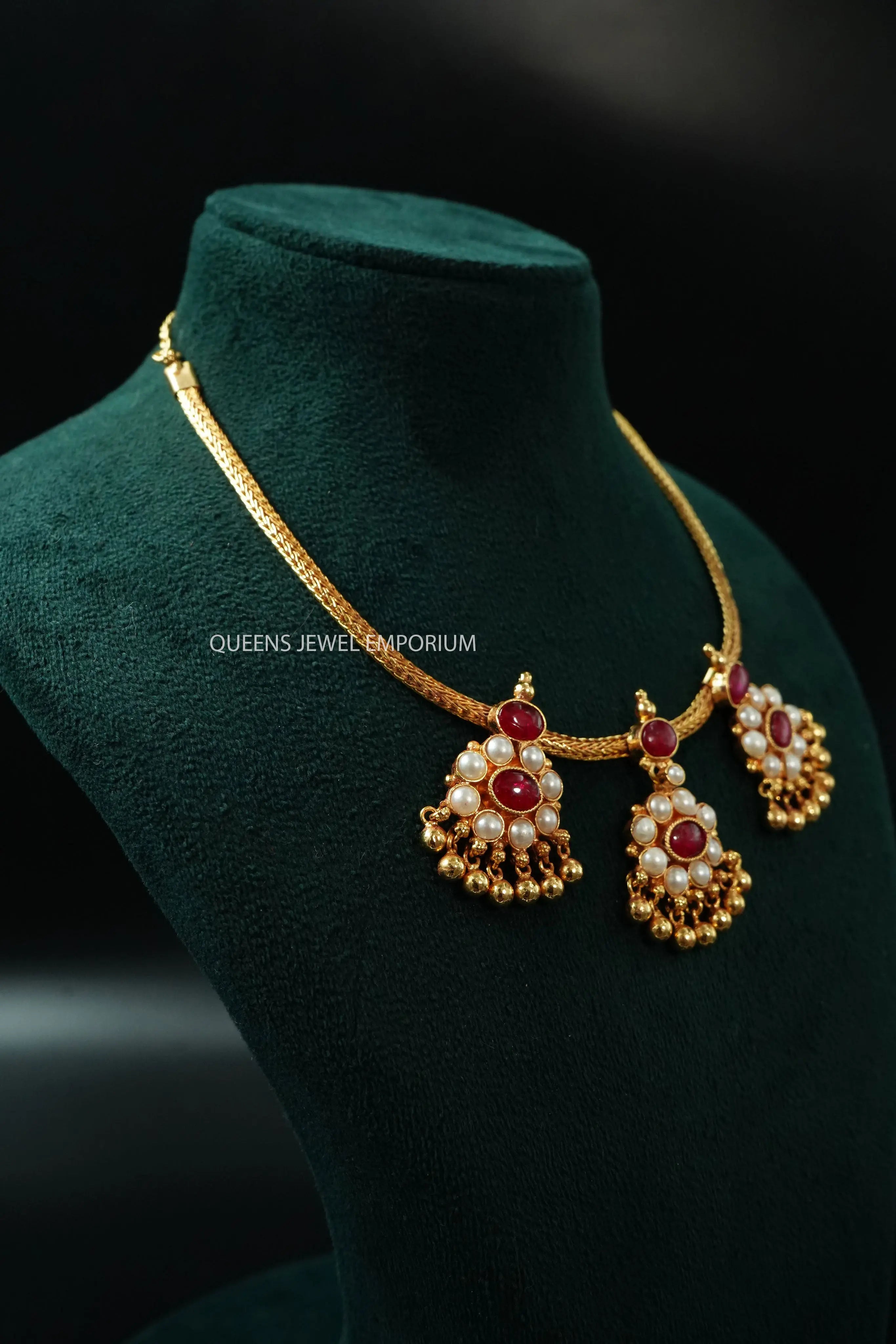 Moonu Pathakam Adigai , a beautifully crafted South Indian traditional jewellery piece. This Necklace is adorned with stunning Kemp and Zircon stones, giving it a gold-like appearance. Suitable for all ages, this design is inspired by olden day Ravi Varma paintings. Red kemp , Green kemp and Zircon stones.