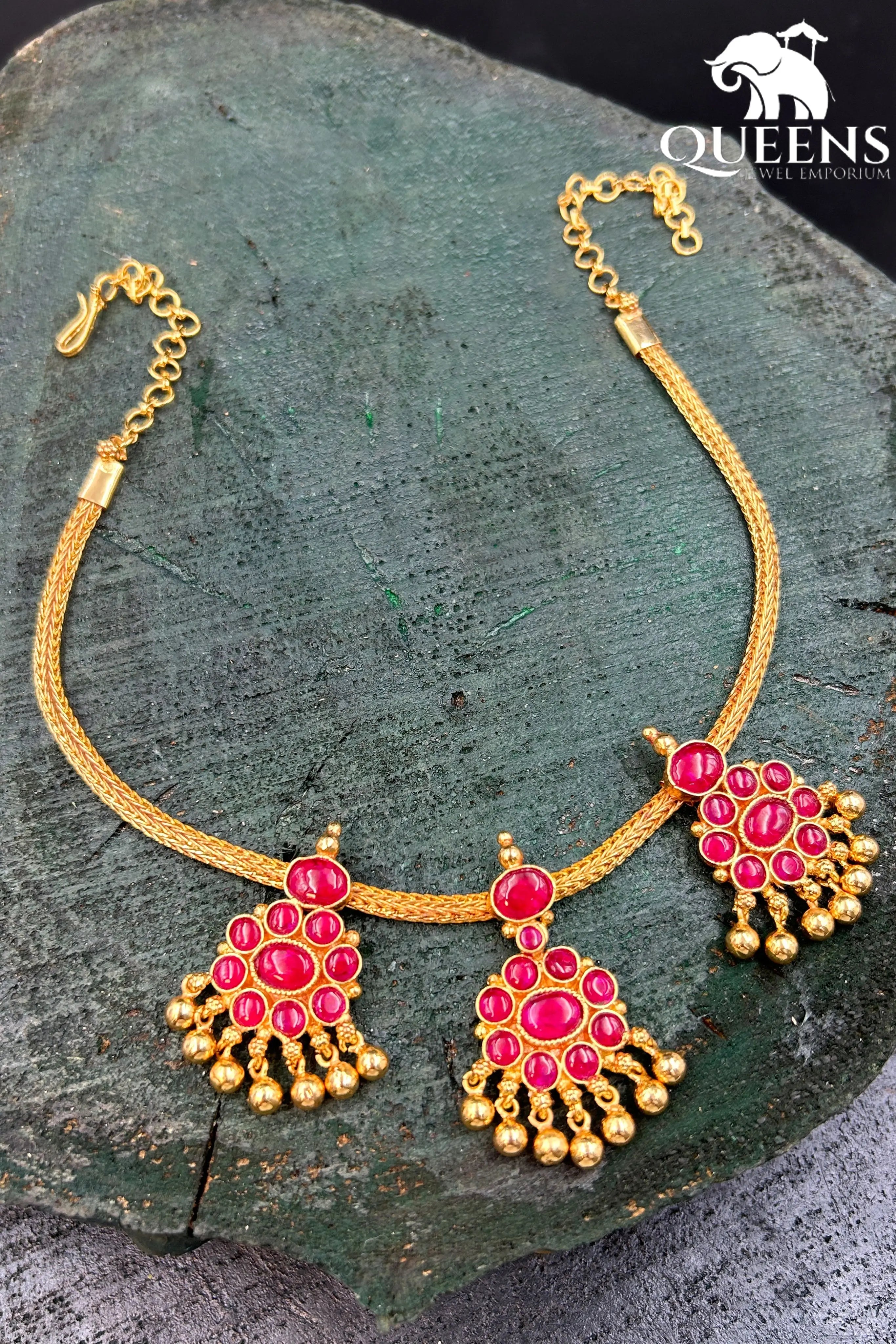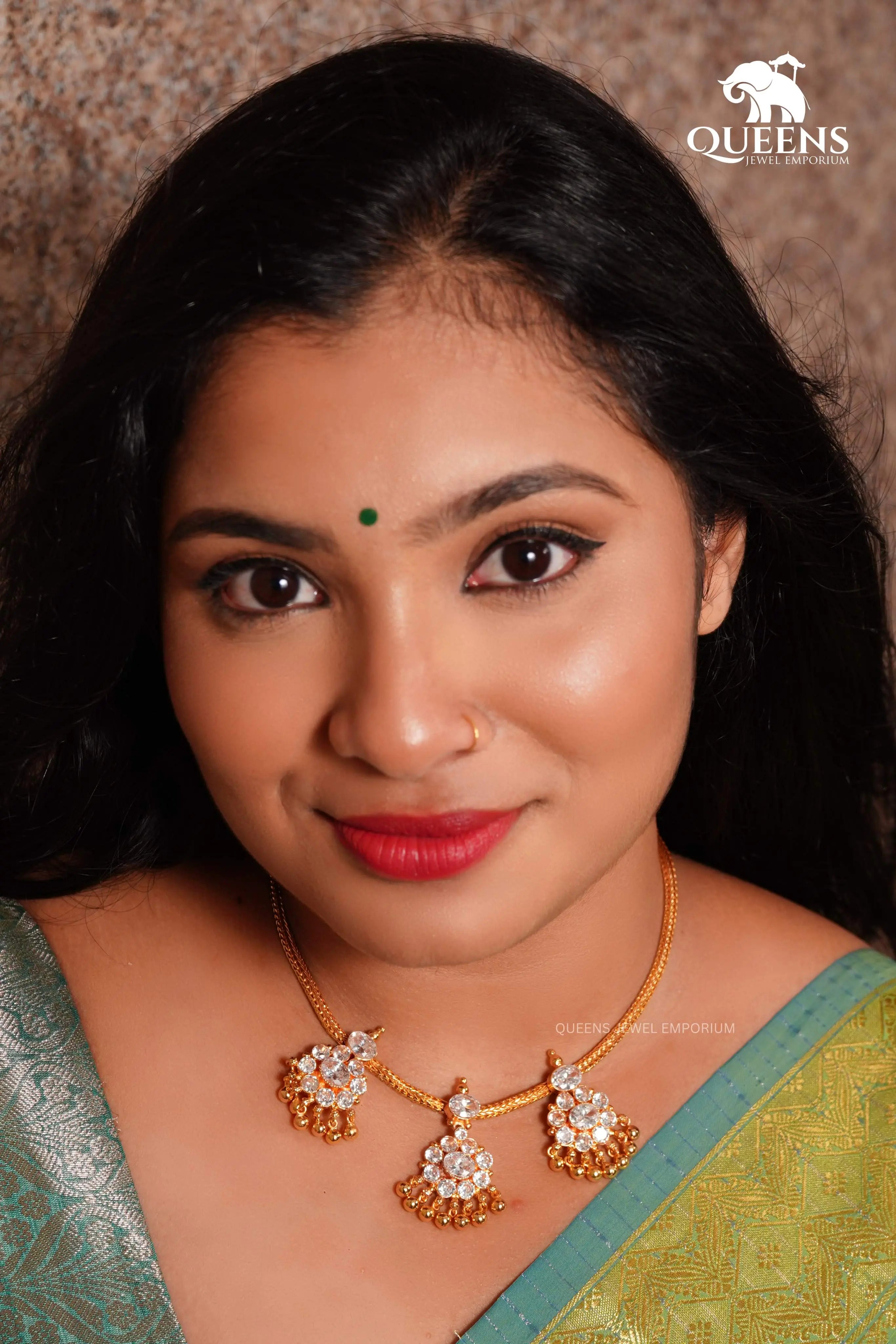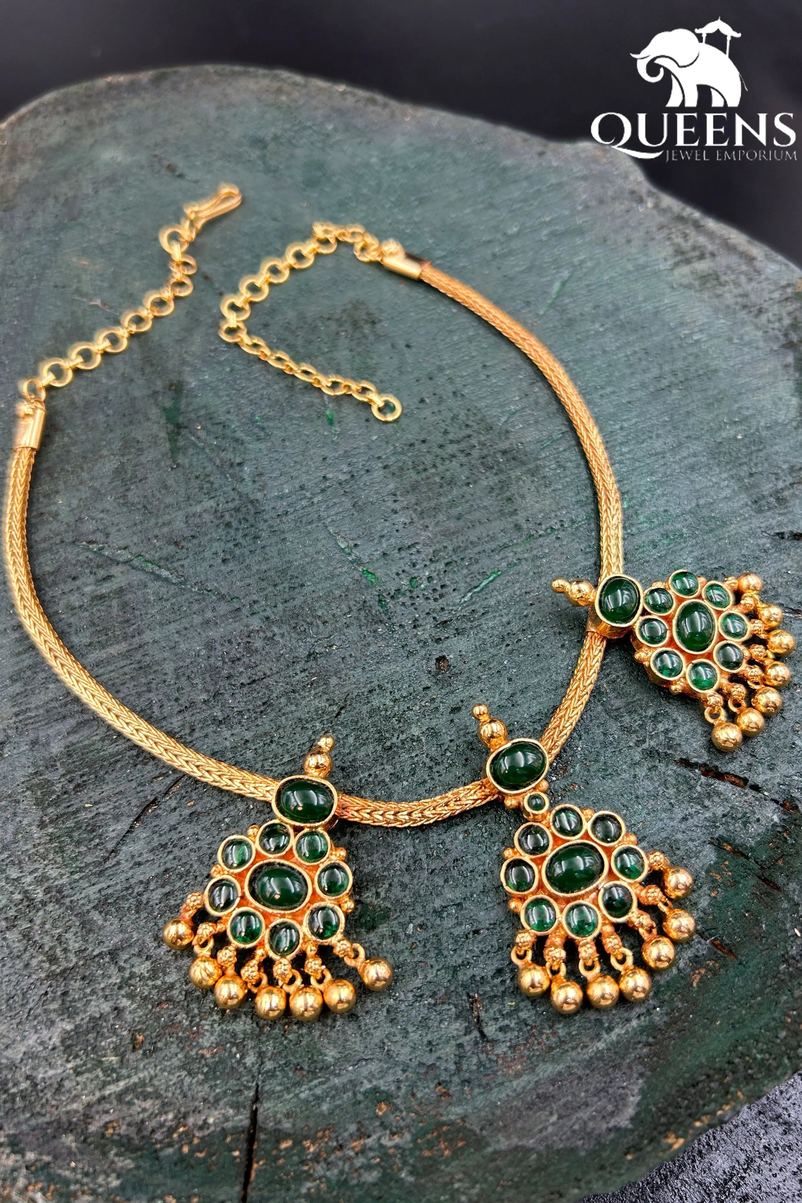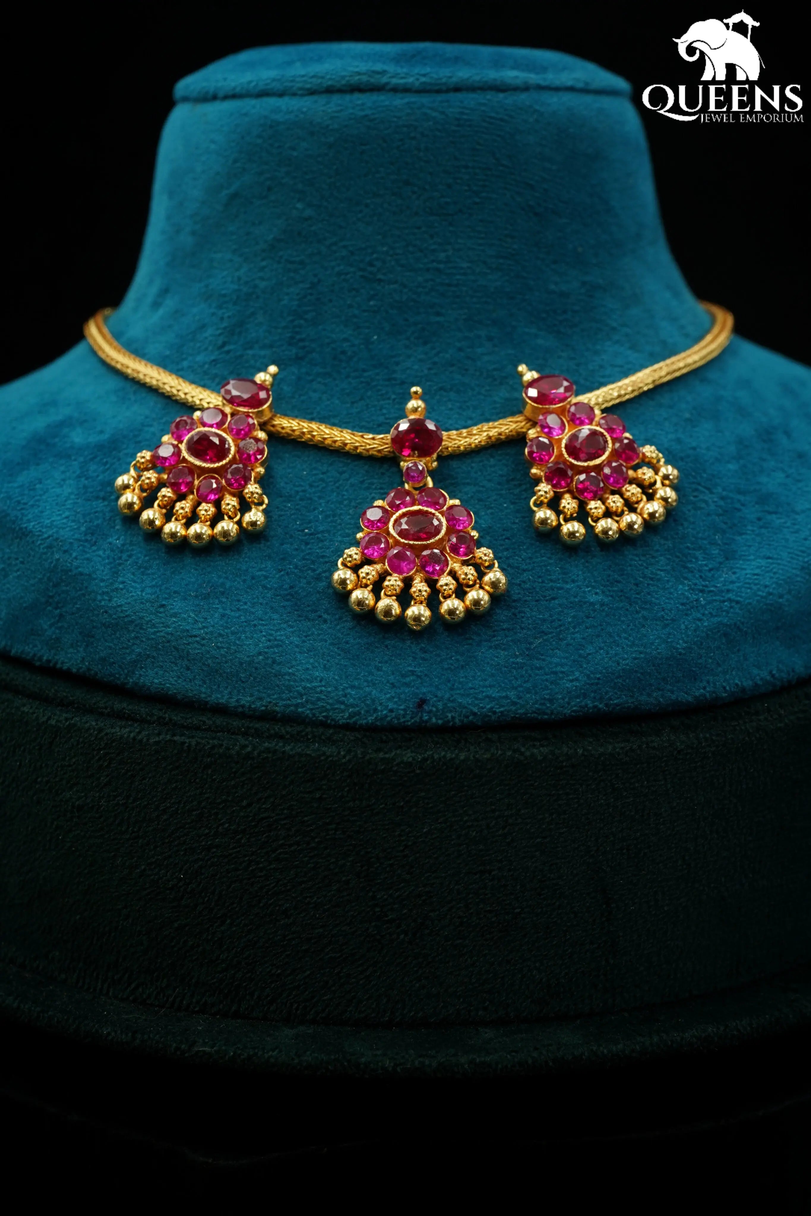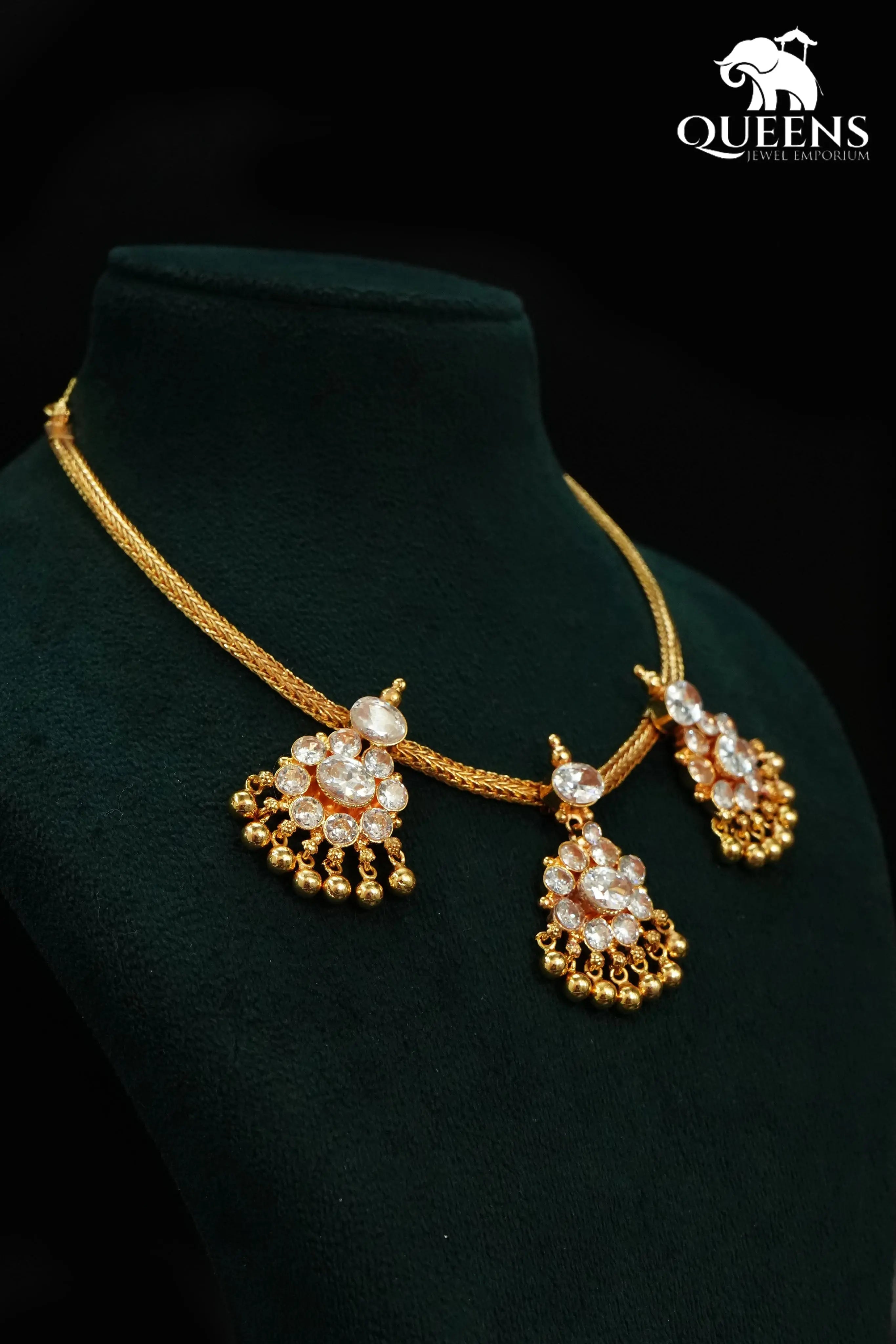 Moonu Pathakam Adigai , a beautifully crafted South Indian traditional jewellery piece. This Necklace is adorned with stunning Kemp and Zircon stones, giving it a gold-like appearance. Suitable for all ages, this design is inspired by olden day Ravi Varma paintings. Red kemp , Green kemp and Zircon stones.