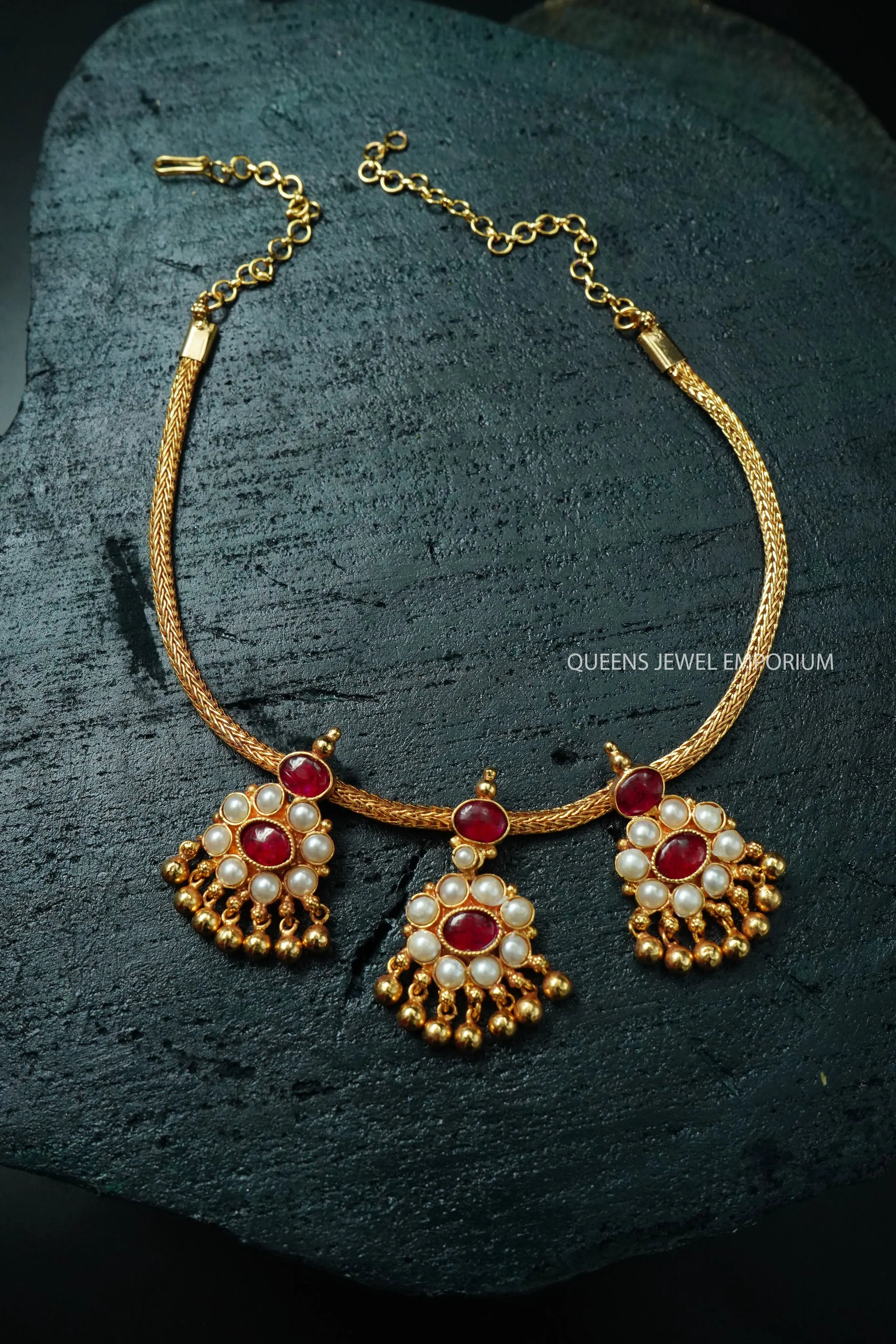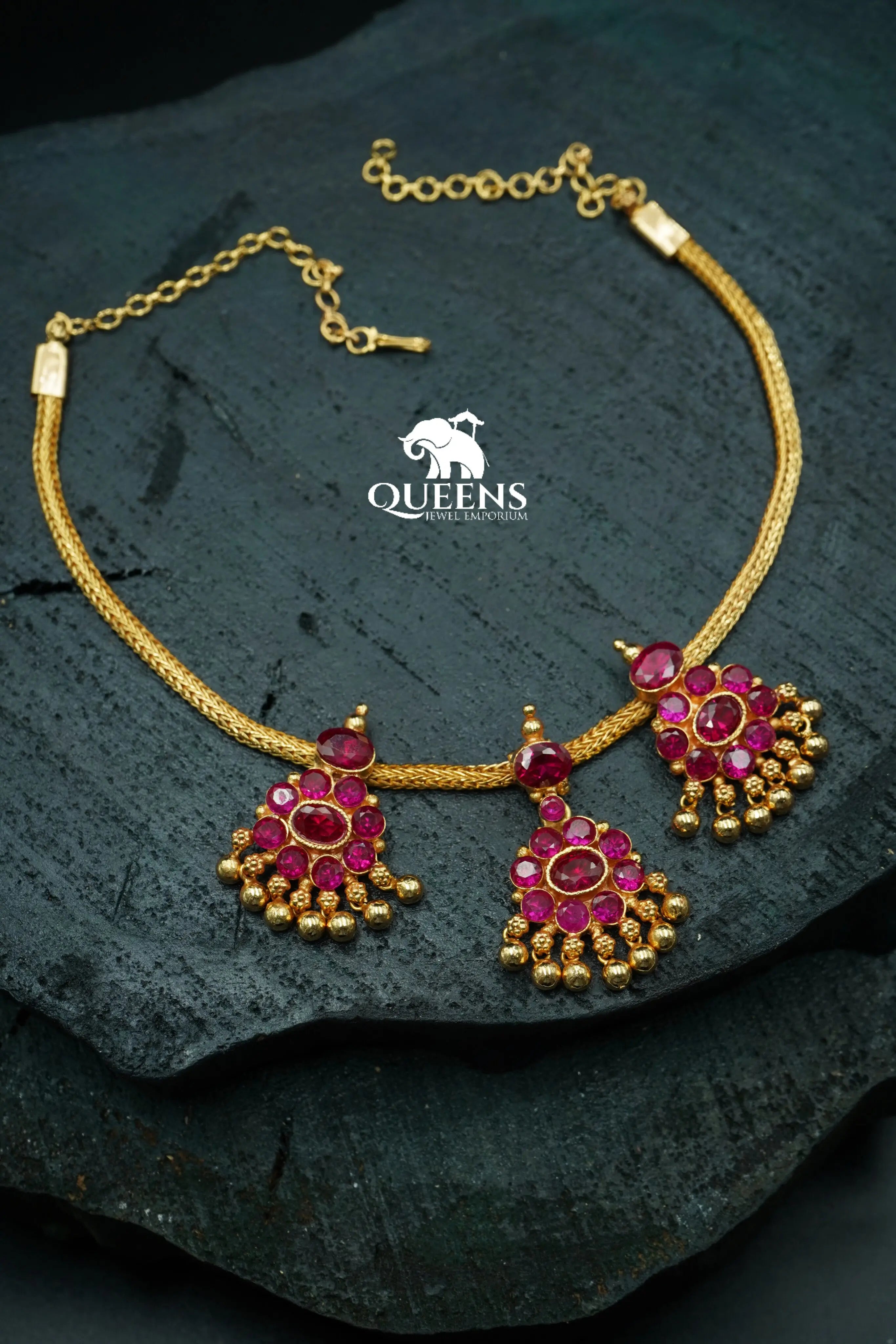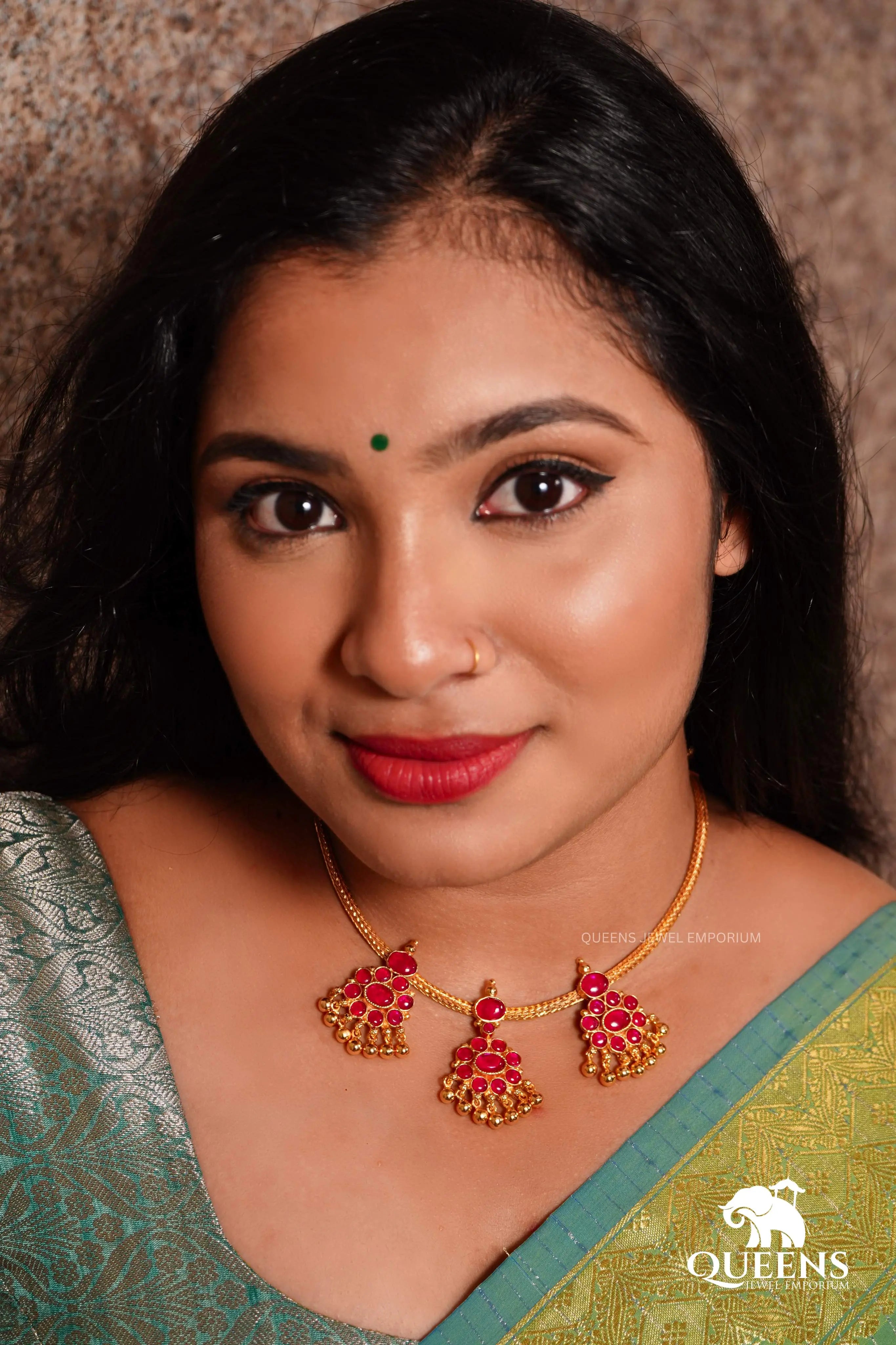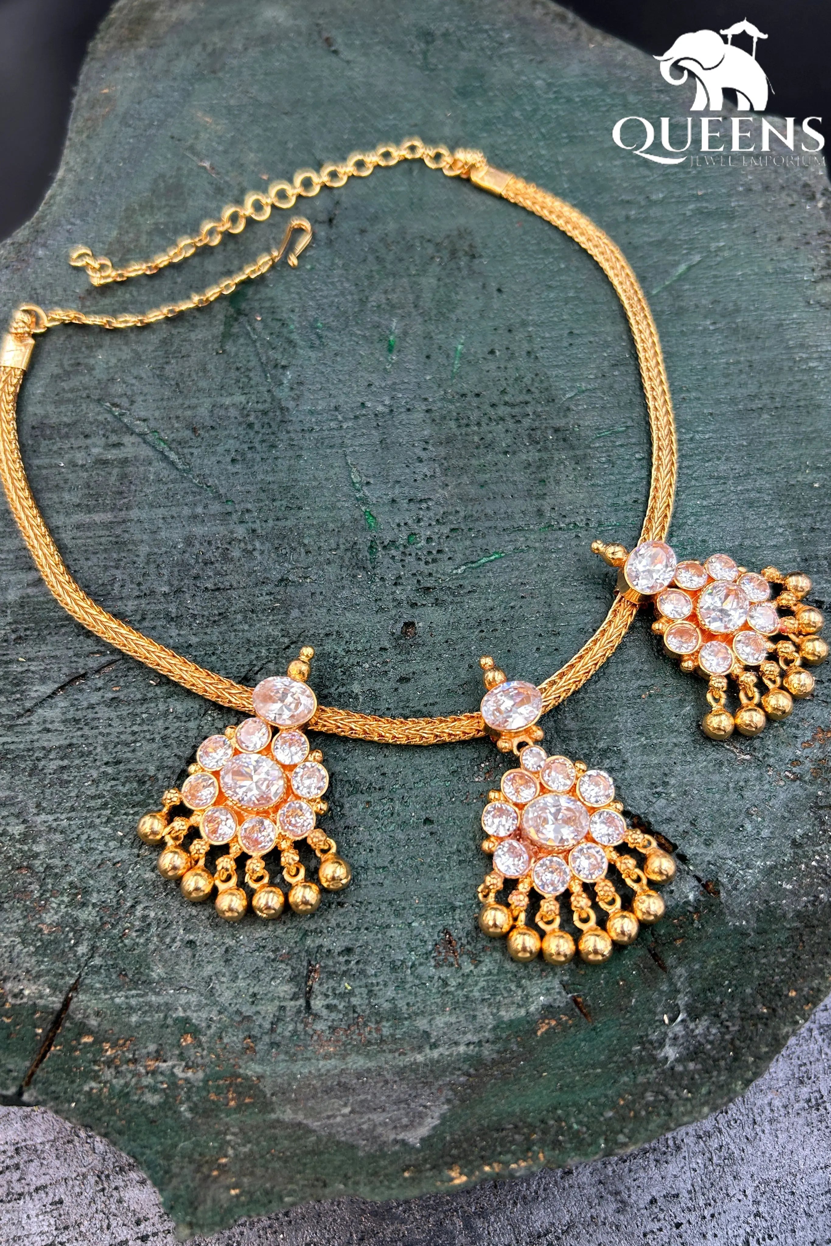 Moonu Pathakam Adigai , a beautifully crafted South Indian traditional jewellery piece. This Necklace is adorned with stunning Kemp and Zircon stones, giving it a gold-like appearance. Suitable for all ages, this design is inspired by olden day Ravi Varma paintings. Red kemp , Green kemp and Zircon stones.