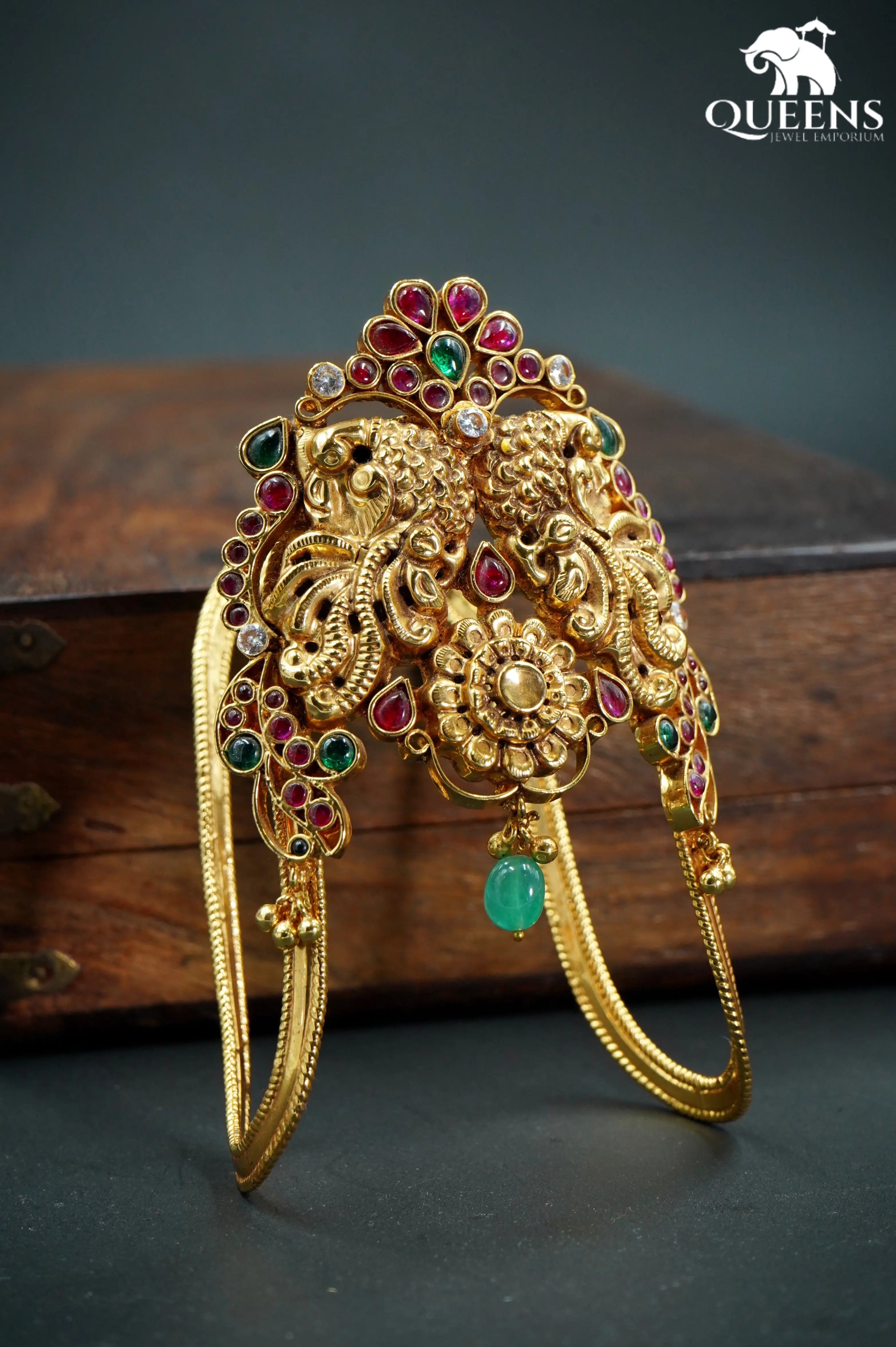 This captivating nagas neli vanki, a traditional South Indian vanki, melds cultural heritage with modern design sensibilities. Crafted from high-quality, gold-plated silver alloy, it offers a compelling blend of affordability and enduring beauty. The vibrant kemp stones and a graceful peacock design adorned with green beads create a truly enchanting piece