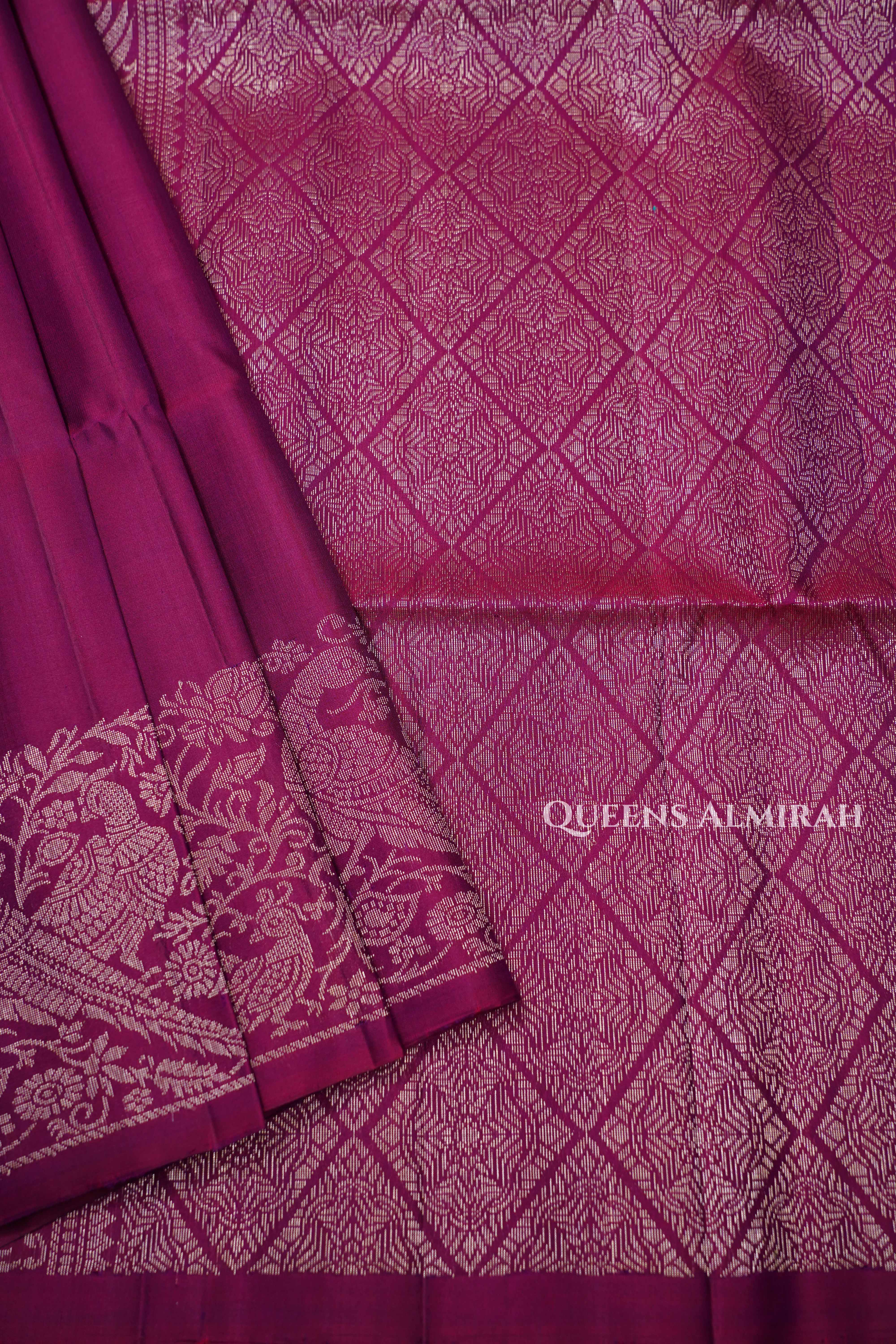 "Exude timeless elegance with this deep Mulberry Purple Kanchivaram soft Silk Saree, intricately woven with silver zari in traditional floral and checkered patterns. The rich pallu adds grandeur, making it a perfect choice for weddings, festive occasions, and regal celebrations."