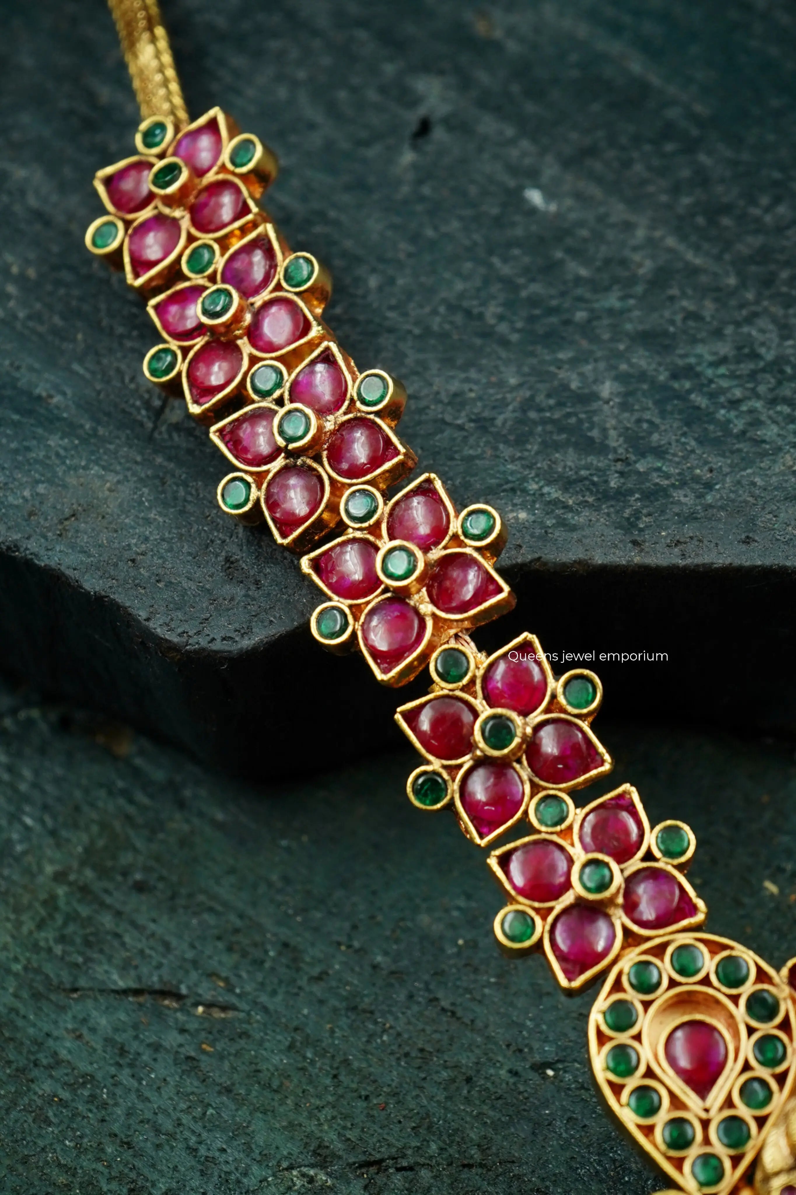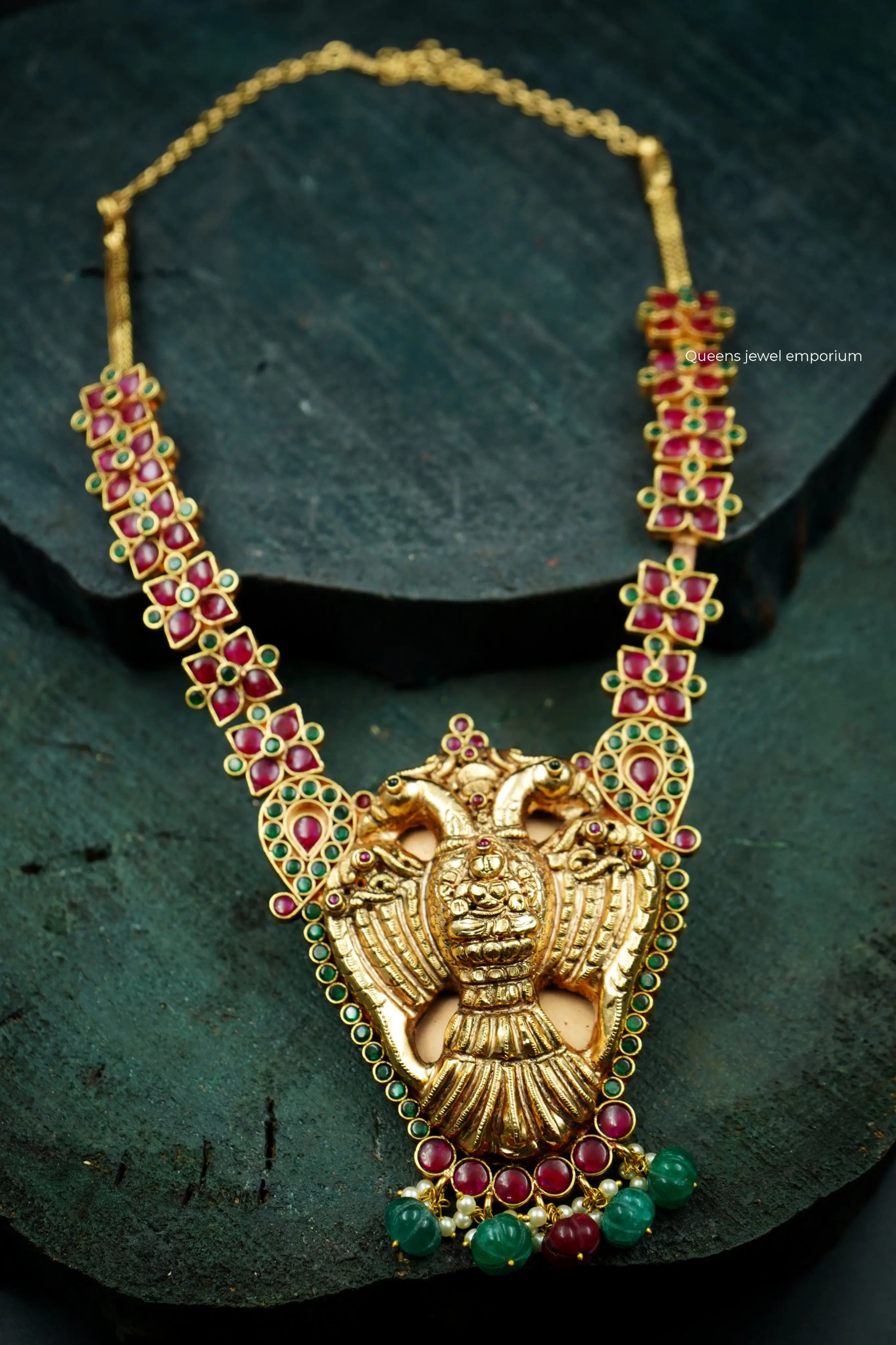 Immerse yourself in ancient inspired frome Chola dynasty (8th-12th century AD) temple dancer Discover a one-of-a-kind pendant design with Nagari Nagas Mid Haram.Combining garuda motifs emblished with pink and green kemp stones with green beads hangings, this haram is the perfect fusion of traditional and modern elements. Stand out in any ethnic outfit with this beautiful piece.