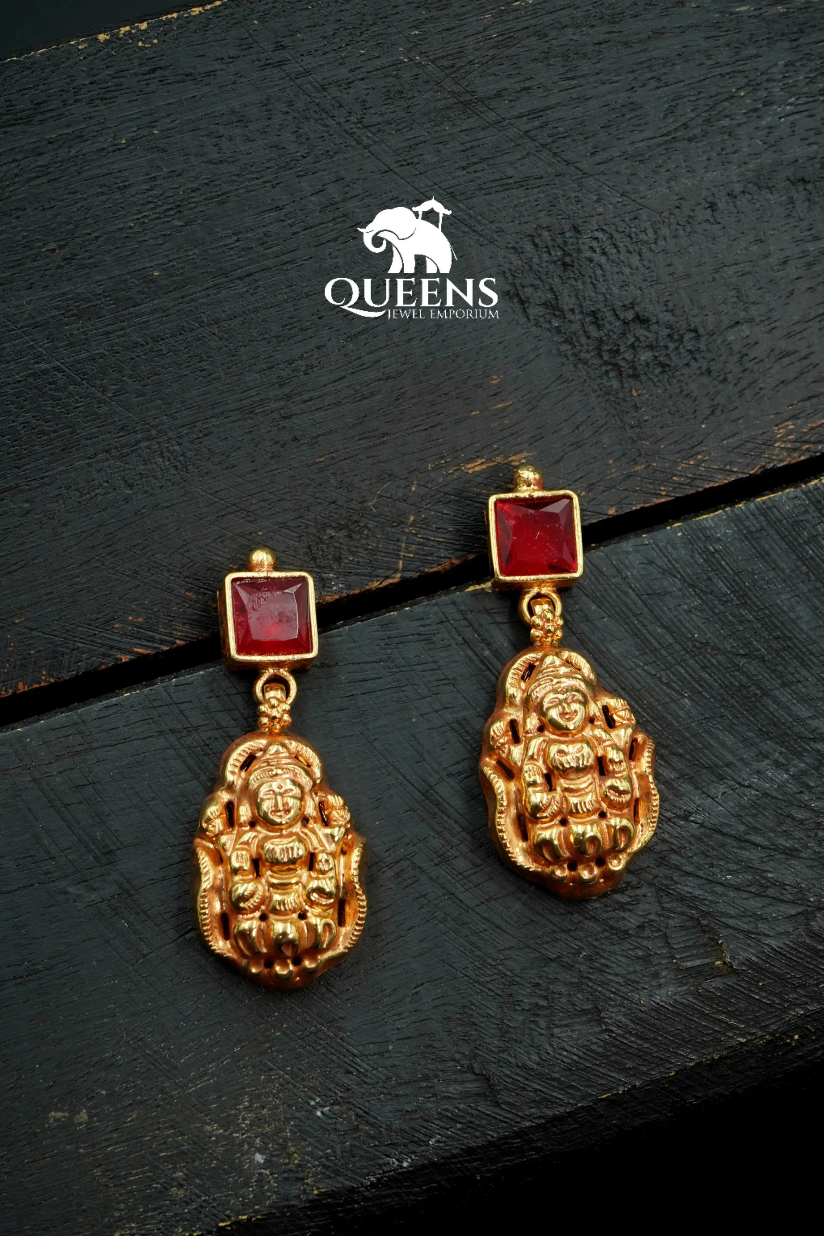 Embrace prosperity and elegance with the Lakshmi Kemp Earrings. These captivating earrings showcase the divine Lakshmi, crafted from vibrant kemp stones (red spinel), showering blessings upon you with every movement.