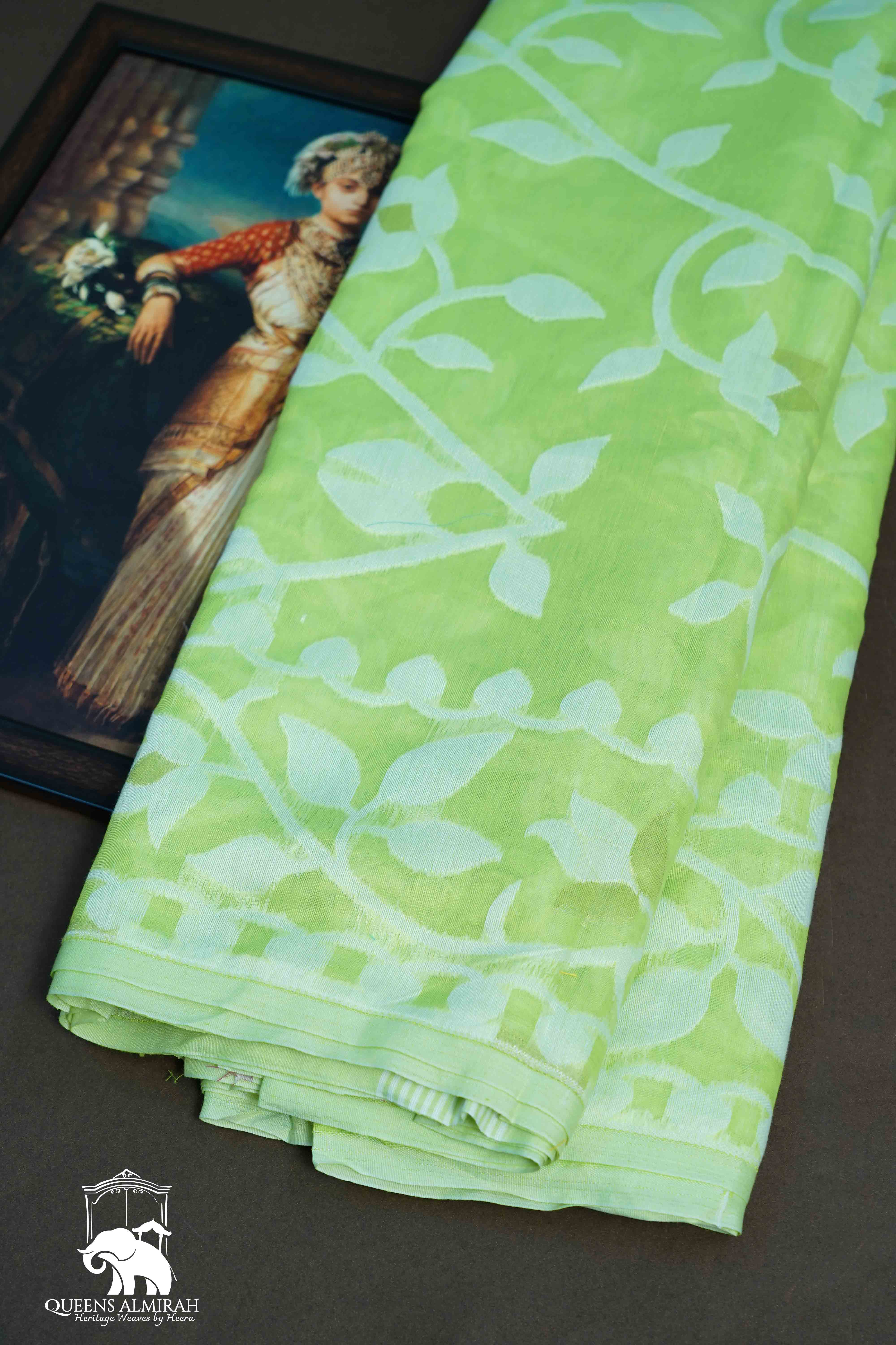 NASTY GREEN JAMDANI COTTON SAREE is the perfect blend of comfort, softness, and style. Handwoven with intricate leaf and flower motifs, it offers versatility for any occasion. Made with high-quality cotton, it provides durability and ease of wear, making it ideal for any weather.