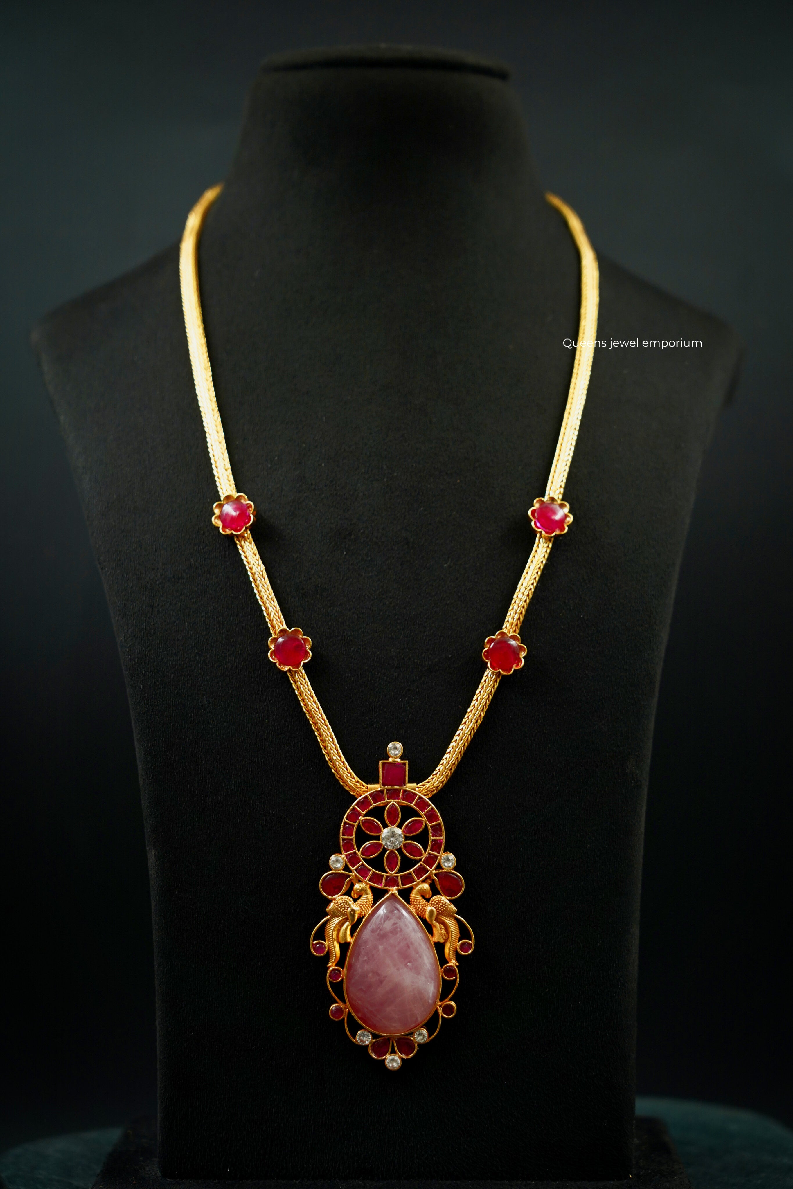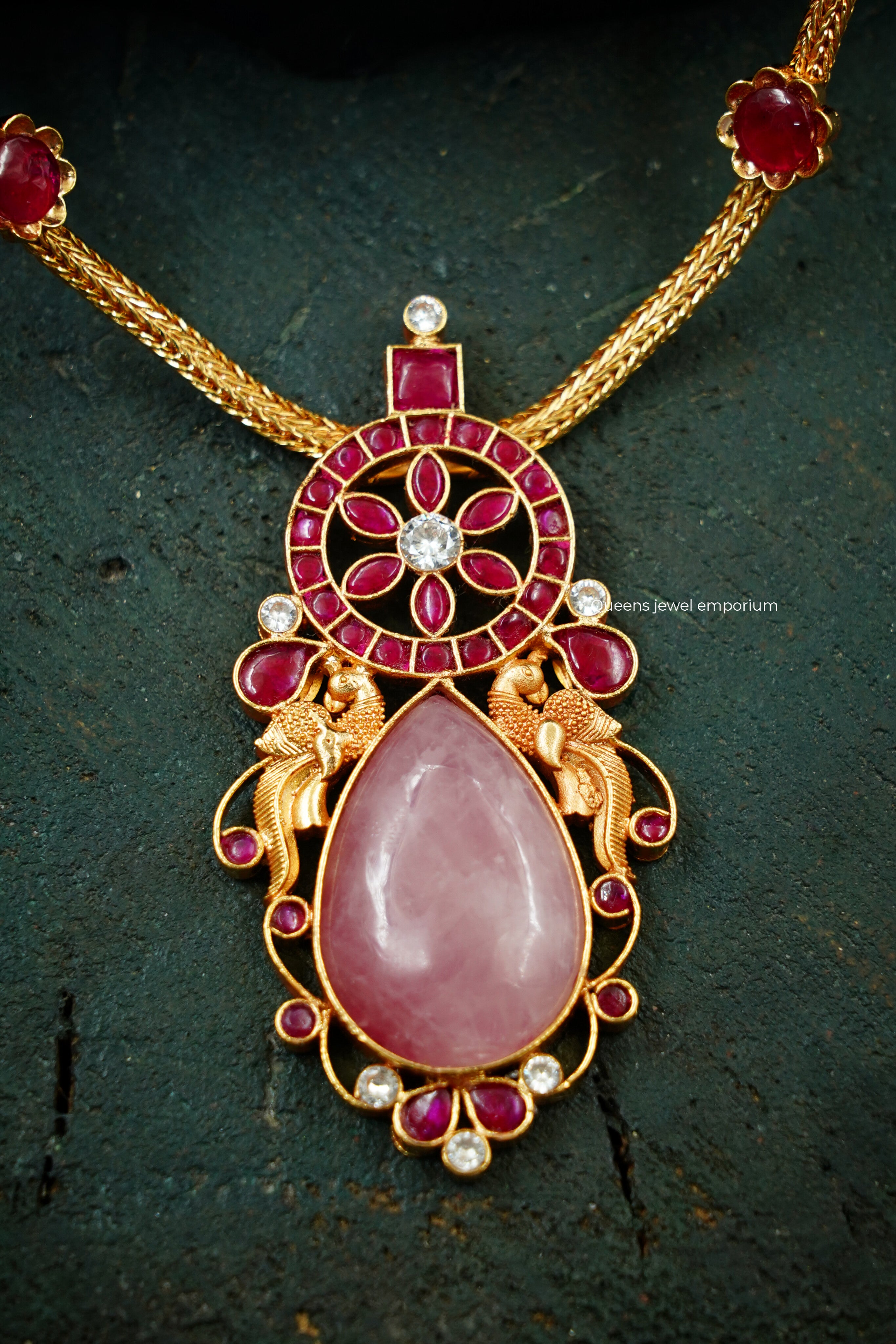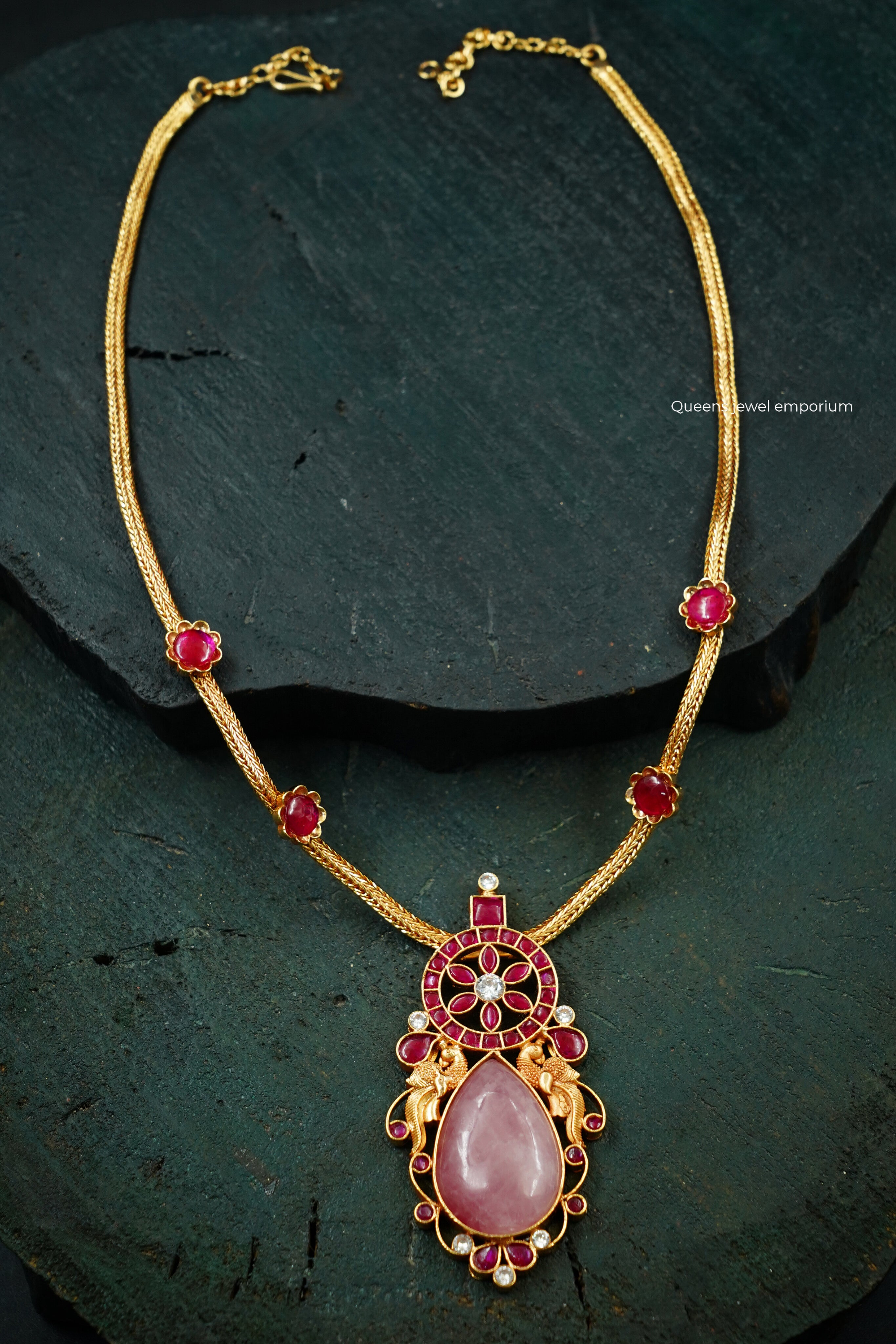 This necklace showcases a chakra-inspired center with a delicate floral design with kemp stone, paired with a thilakam-shaped rose quartz drop and two nagas kizhi motifs. Perfect for festive attire, it blends traditional artistry with refined elegance—handcrafted by Queens Jewel Emporium.