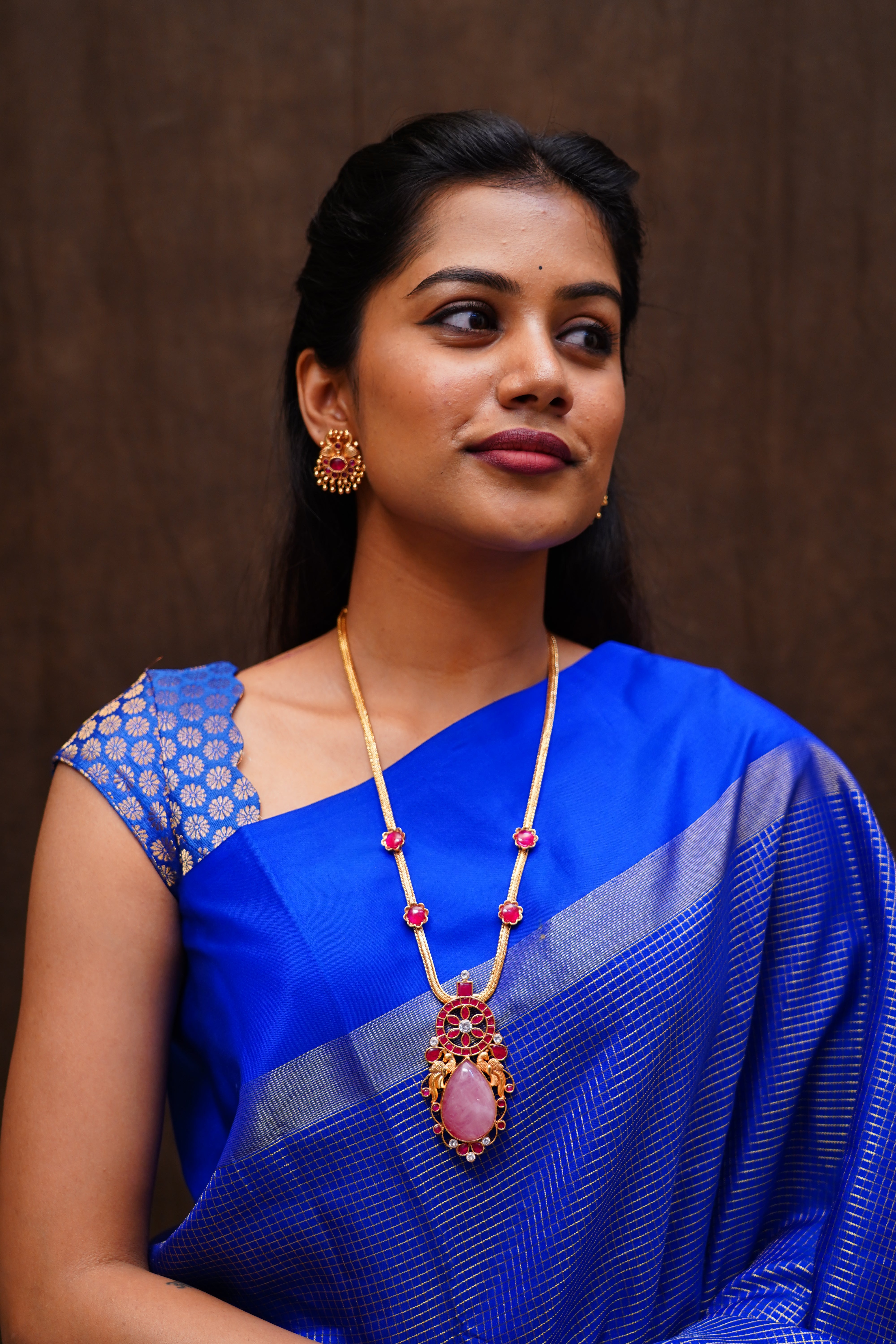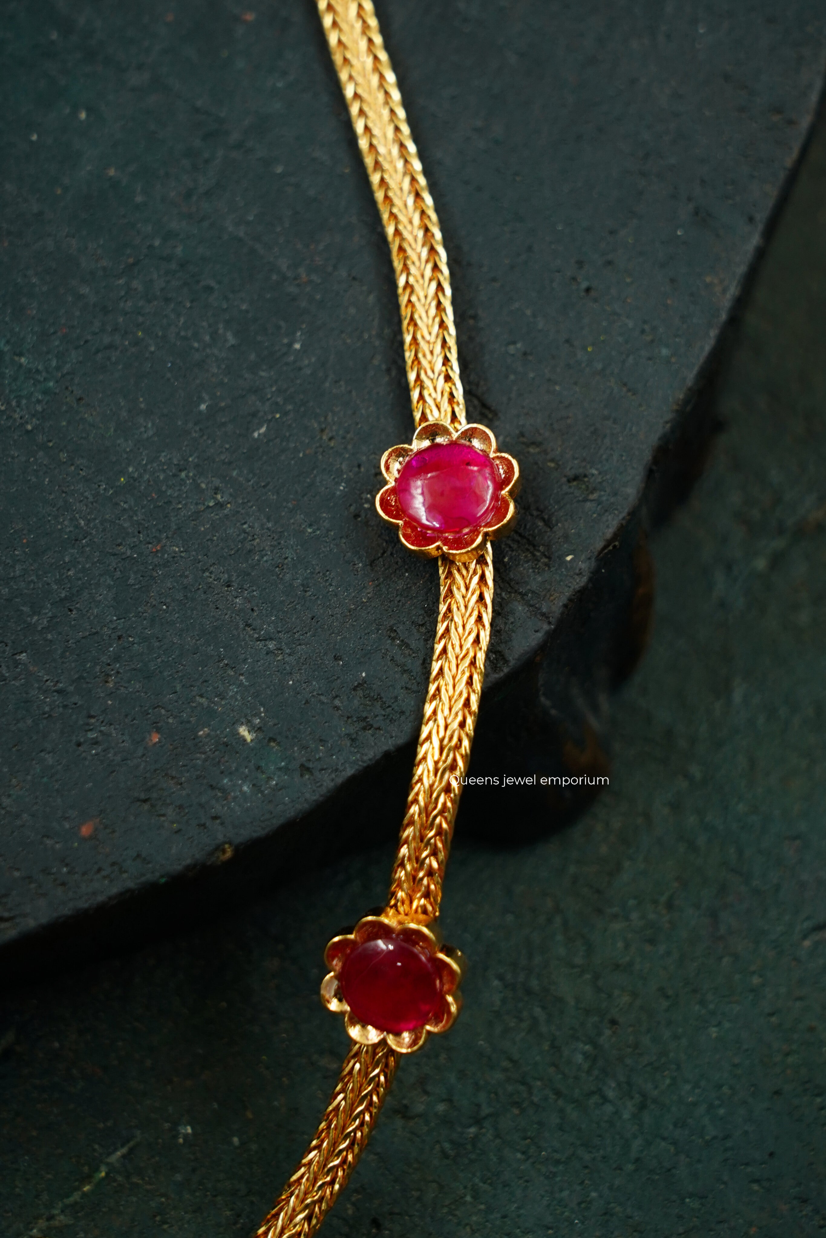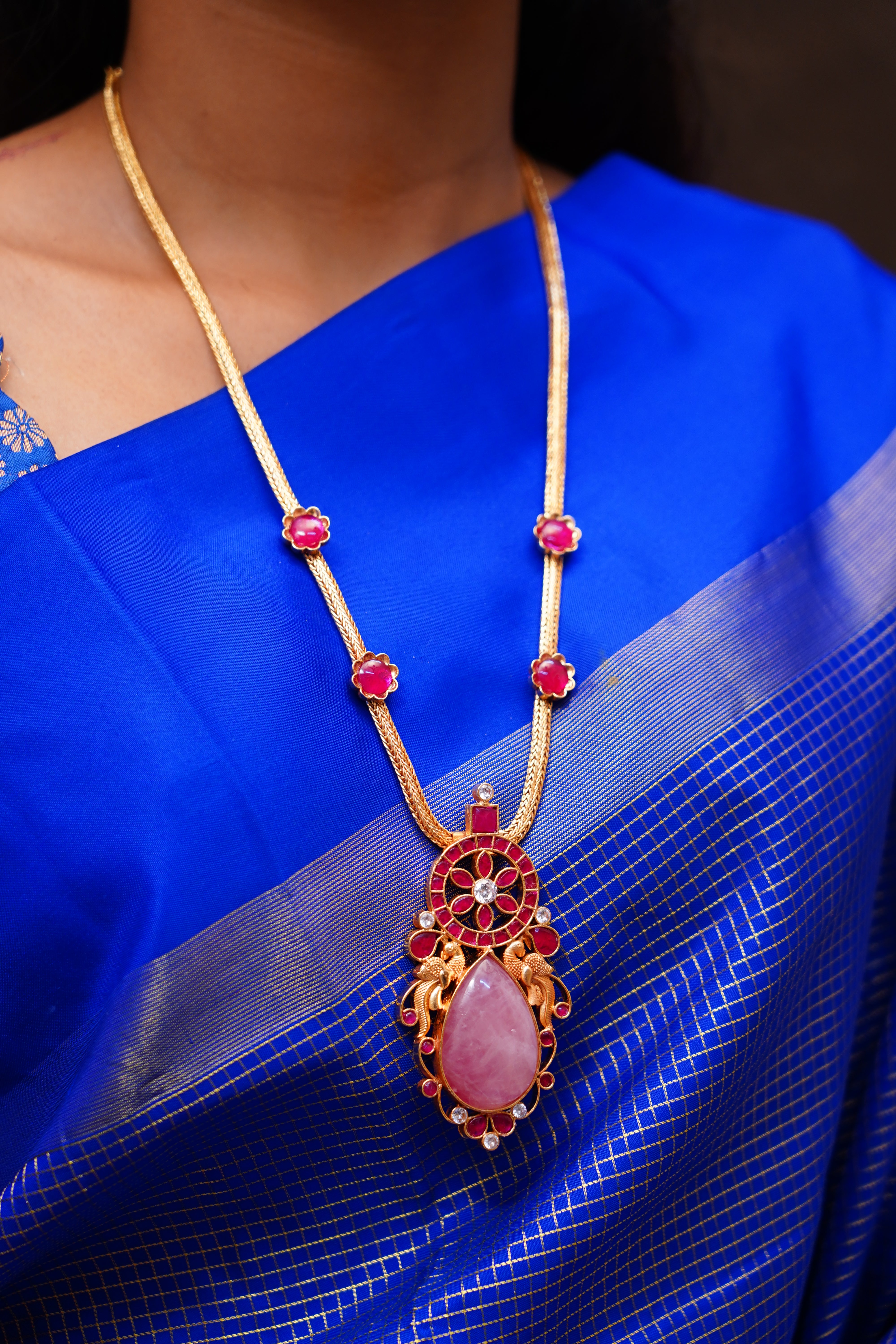 This necklace showcases a chakra-inspired center with a delicate floral design with kemp stone, paired with a thilakam-shaped rose quartz drop and two nagas kizhi motifs. Perfect for festive attire, it blends traditional artistry with refined elegance—handcrafted by Queens Jewel Emporium.