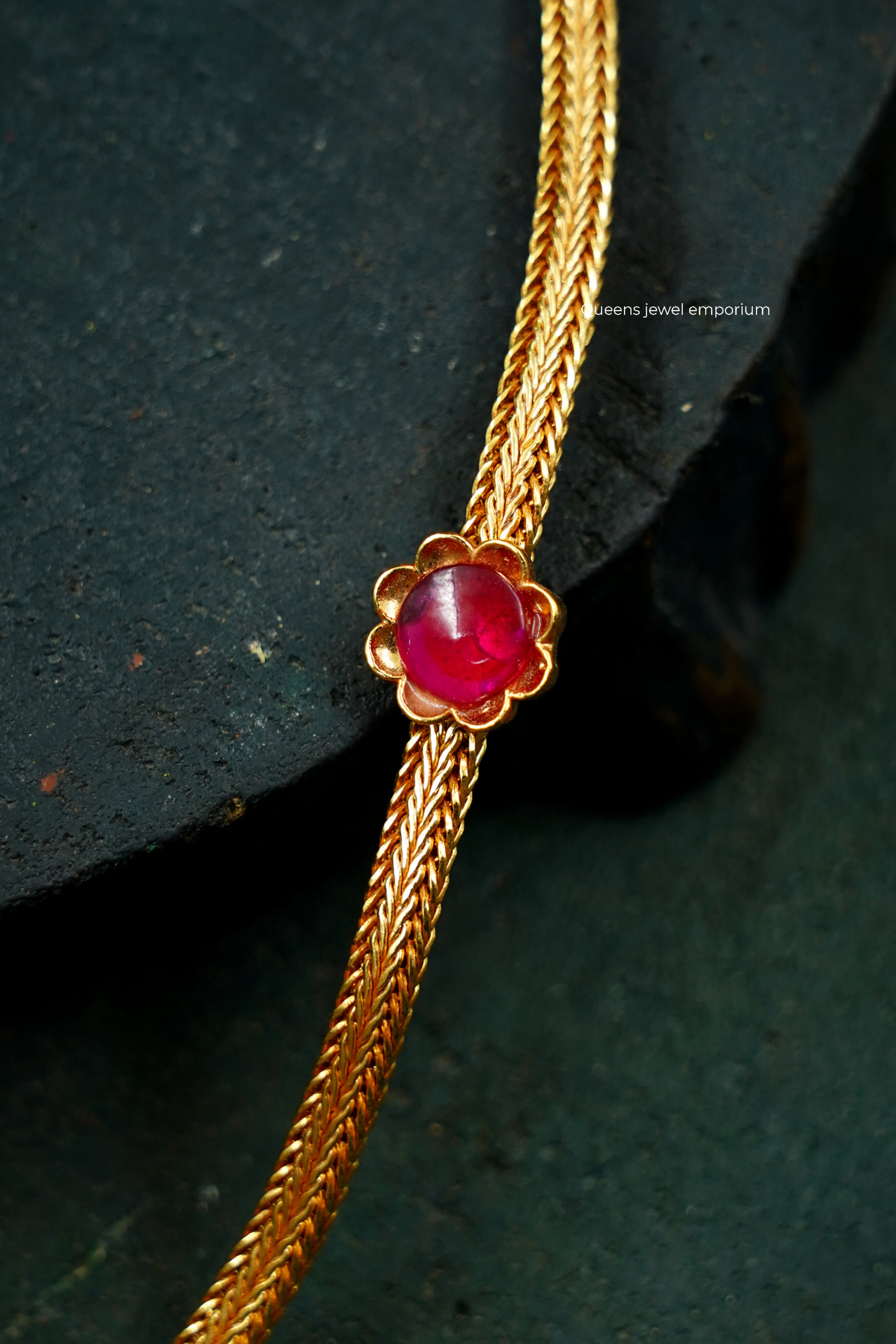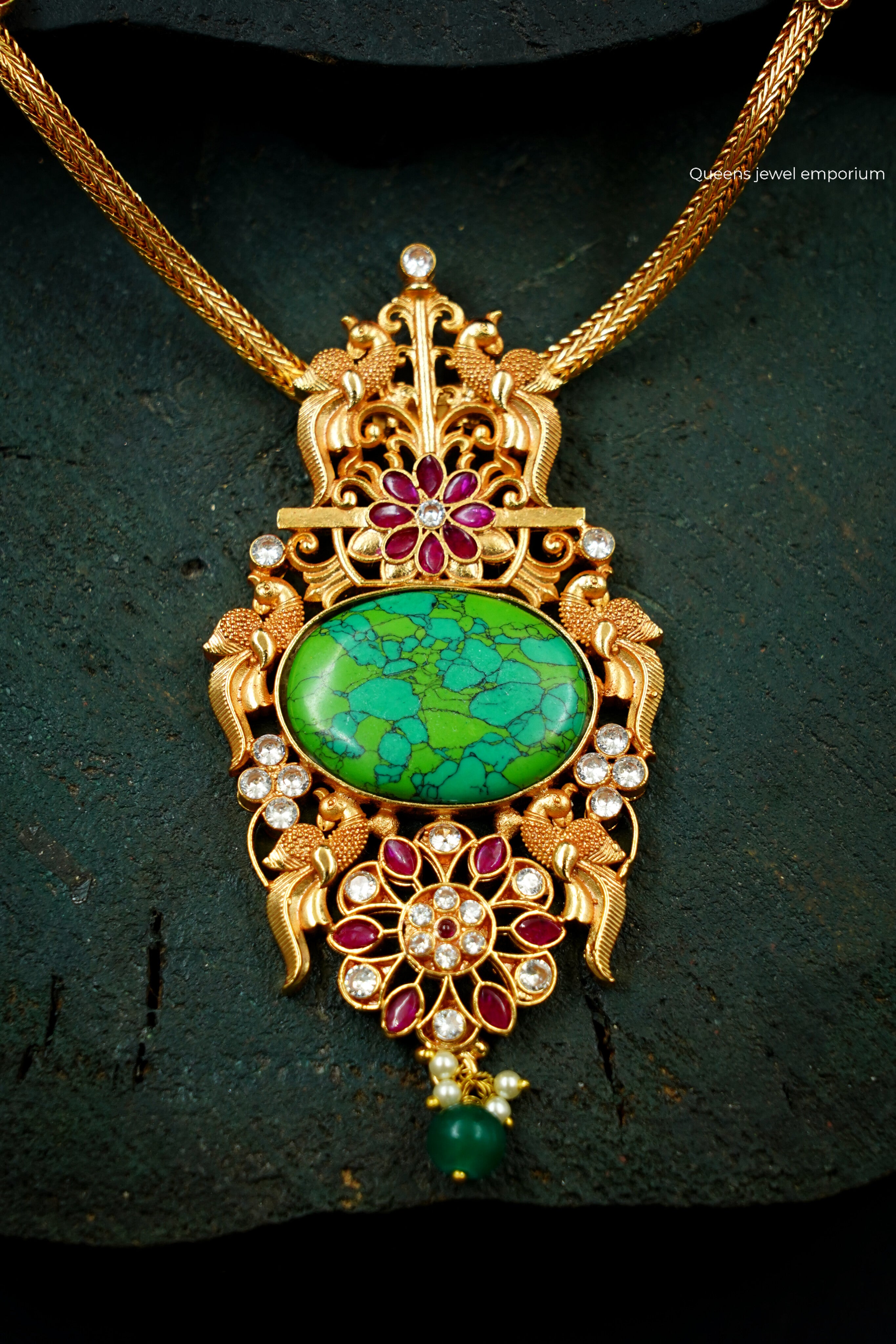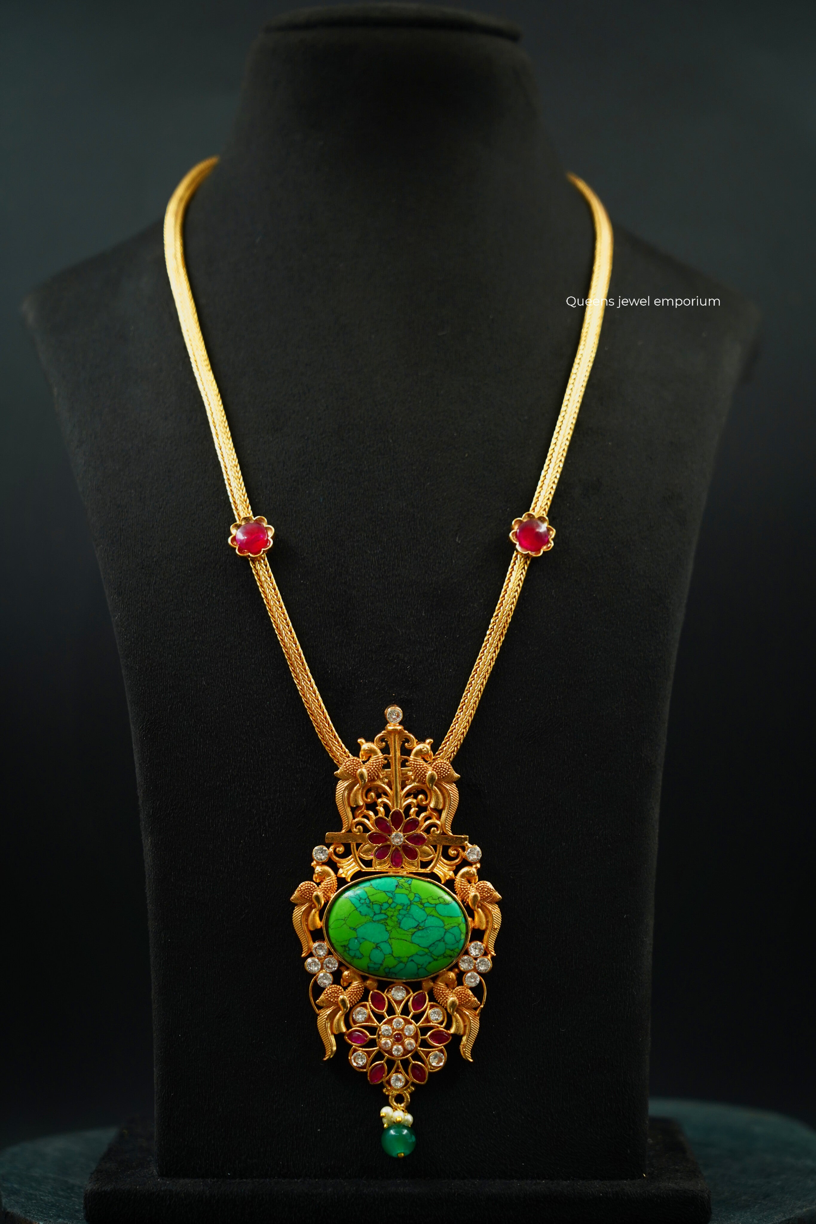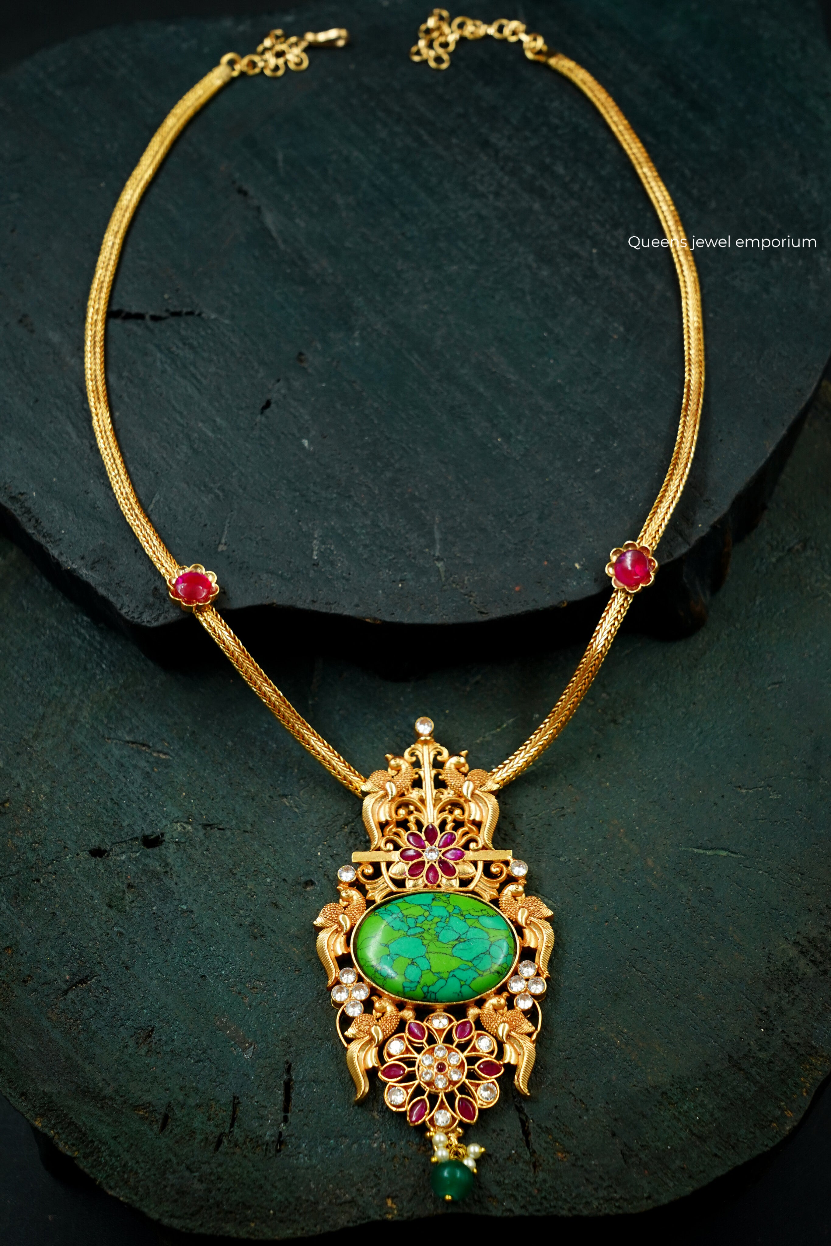 Featuring six nagas kizhi motifs, this necklace is adorned with oval-shaped green turquoise stones floral designs at the top and bottom, highlighted with red kemp stones. Finished with classic kemp ball hangings, it brings a regal touch to traditional elegance, Truly a treasure to pass down for generations.