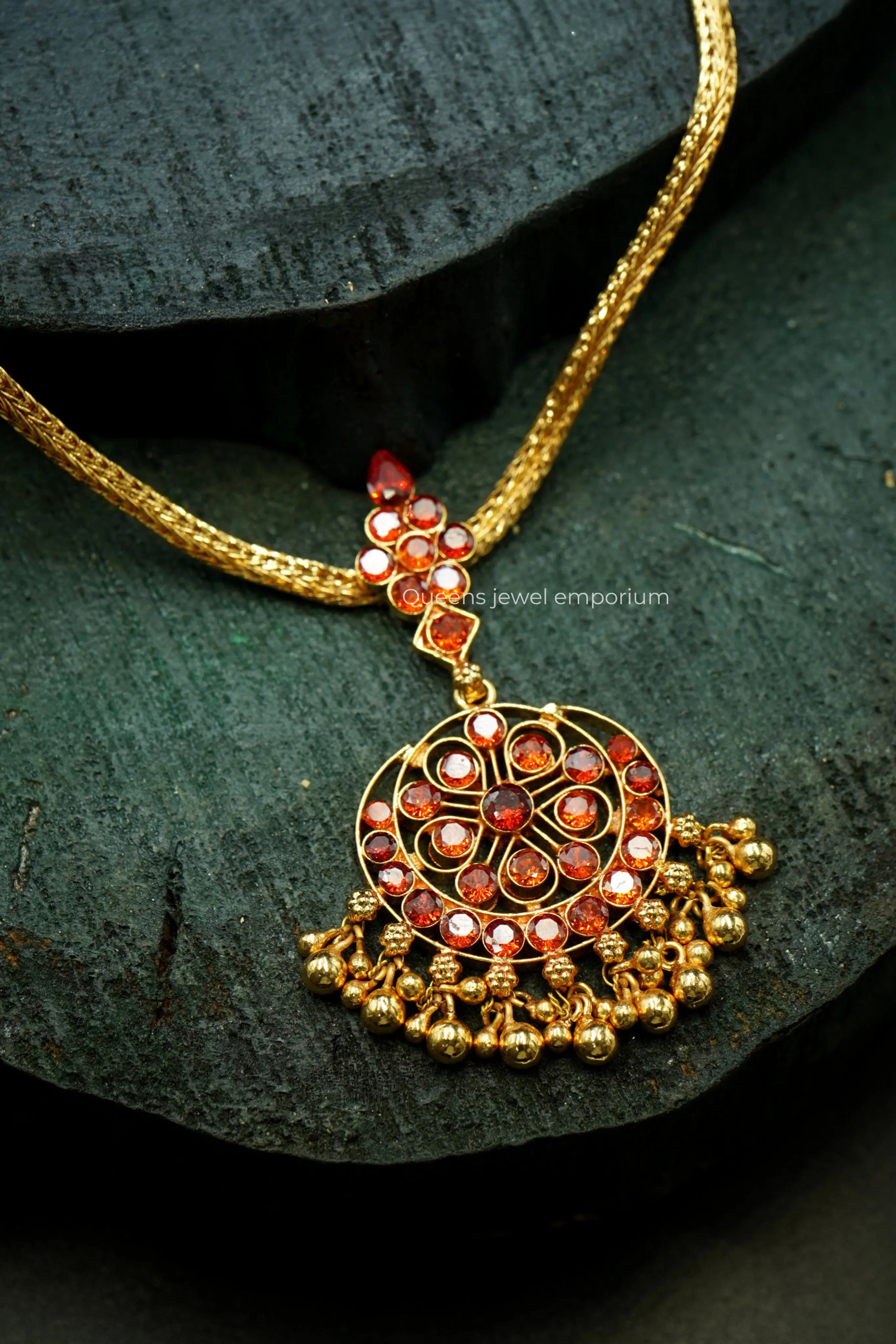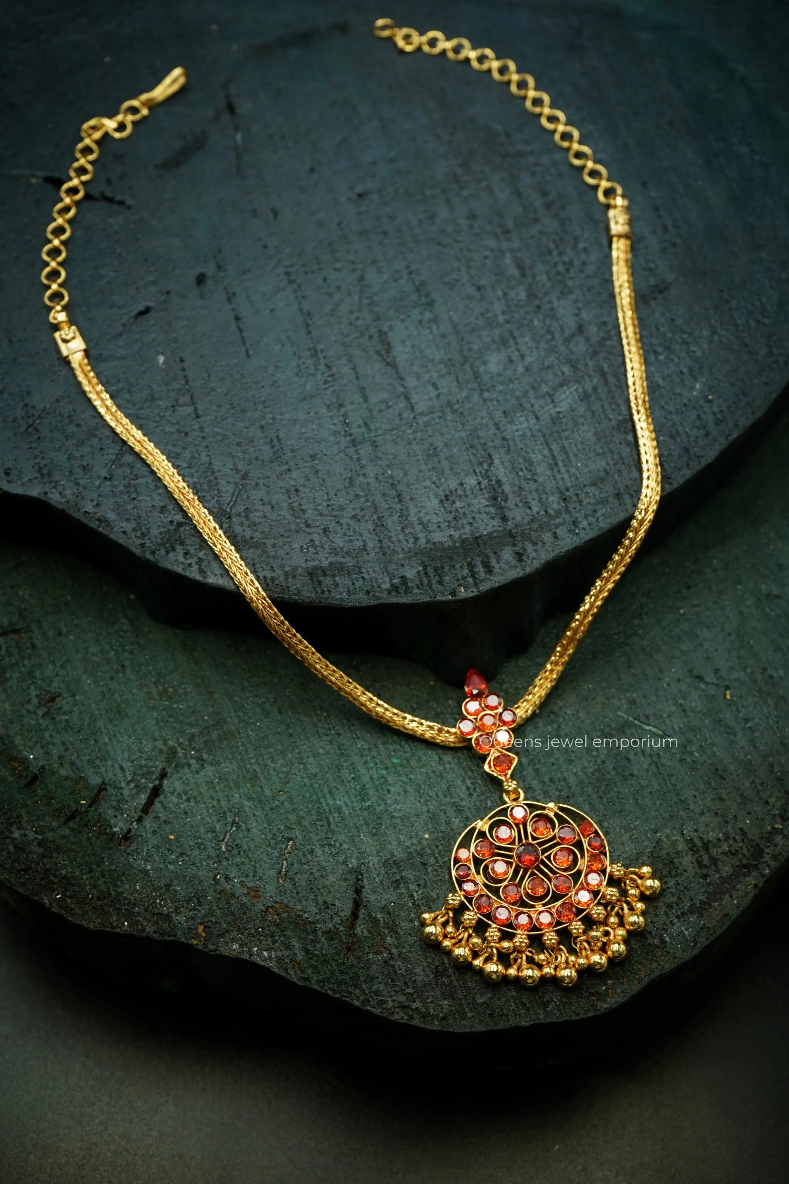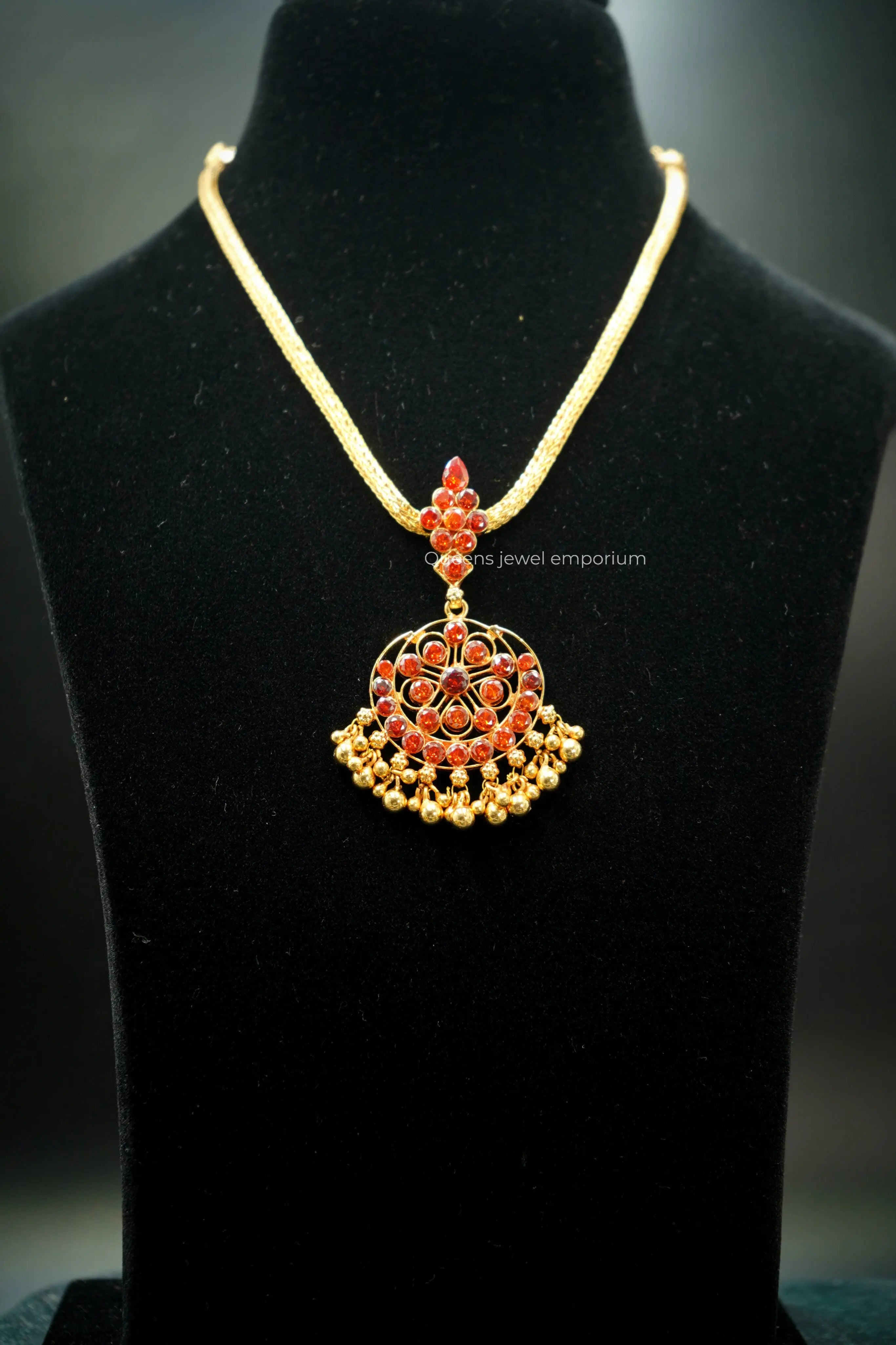 Handmade traditional South Indian jewellery at its finest, the NEELAVATHI NECKLACE features stunning garnet stones with gold balls, all hanging delicately to create a unique and elegant design. With a combination of gold plating and silver alloy, this necklace is a must-have for any occasion.