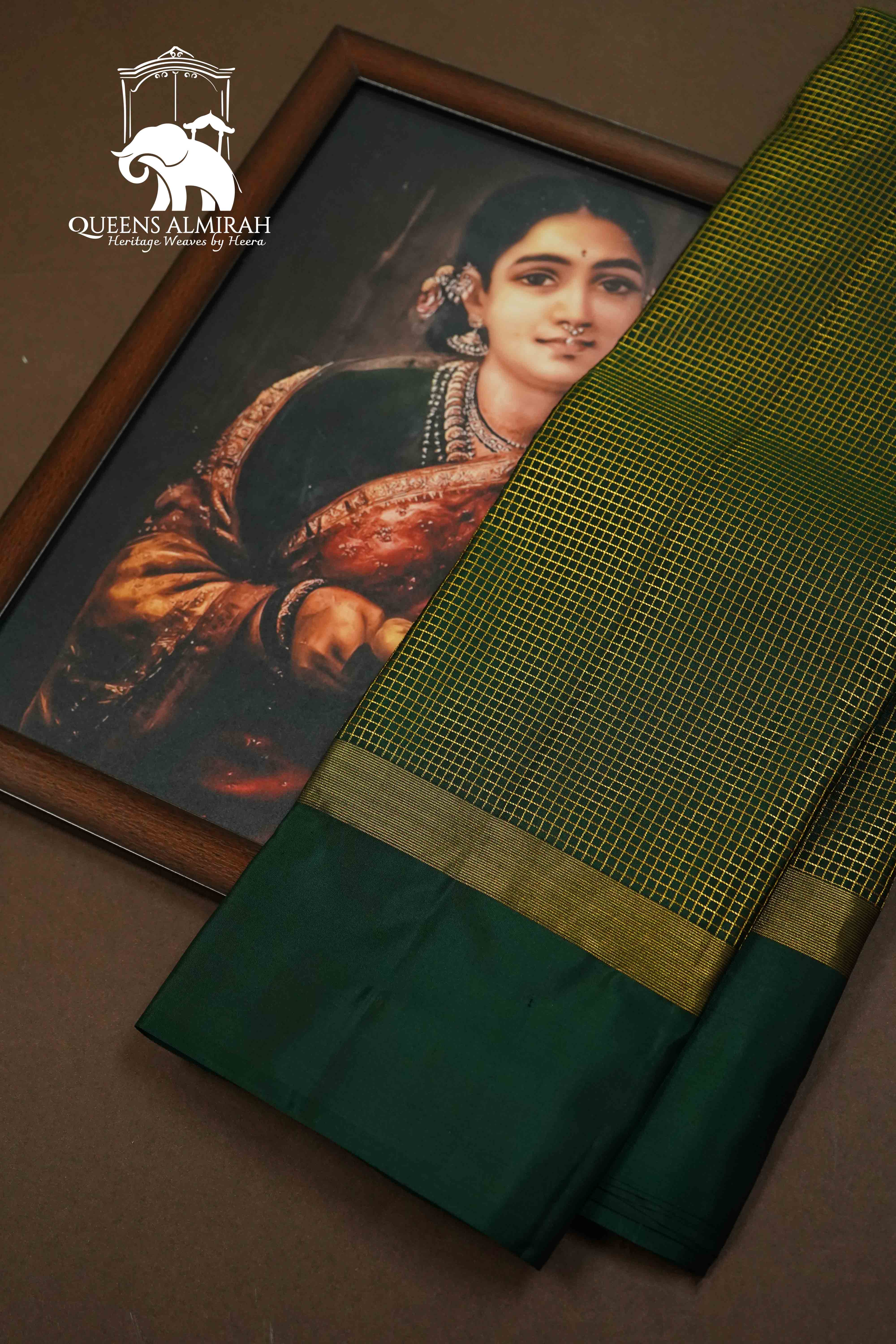 Enhance your traditional wardrobe with this NEEM GREEN PURE KANCHIVARAM SILK SAREE. Hand-woven with intricate KANCHI GETTI BORDER and a RICH PALLU, this saree showcases VINTAGE HERITAGE in a BIG BORDER design. Made with 100% pure silk, it exudes elegance and luxury. Elevate your style with this timeless piece.