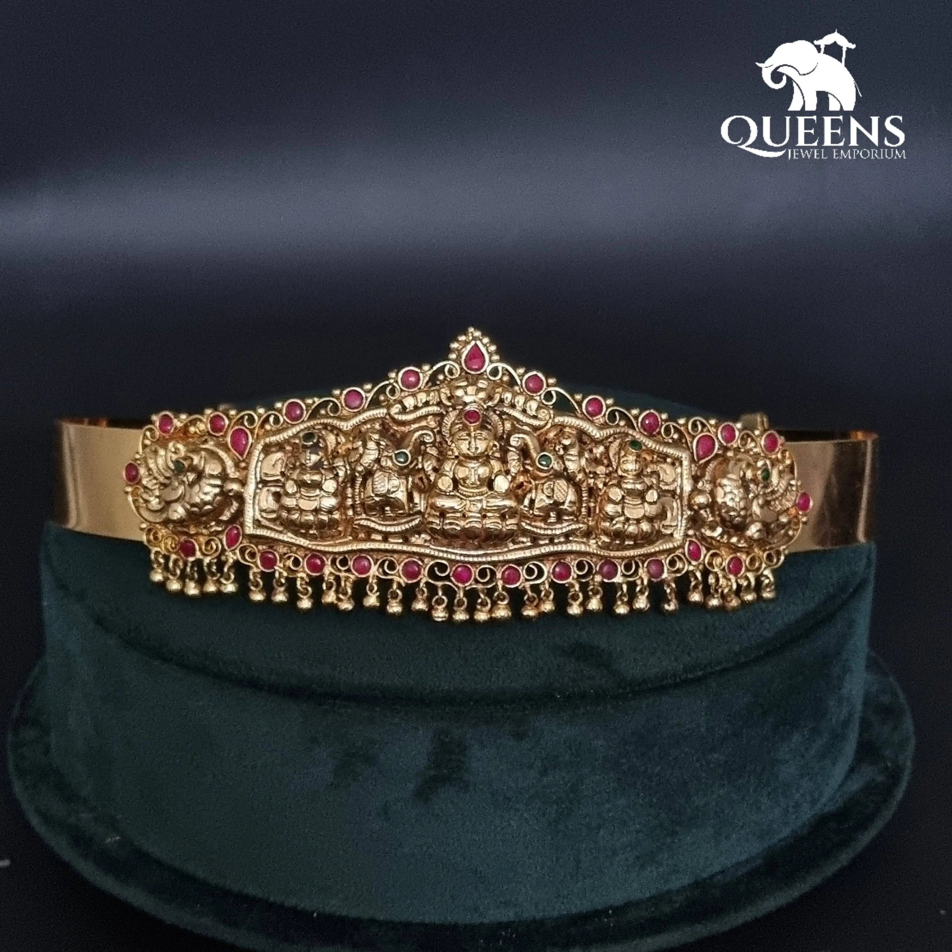 A grandeur yet magnificent Nahaas hip belt from Queen’s exquisite collections flaunted with intricate gejalakshmi and elephant motifs and embellished with pink kemp stones followed by gold ball hangings!Elevate your waist line with this grandeur South Indian Hip belt!