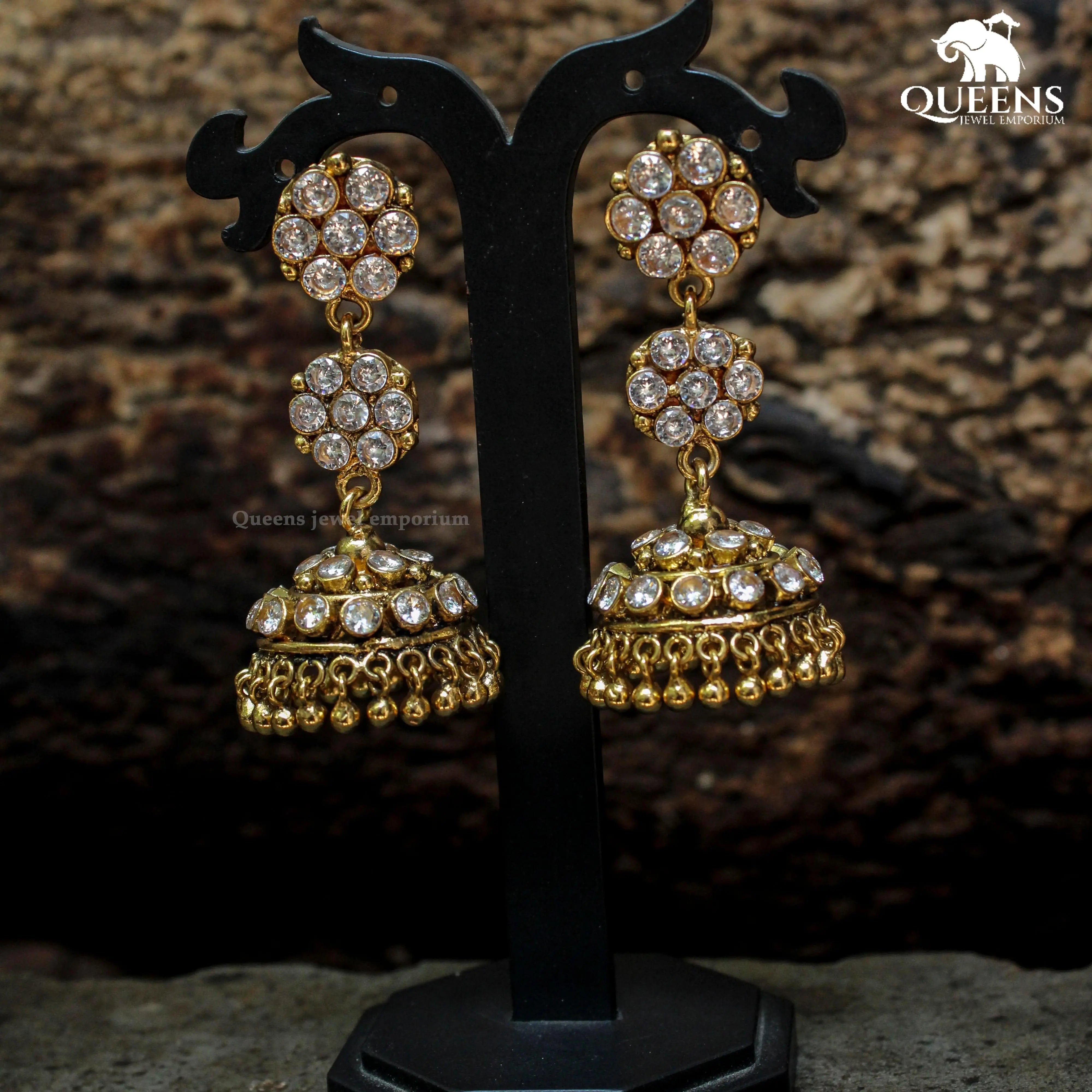 Absolutely feminine jhumkas for the queens and princesses who wish to dress up in their traditional attires. Antique golden finish with few stones at apt places