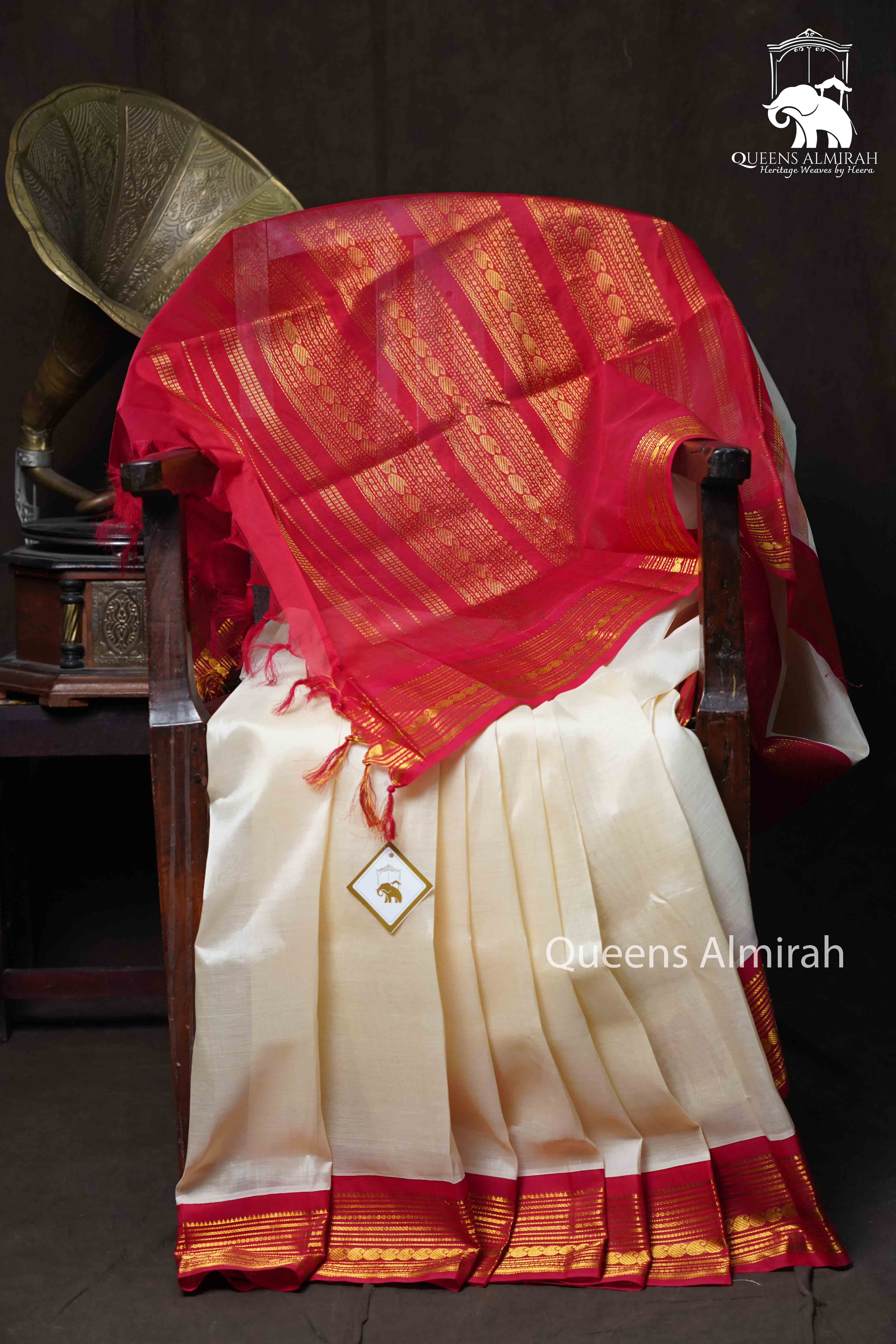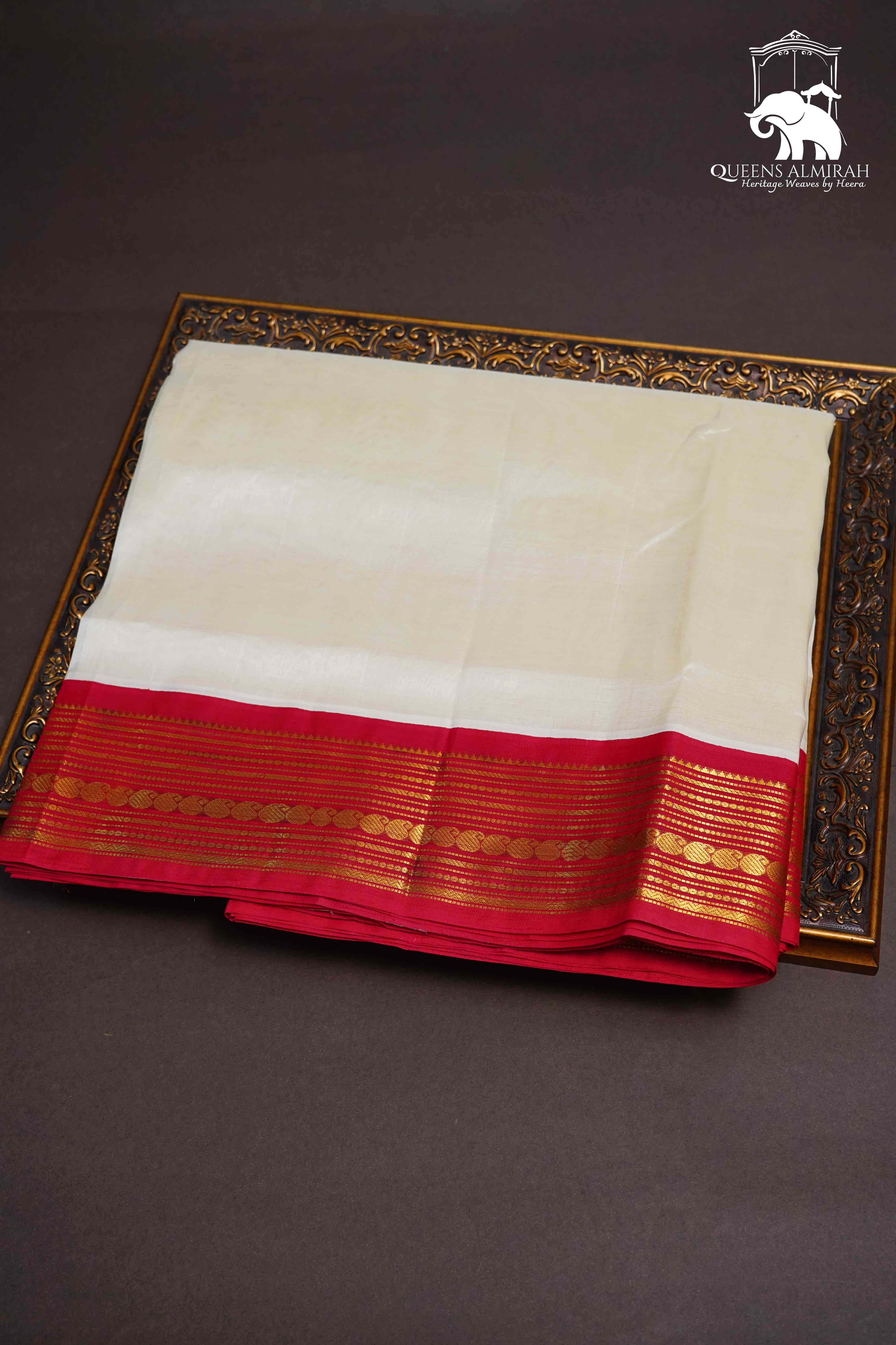 Introducing our luxurious Off White With Red Pure Silk Cotton Saree. Made with a golden border and butta design, this saree offers both elegance and comfort with its pure silk cotton material. Elevate your style with this versatile, timeless piece.