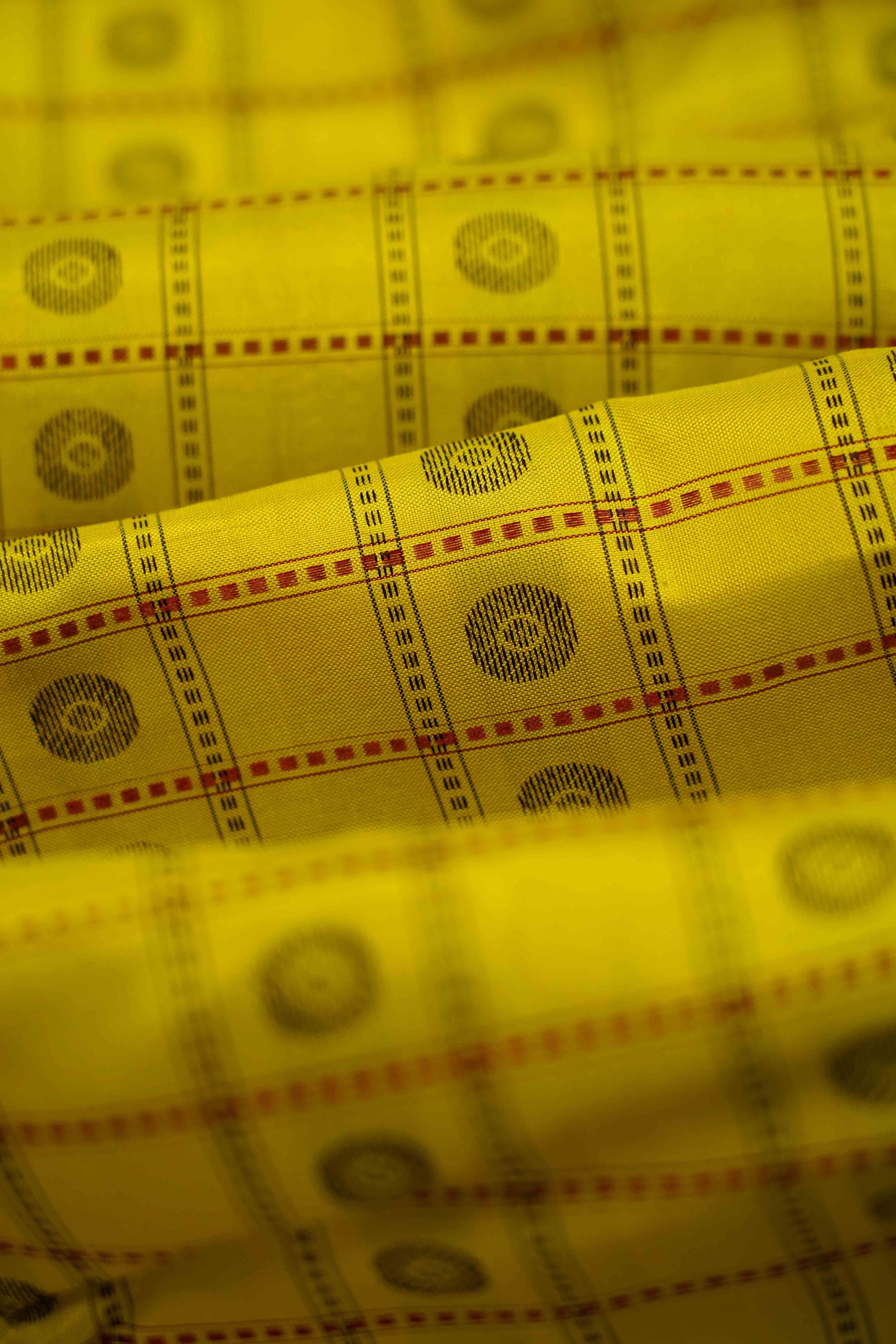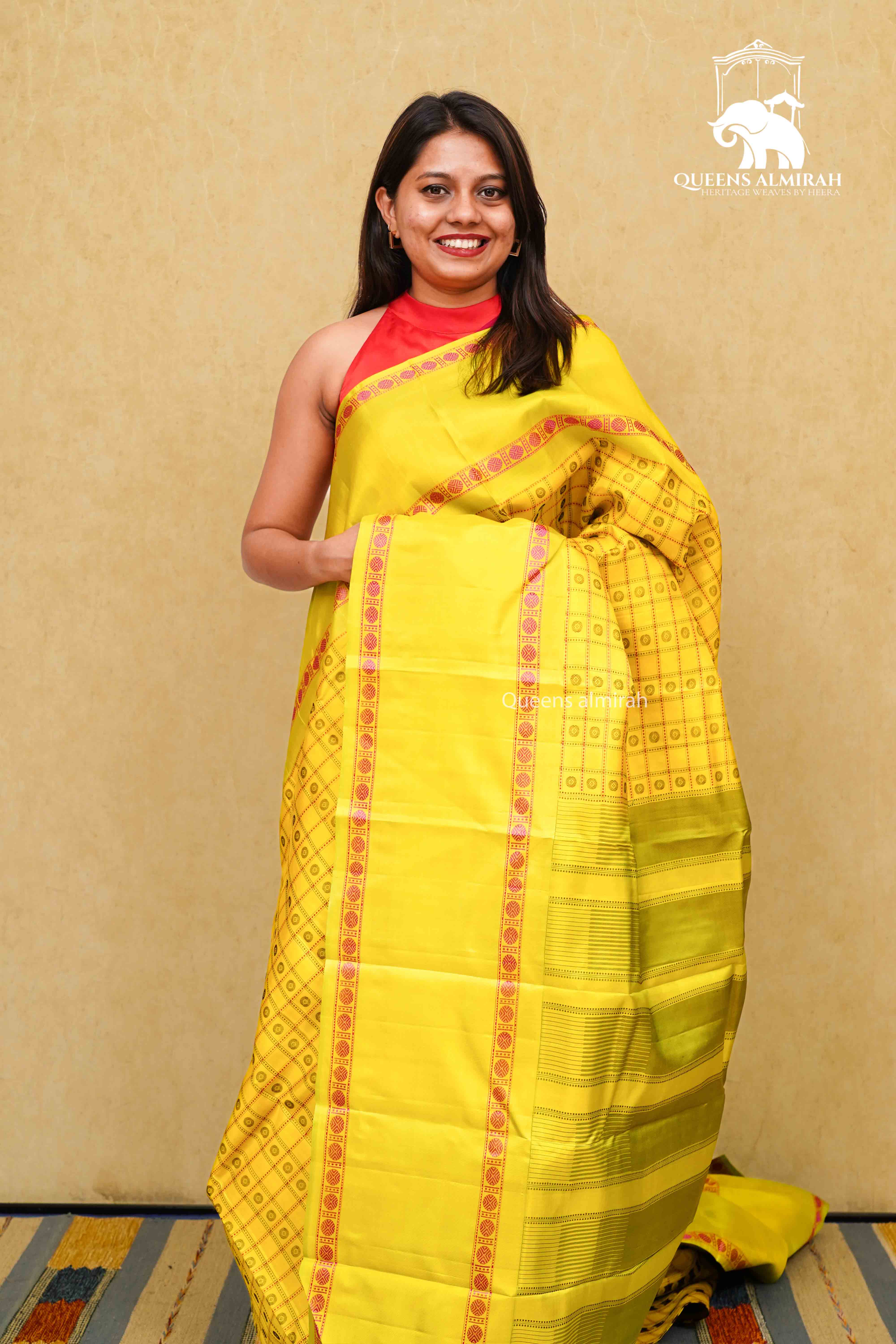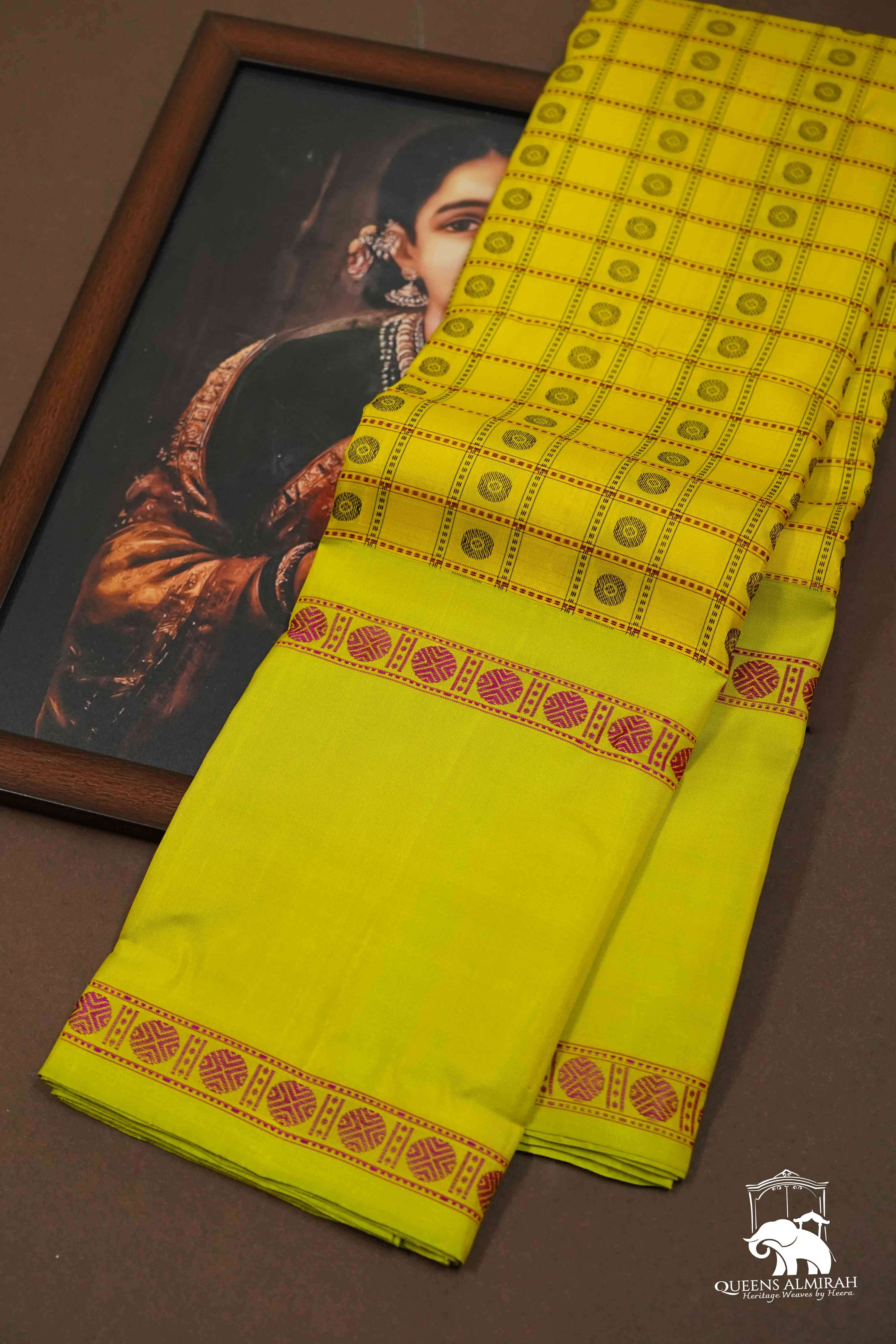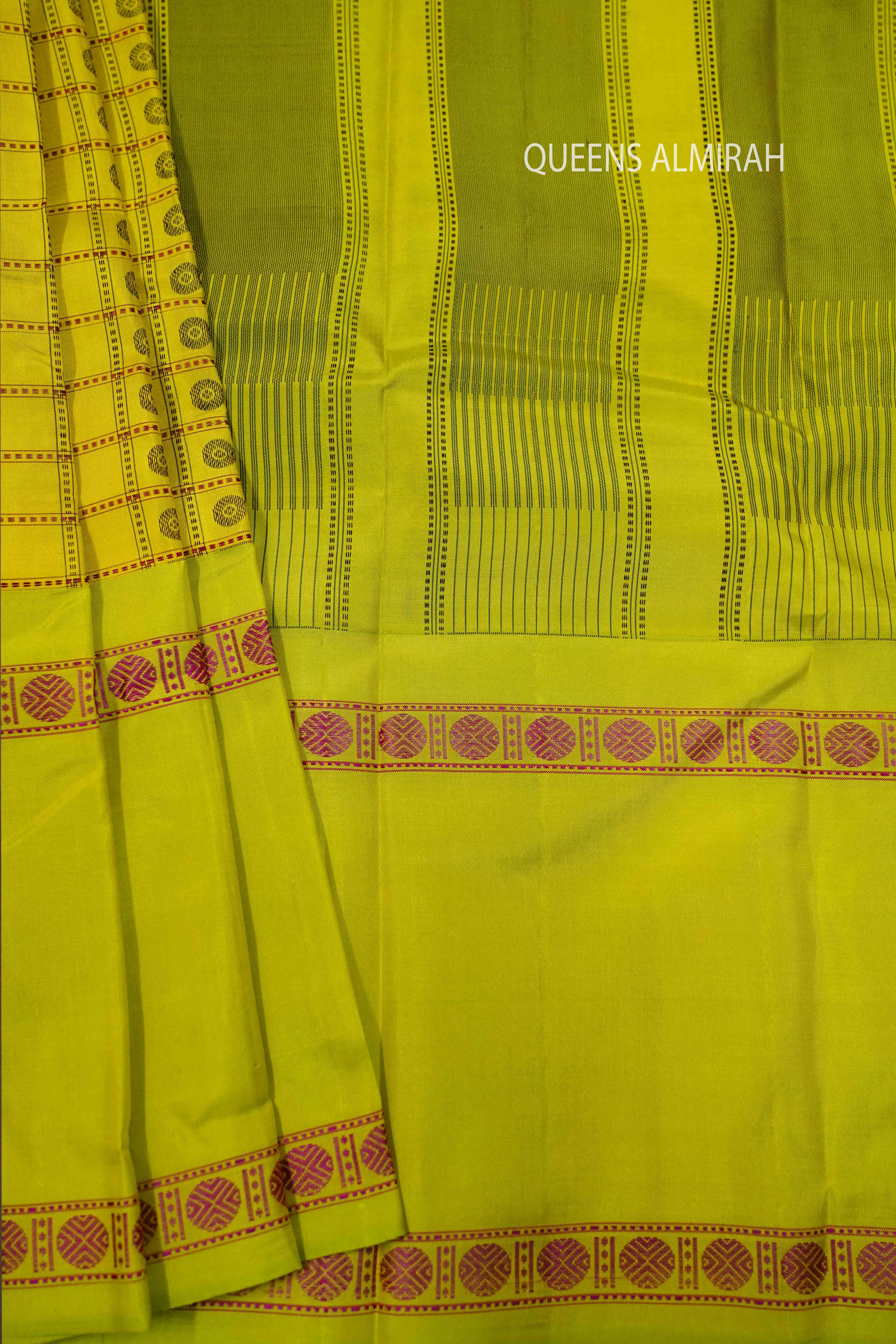 Experience the luxury of pure silk with our Olive Yellow with Pea Green Pure Kanchivaram Silk Saree. Featuring traditional thread work, intricate butta and checks, and rich rudraksha silk thread, this handloom saree is perfect for making a graceful statement at any occasion. Elevate your wardrobe with this elegant addition.