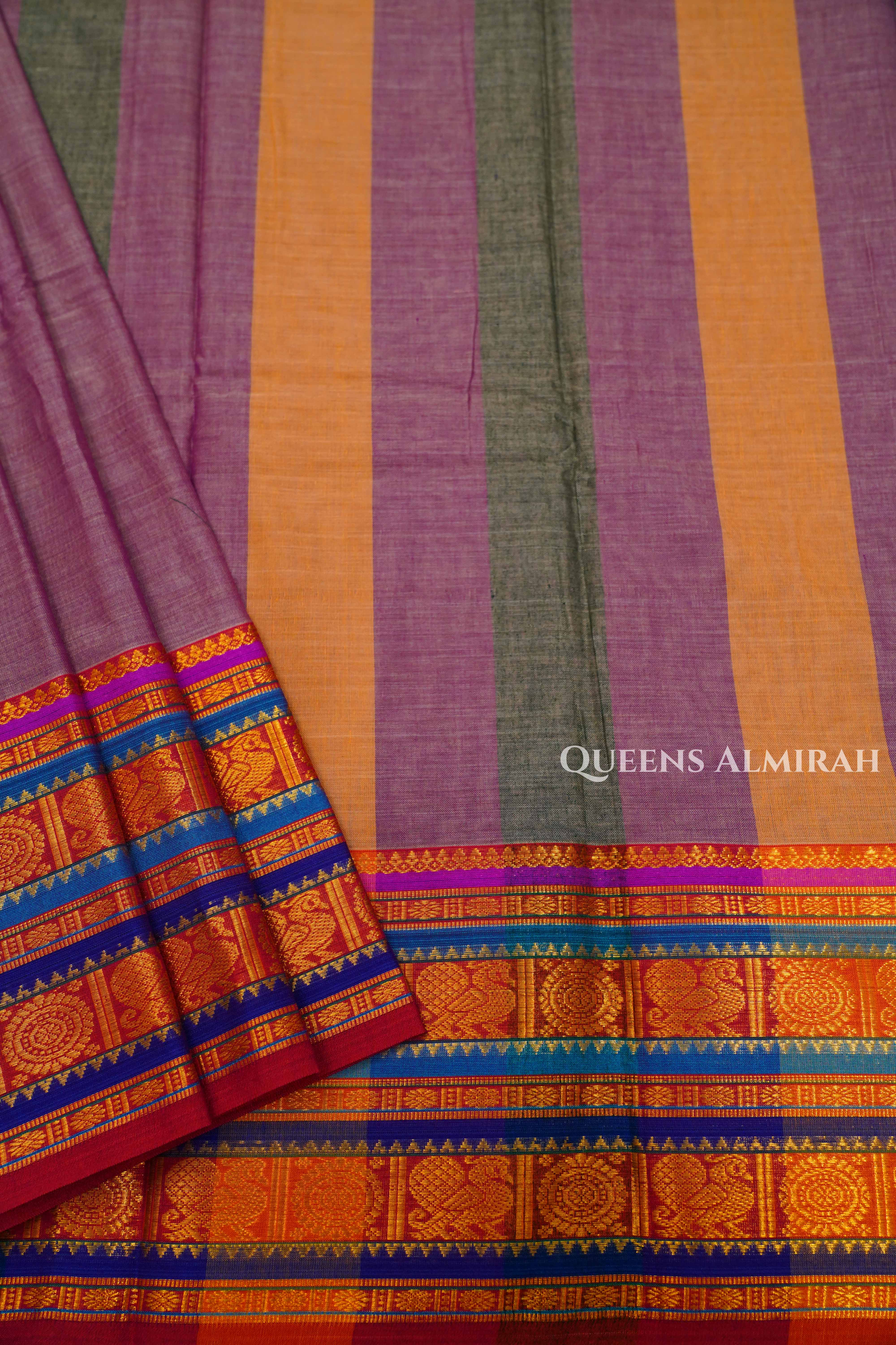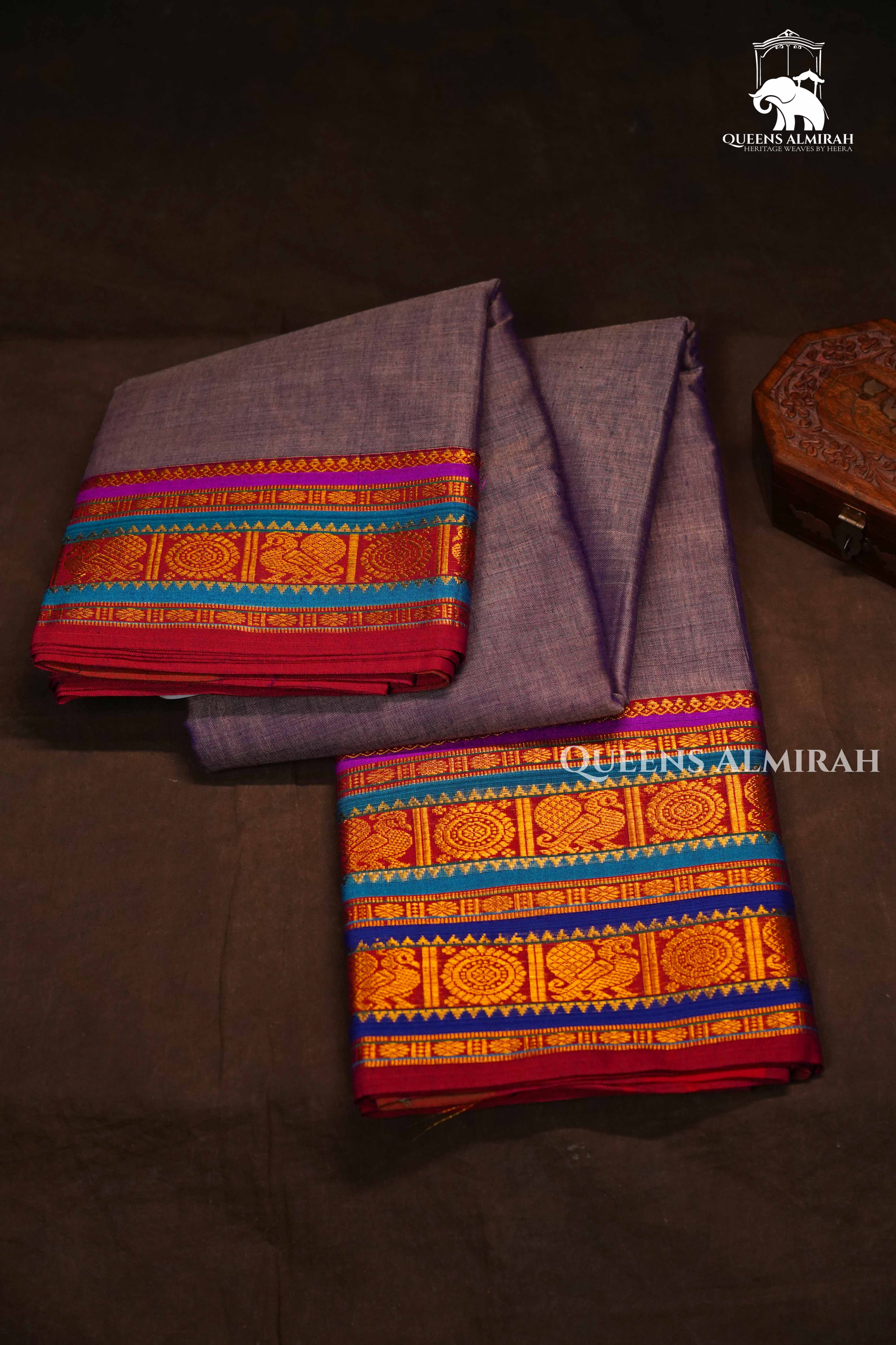 "Exude subtle charm with this elegant onion pink saree, adorned with delicate golden zari weaving and a rich contrasting border. Its soft hue blends sophistication with tradition, making it an ideal choice for festive celebrations and graceful occasions."