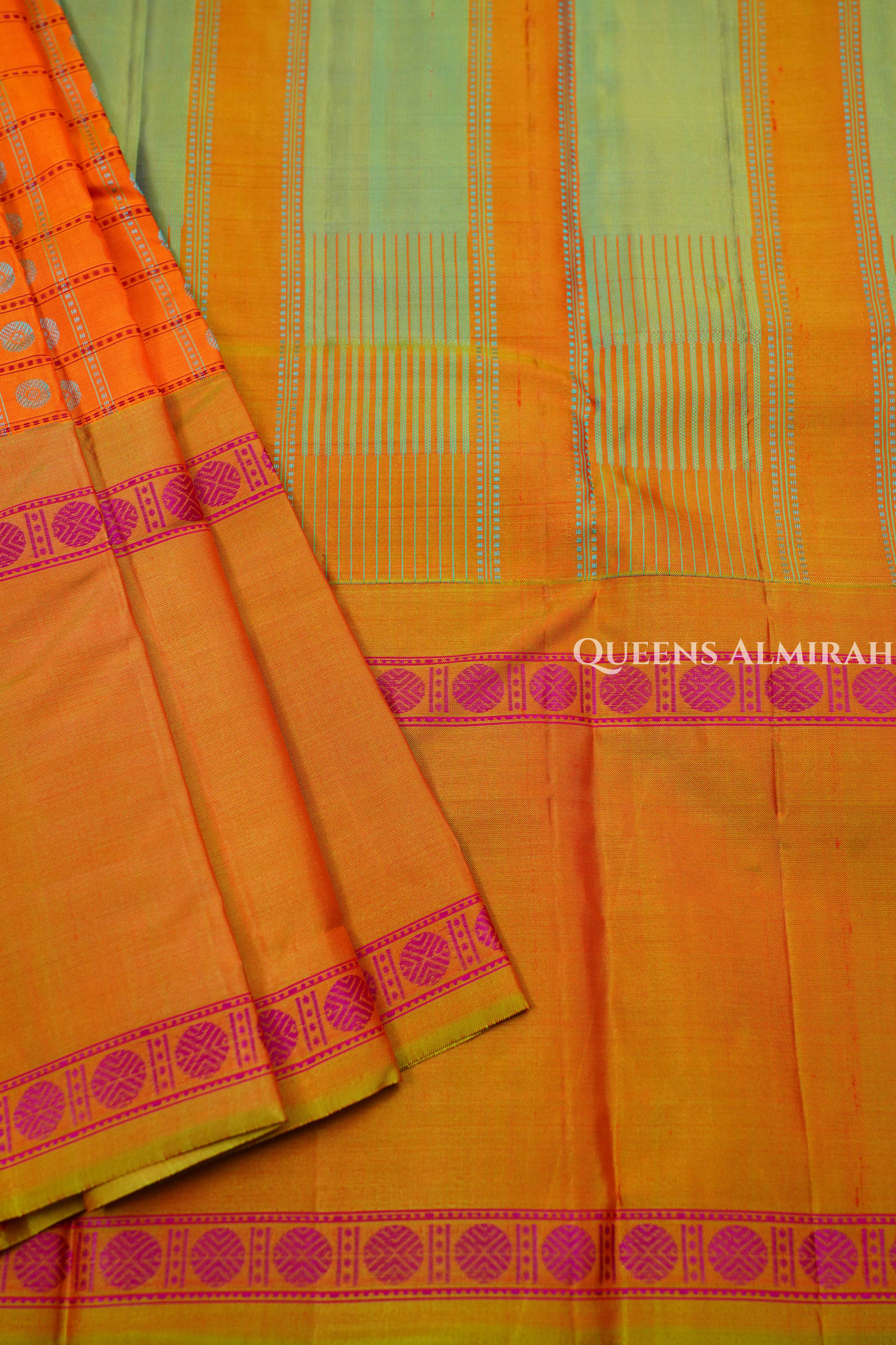 Elevate your ethnic wardrobe with our Orange With Mustard Yellow Pure Kanchivaram Silk Saree, a true masterpiece of South Indian handloom craftsmanship. Woven from 100% pure silk, this saree features traditional thread work, intricate thousand butta and checks pattern, and rich Rudraksha silk thread detailing.Perfect for weddings, festivals, and special occasions, this Kanchipuram silk saree combines classic style with luxurious texture.