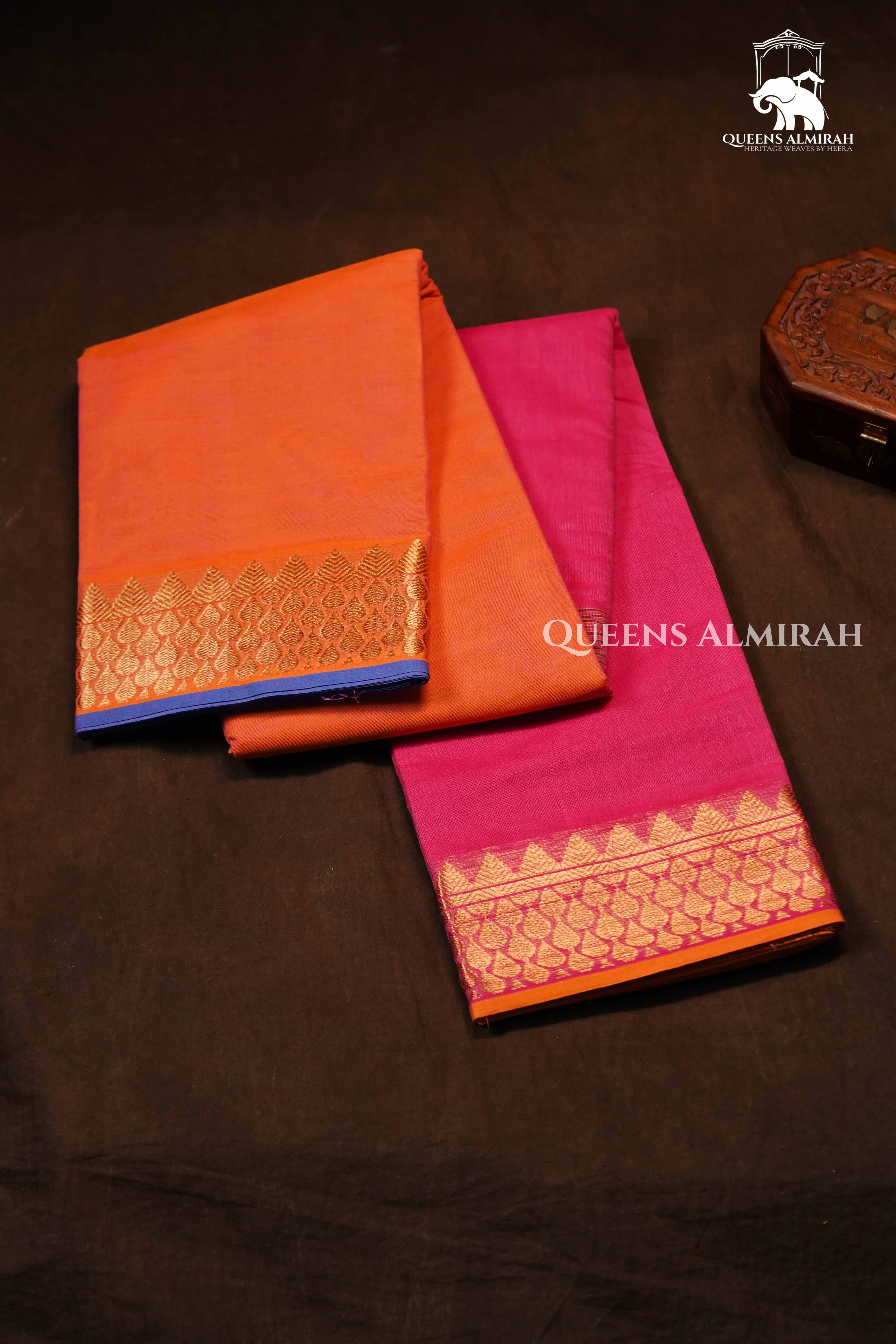 This elegant Chettinad cotton saree features a rich Orangebody beautifully paired with a vibrant Pink pallu. The borders are crafted in the traditional Ganga Jamuna style, showcasing contrasting dual tones on either side. Adorned with intricate golden coin butta motifs, this saree radiates heritage charm and sophistication. Perfect for festive occasions, temple visits, and cultural celebrations, it embodies timeless Chettinad craftsmanship.