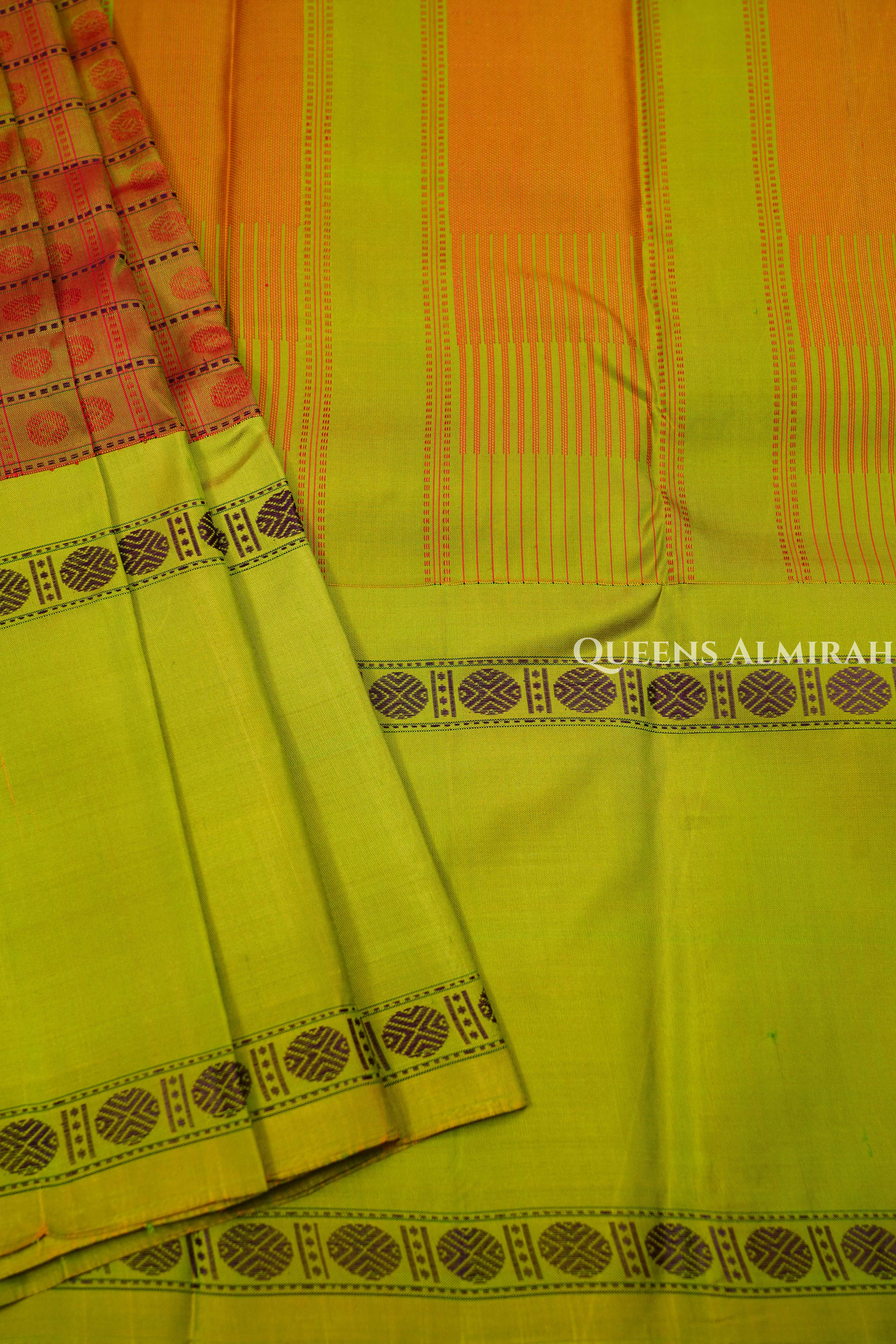 Elevate your ethnic wardrobe with our Orange With Pista Green Pure Kanchivaram Silk Saree, a true masterpiece of South Indian handloom craftsmanship. Woven from 100% pure silk, this saree features traditional thread work, intricate thousand butta and checks pattern, and rich Rudraksha silk thread detailing.Perfect for weddings, festivals, and special occasions, this Kanchipuram silk saree combines classic style with luxurious texture.