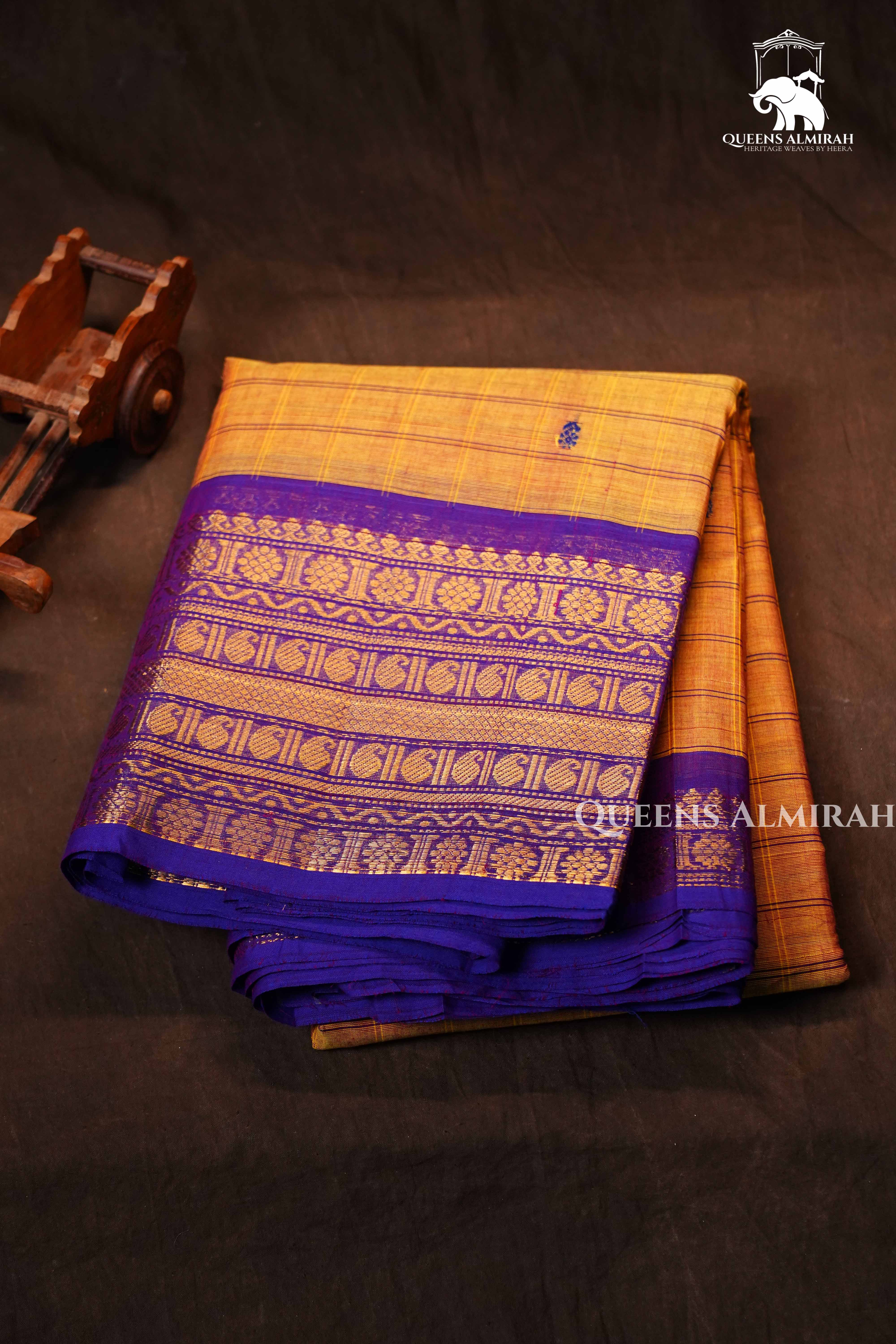 This exquisite Orange Kanchi cotton saree is designed with delicate checks and adorned with small woven motifs across the body, adding a touch of subtle charm. The purple border with intricate golden zari patterns enhances its elegance, making it perfect for traditional functions, festive occasions, and cultural celebrations. Crafted from premium quality cotton, this saree ensures both comfort and sophistication.