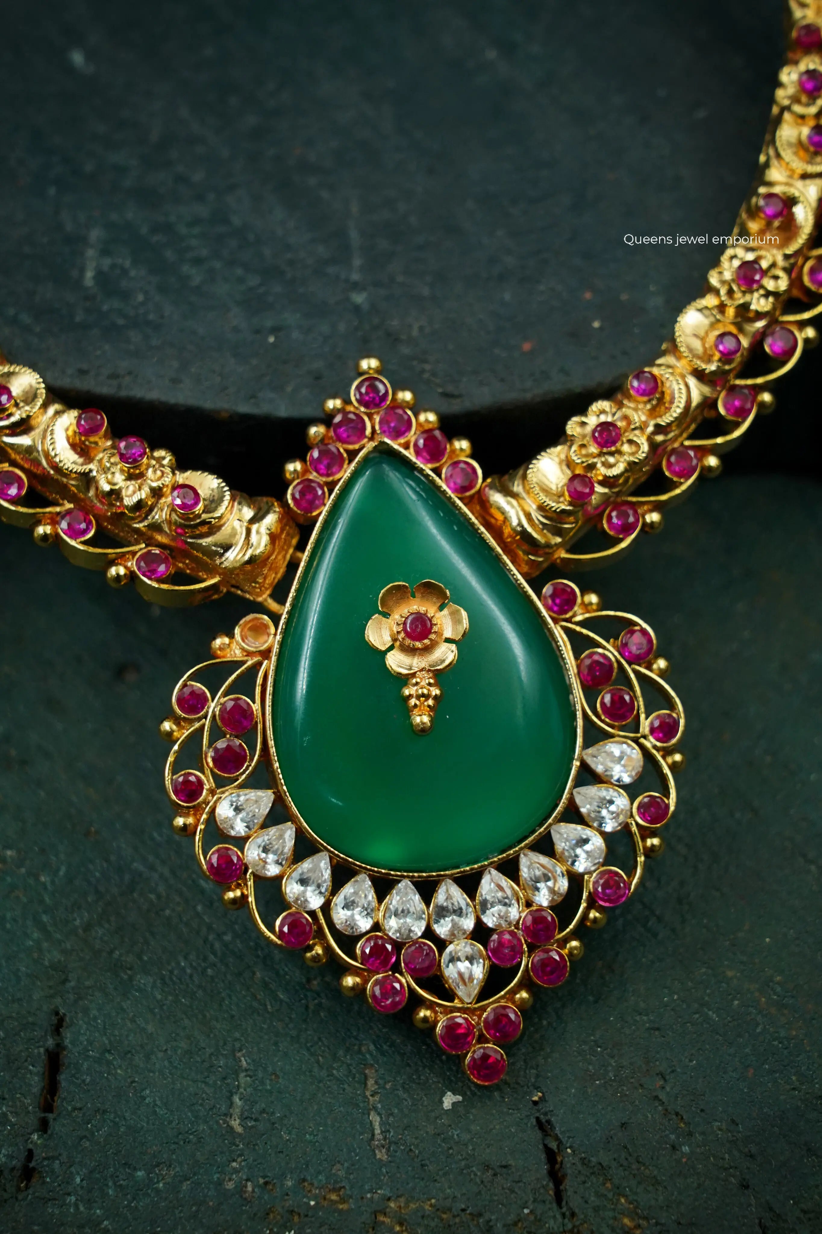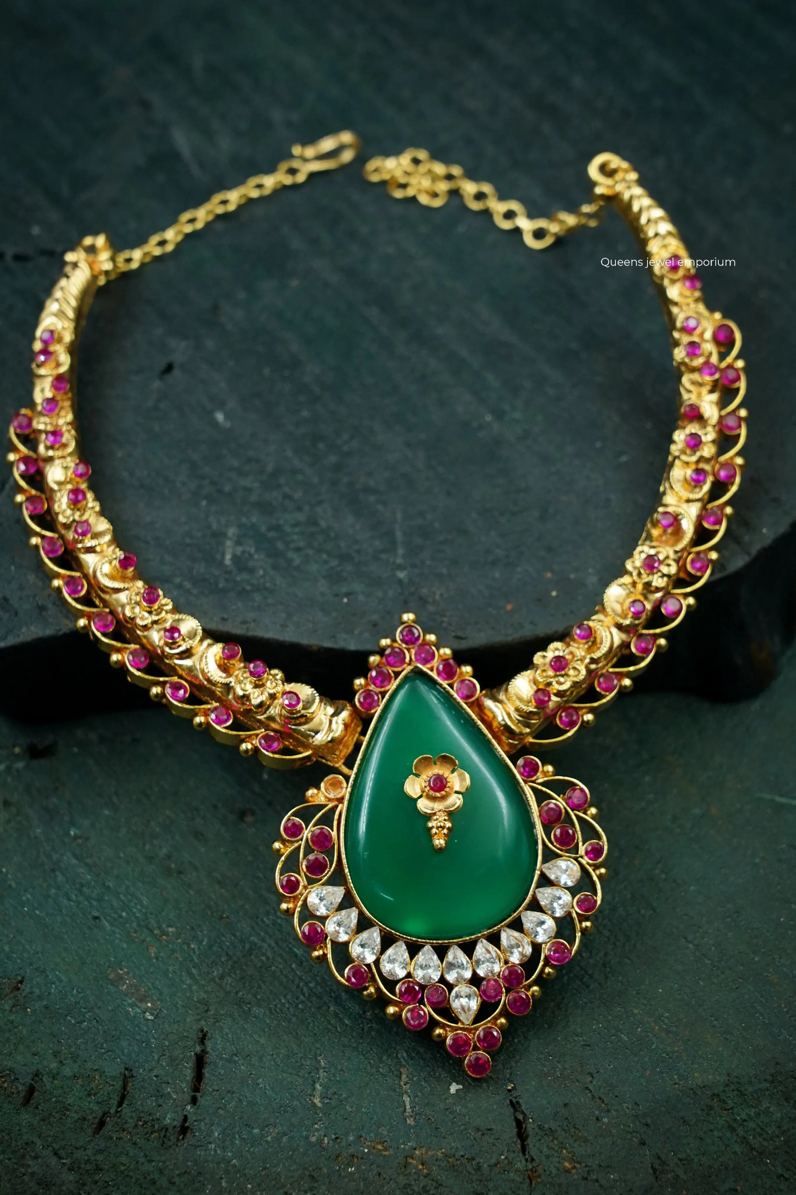 This elegant hasli-style necklace features detailed Nagas patterns and delicate floral motifs, set with shimmering zircon stones and rich Balaji pink accents. A bold emerald green stone anchors the piece, with a tiny nagas floral design at its heart—perfect for adding grace to festive and ethnic looks. Truly a treasure to pass down for generations.