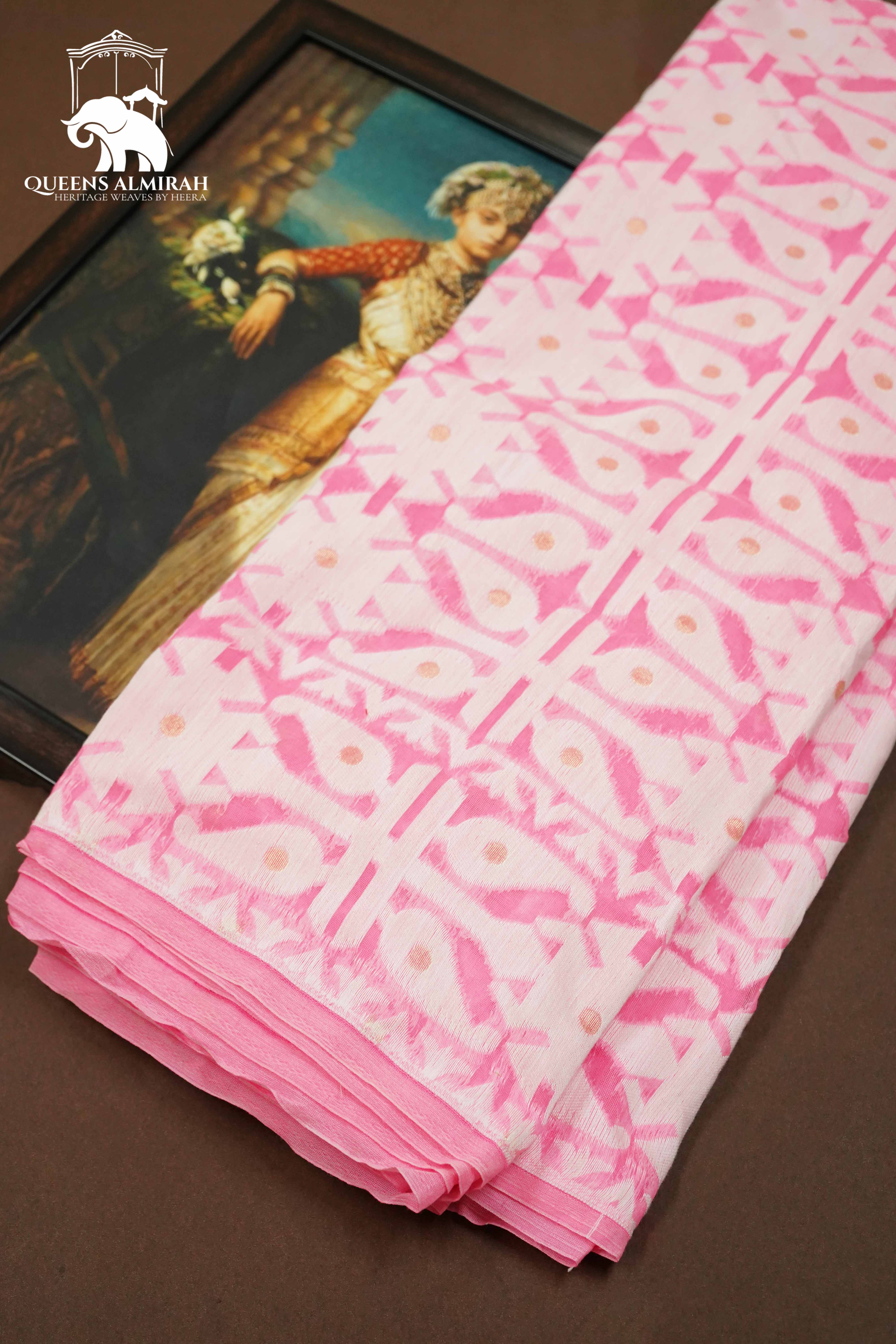 Stay comfortable and stylish with our OYSTER PINK JAMDANI COTTON SAREE. Made with high-quality cotton, it guarantees comfort and durability. Its intricate Jamdani designs add a touch of elegance, making it perfect for any occasion. Experience the softness and ease of wear, perfect for any weather.