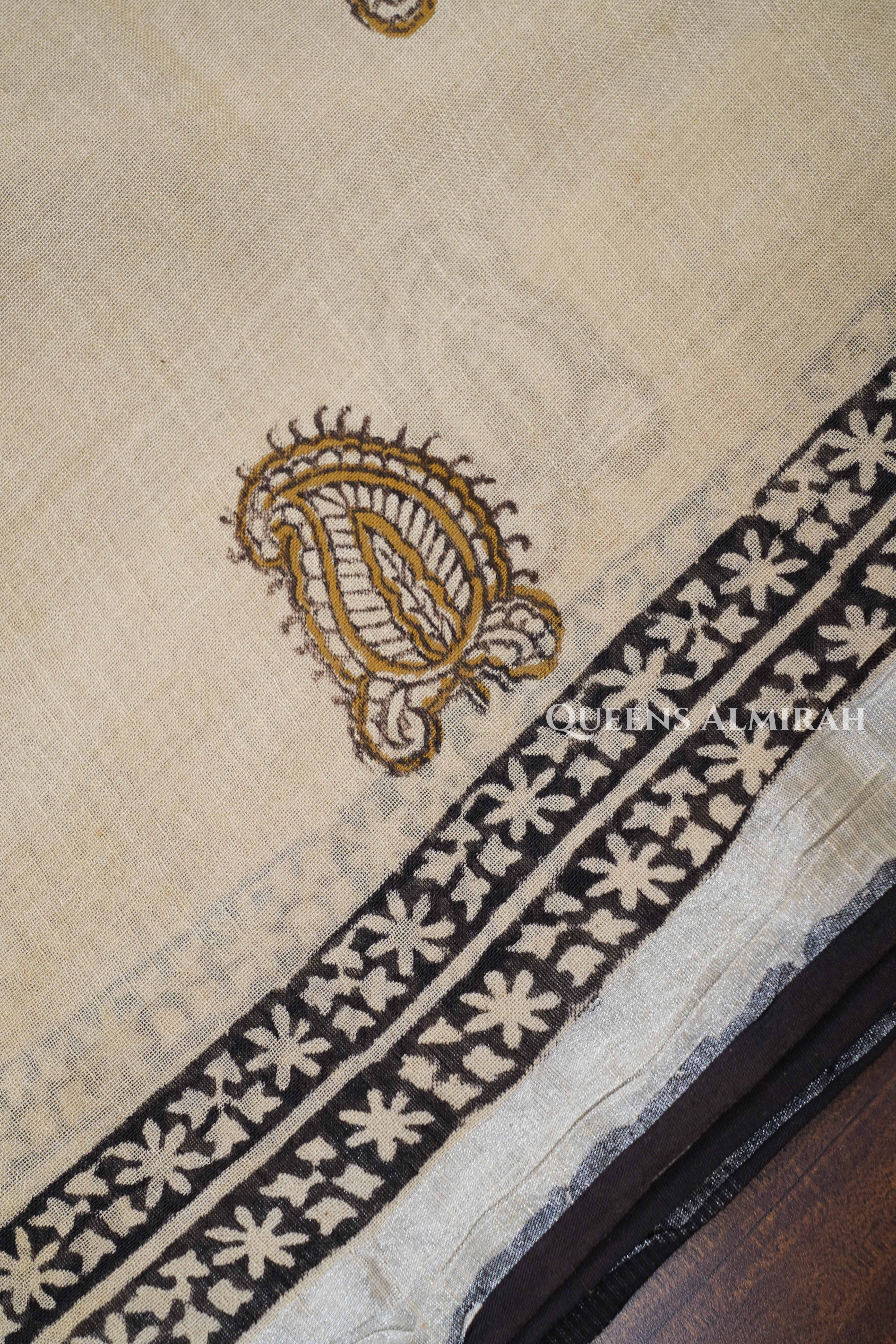 Elegant Linen Cotton Saree featuring beautiful Pale Vanilla floral block prints with Black accents. This lightweight and breathable saree offers perfect comfort and style for daily wear or summer occasions.