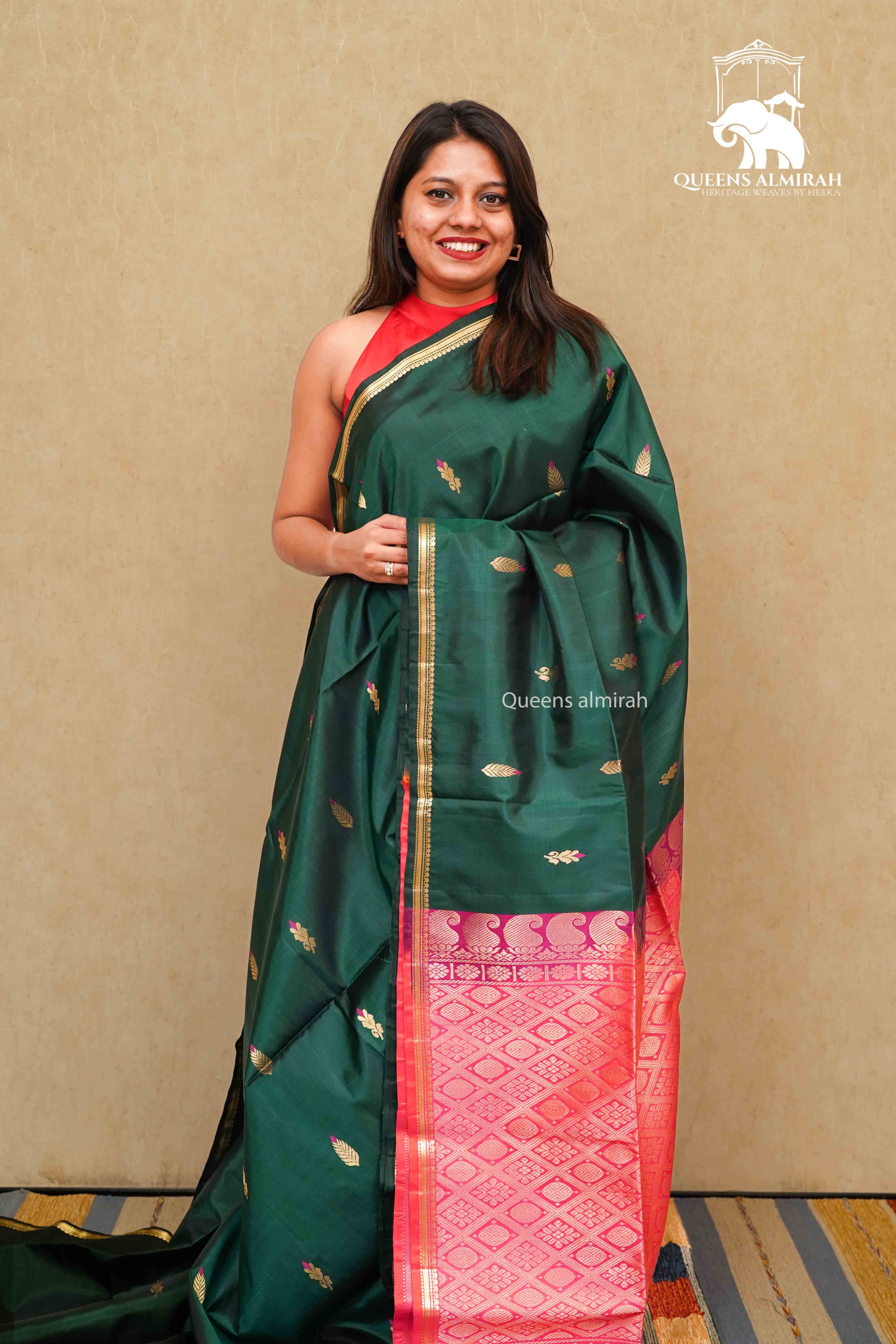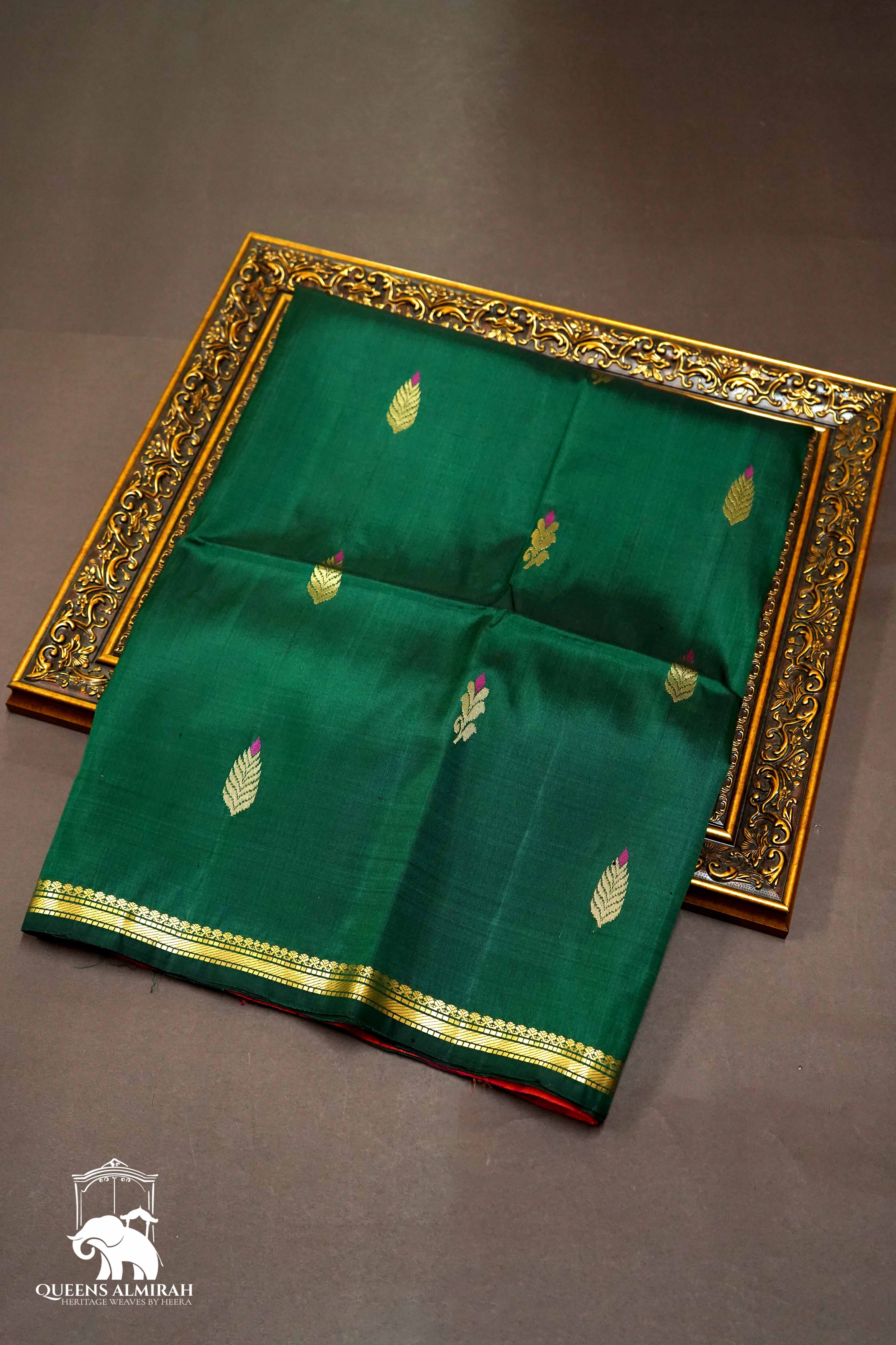 Inspired by Raja Ravi Varma's "Vasanthasena", this exquisite saree is expertly crafted from soft silk, featuring a stunning palm green color accented by a delicate gold border. The perfect blend of elegance and comfort, this saree is designed to make you feel confident and turn heads at any occasion.