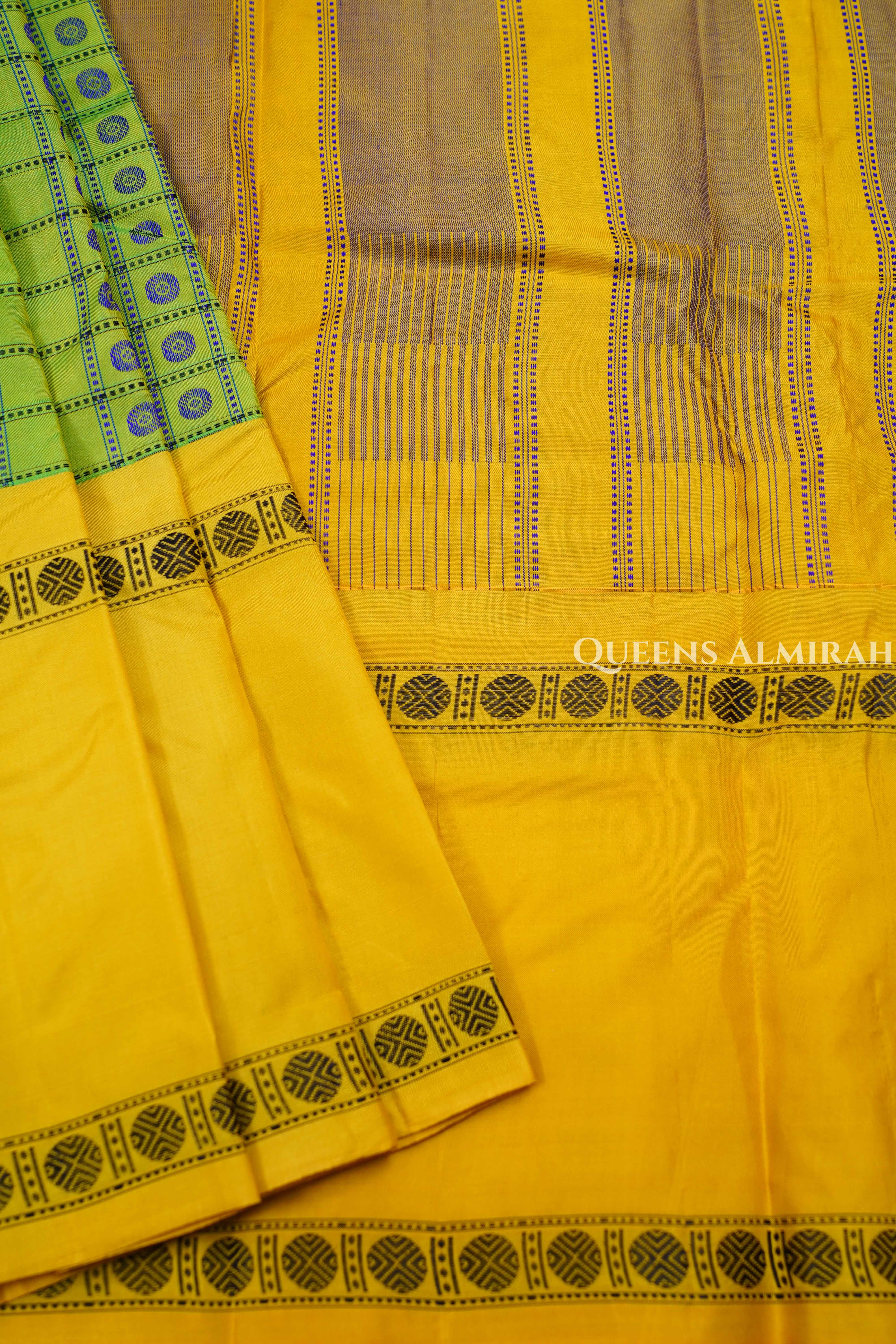 Elevate your ethnic wardrobe with our Parrot Green With Yellow Pure Kanchivaram Silk Saree, a true masterpiece of South Indian handloom craftsmanship. Woven from 100% pure silk, this saree features traditional thread work, intricate thousand butta and checks pattern, and rich Rudraksha silk thread detailing.Perfect for weddings, festivals, and special occasions, this Kanchipuram silk saree combines classic style with luxurious texture.