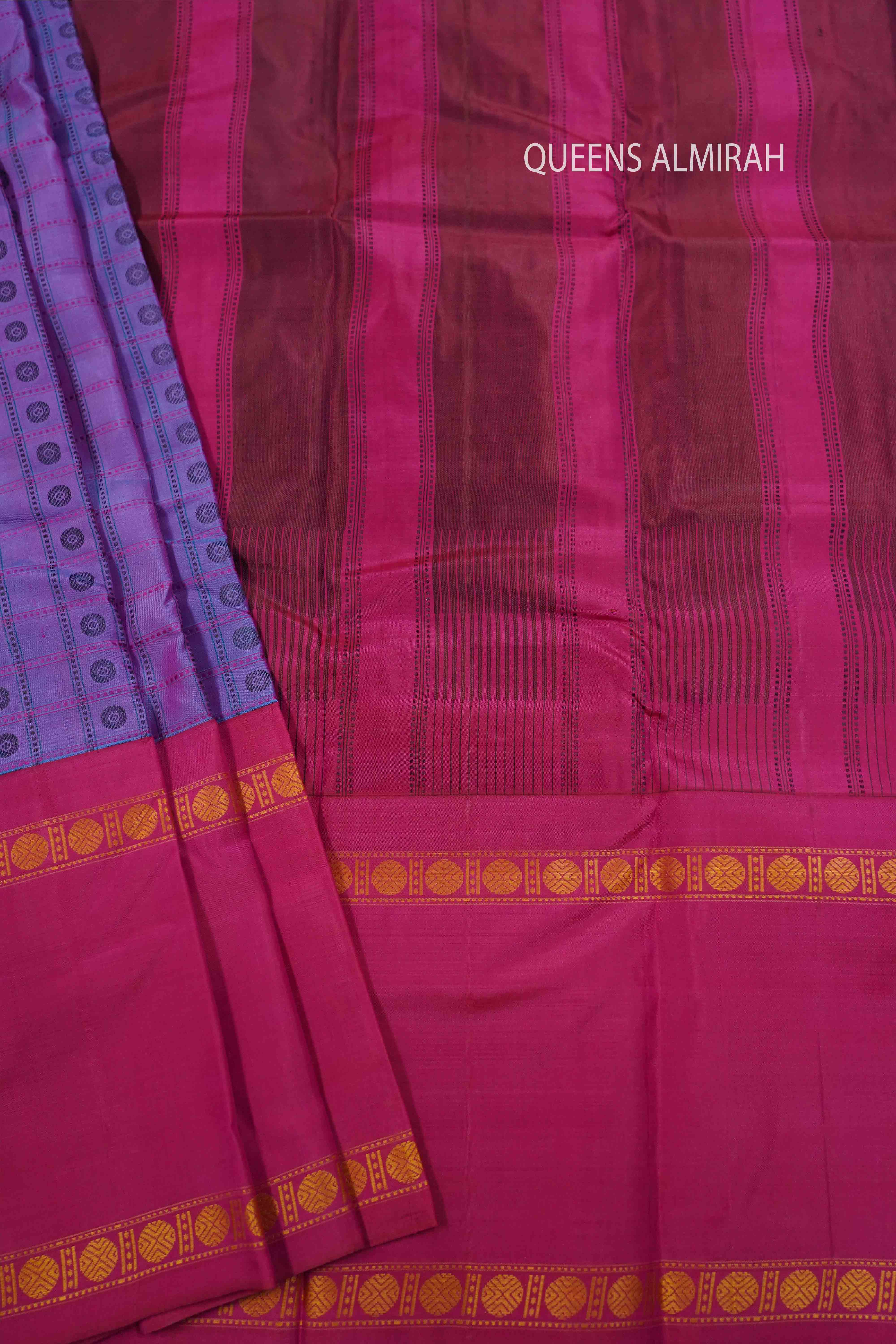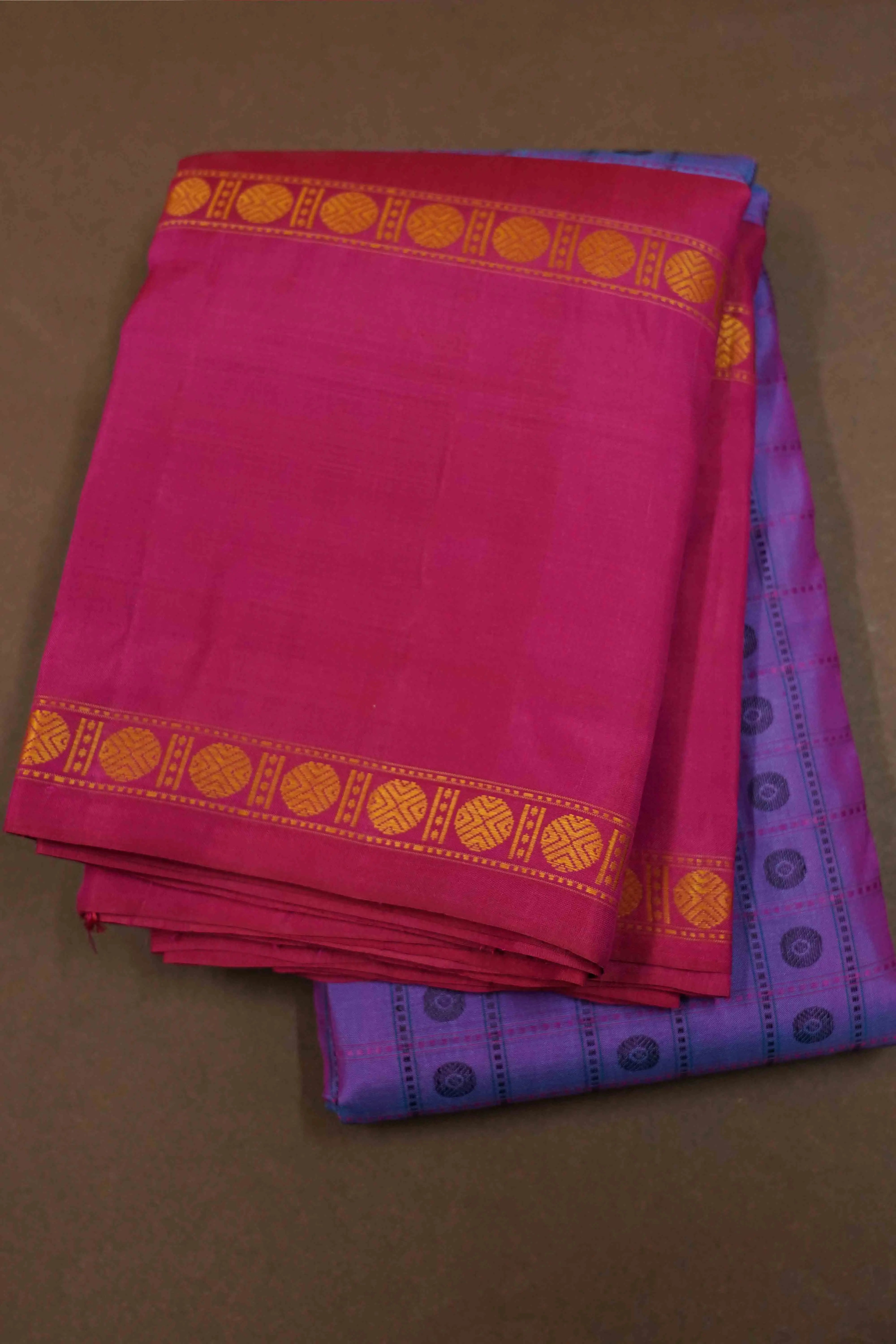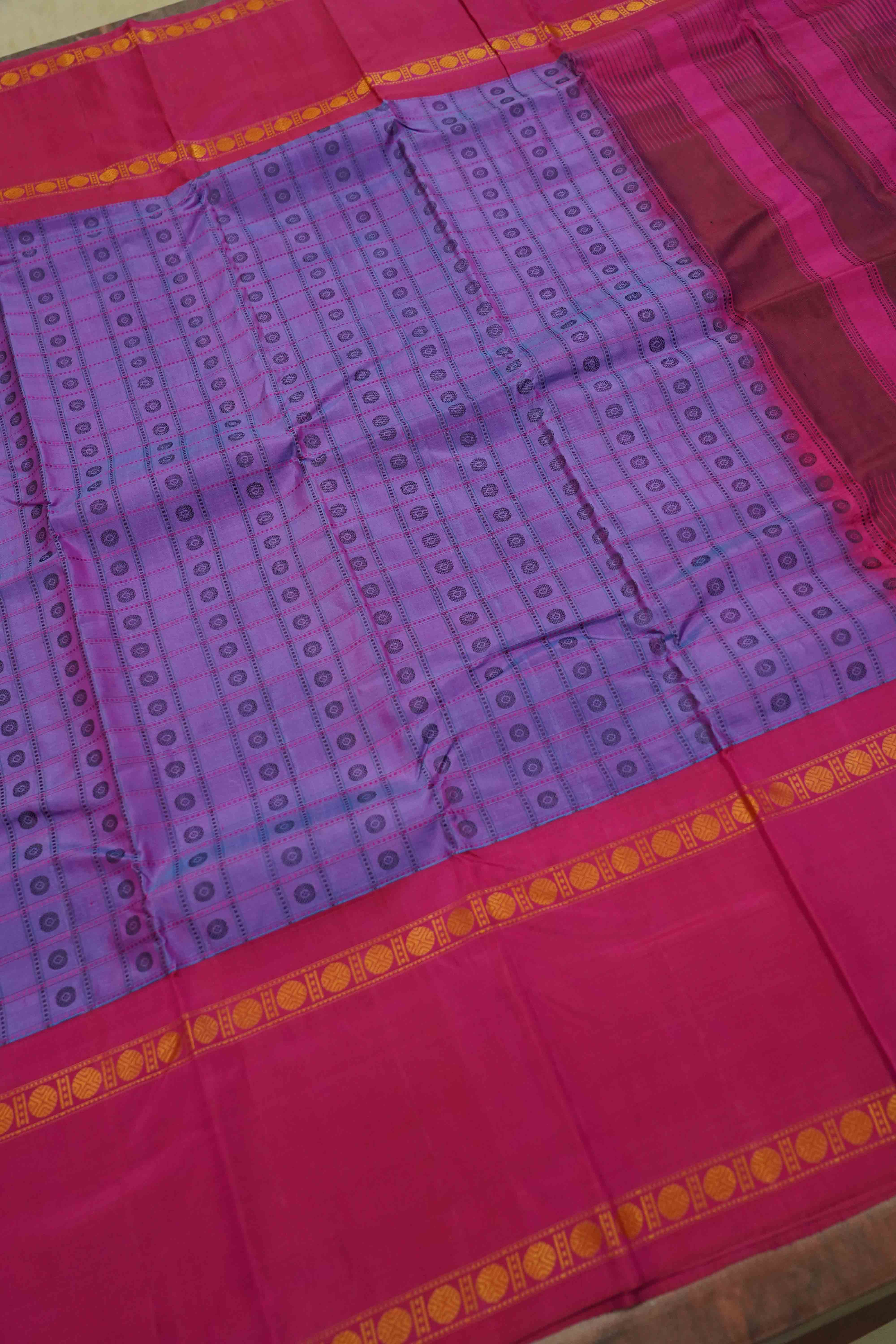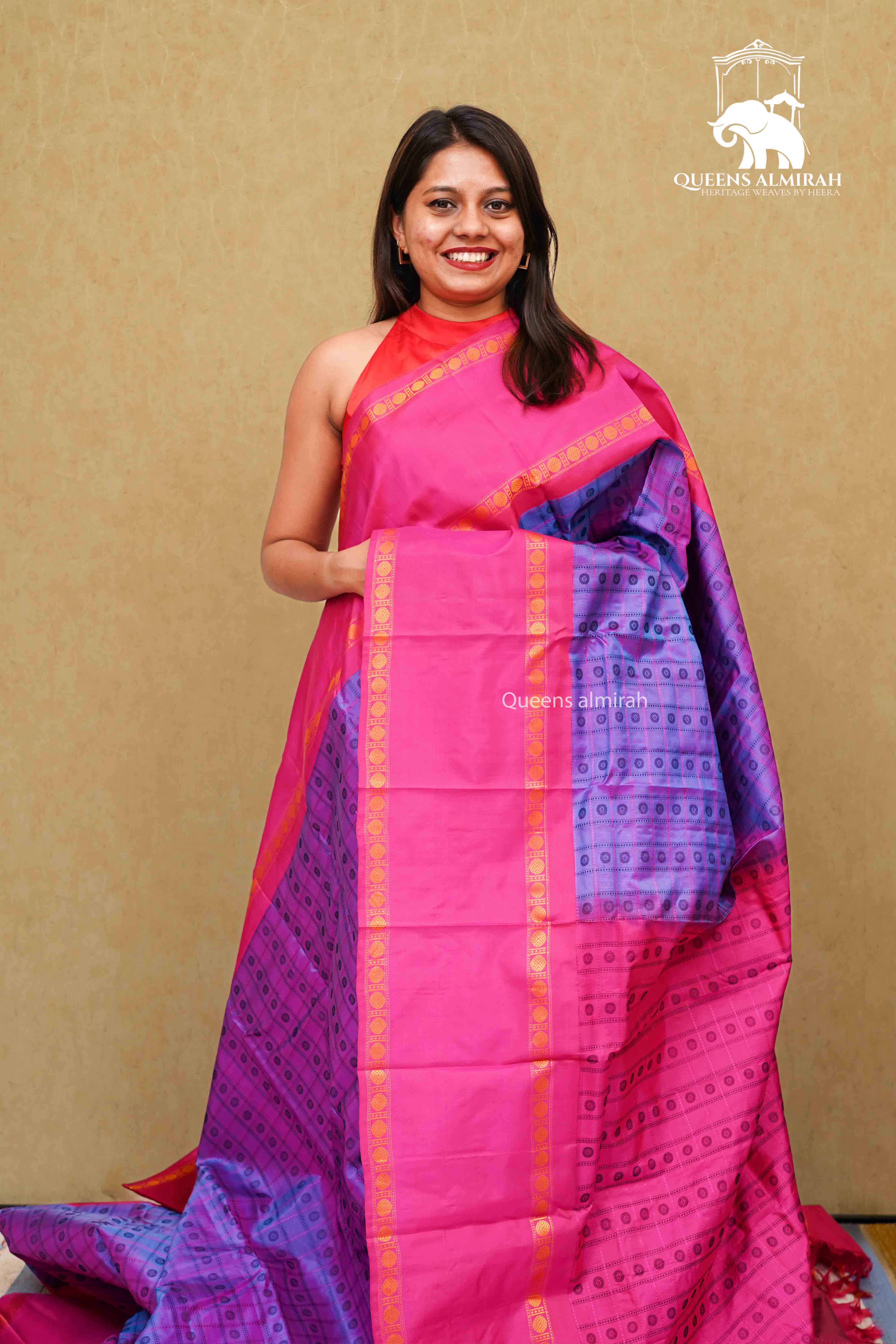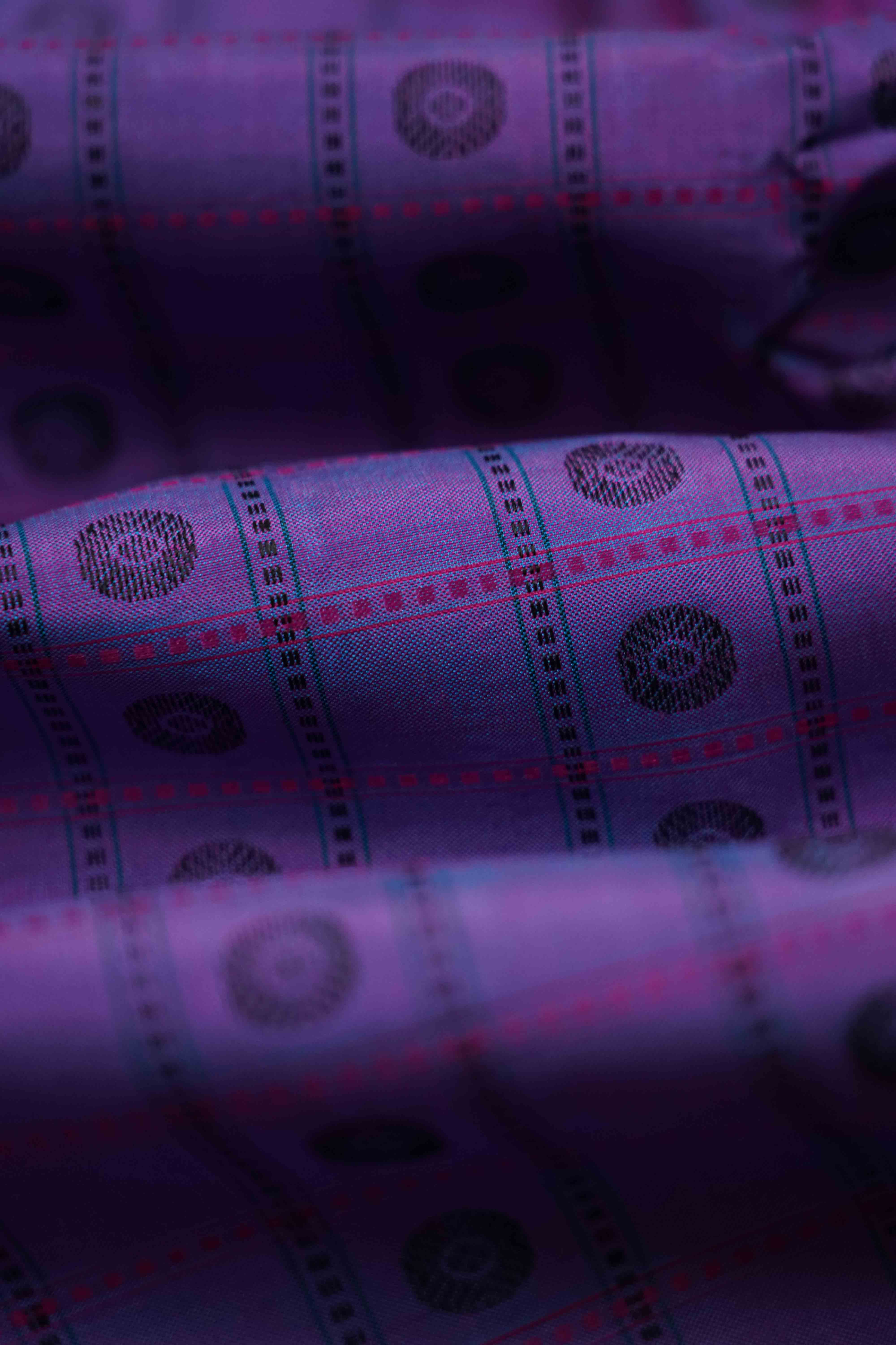 Experience luxury and grace with the PASSIA FLOWER PURPLE WITH MAGENTA PURE KANCHIVARAM SILK SAREE. Handcrafted with traditional thread work, intricate butta and checks, and rich rudraksha silk thread, this saree is a must-have in your collection. Elevate your style and make a statement at any occasion.
