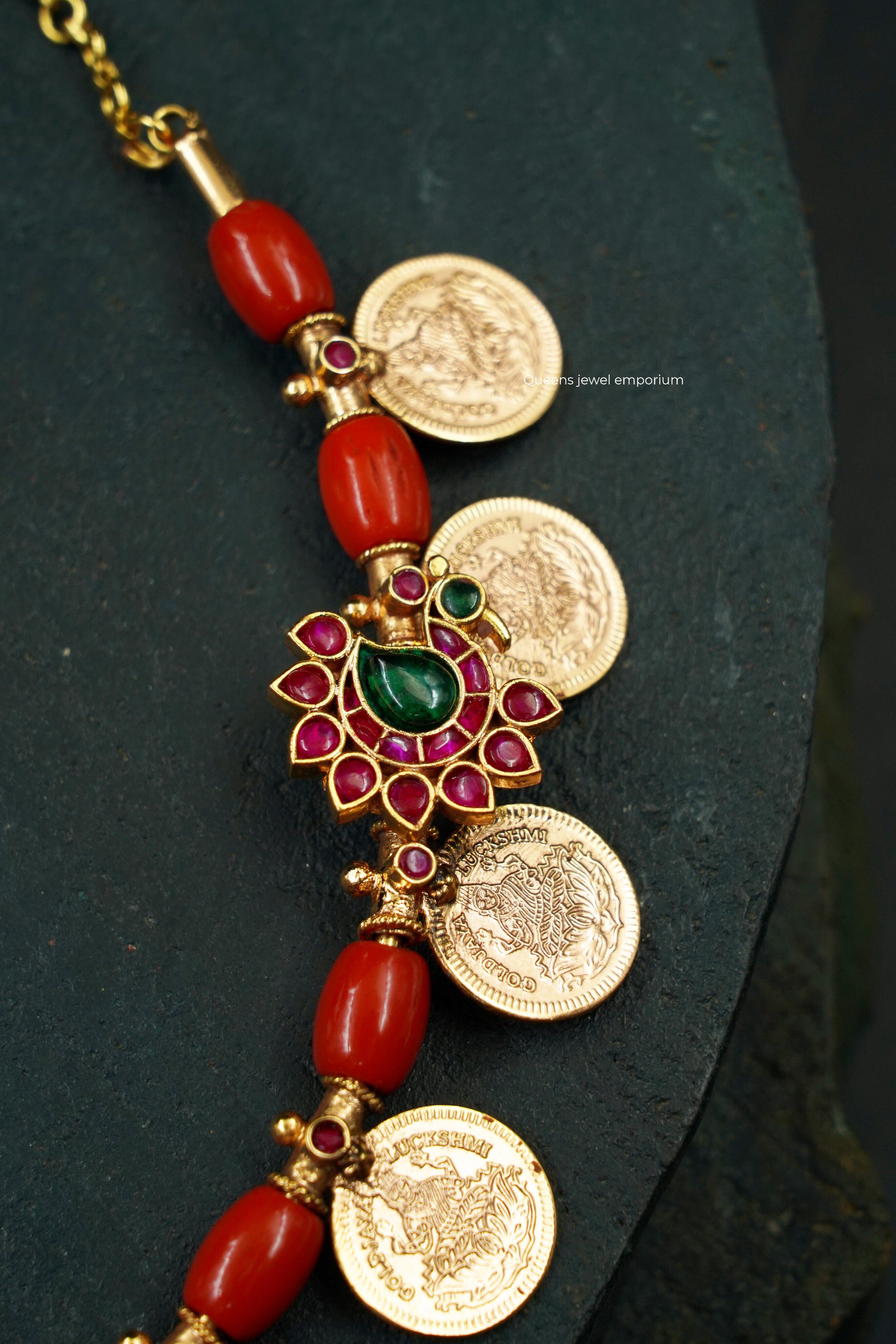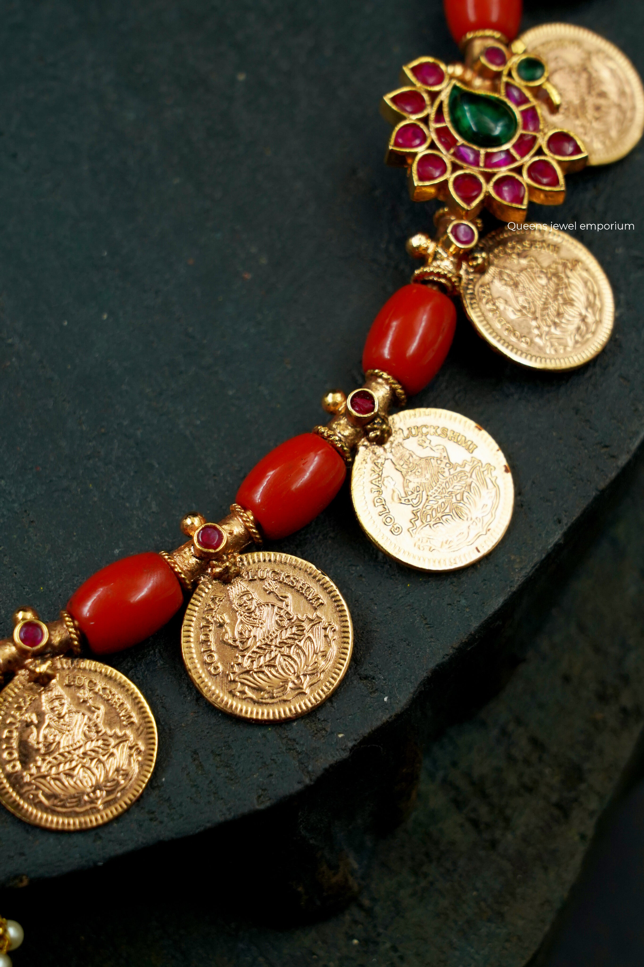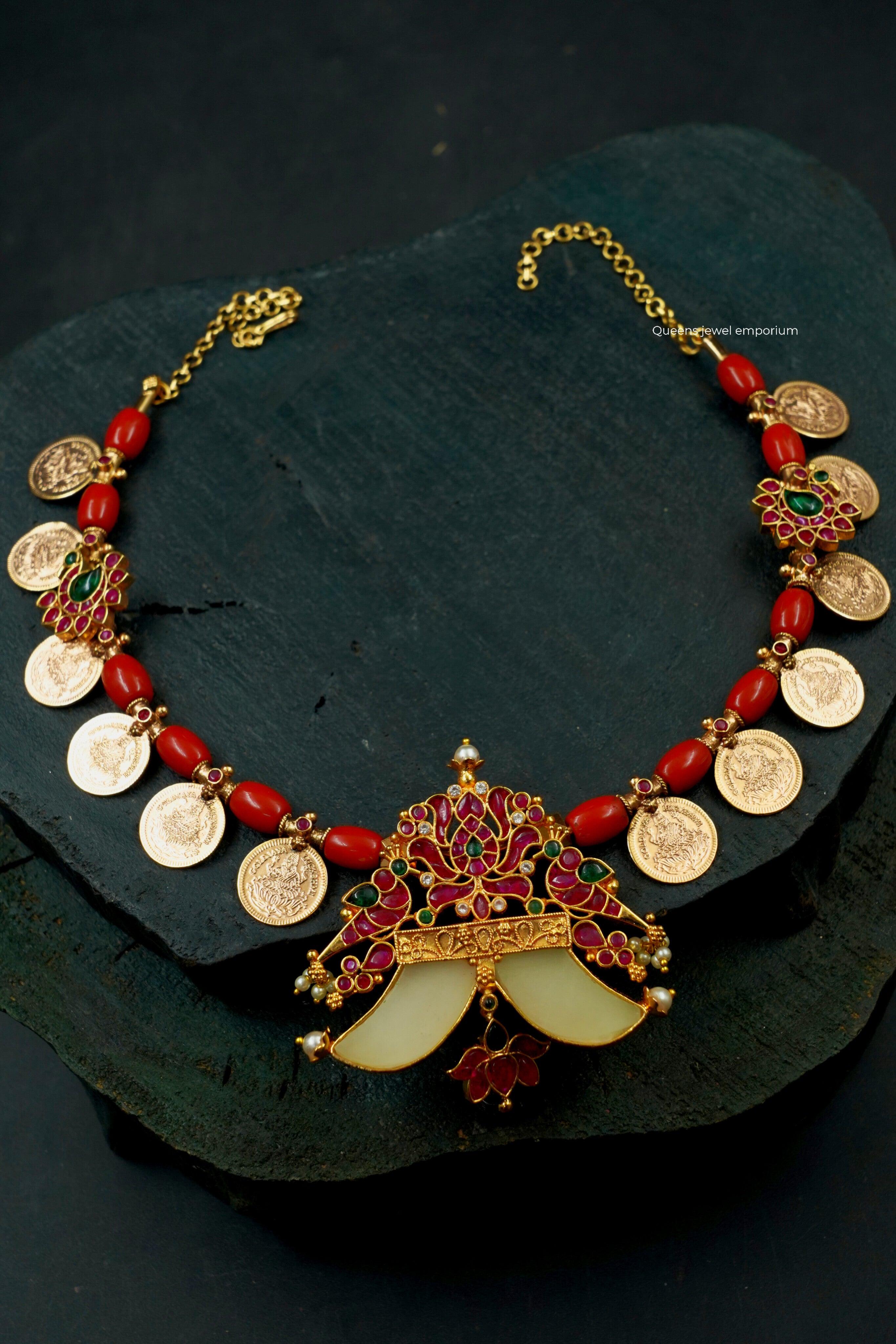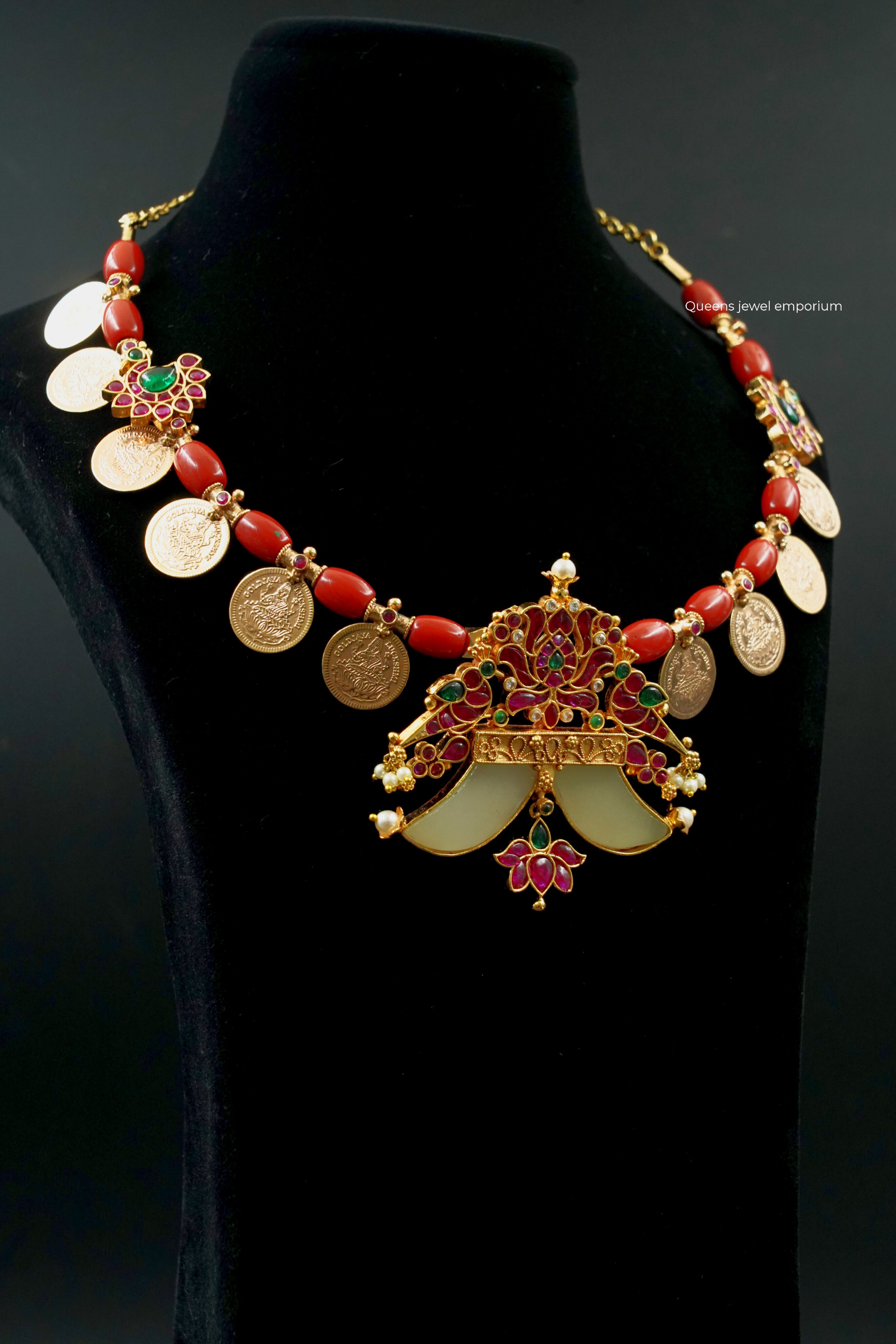 Lakshmi Kasu Hasli adorned with coral beads, two annapakshi motifs, and intricate lotus and kizhi designs. Embellished with red and green kemp stones, highlighted by two tiger teeth and a graceful lotus hanging. A bold statement of divine elegance and cultural heritage. Handcrafted by Queens Jewel Emporium, where artistry meets tradition.