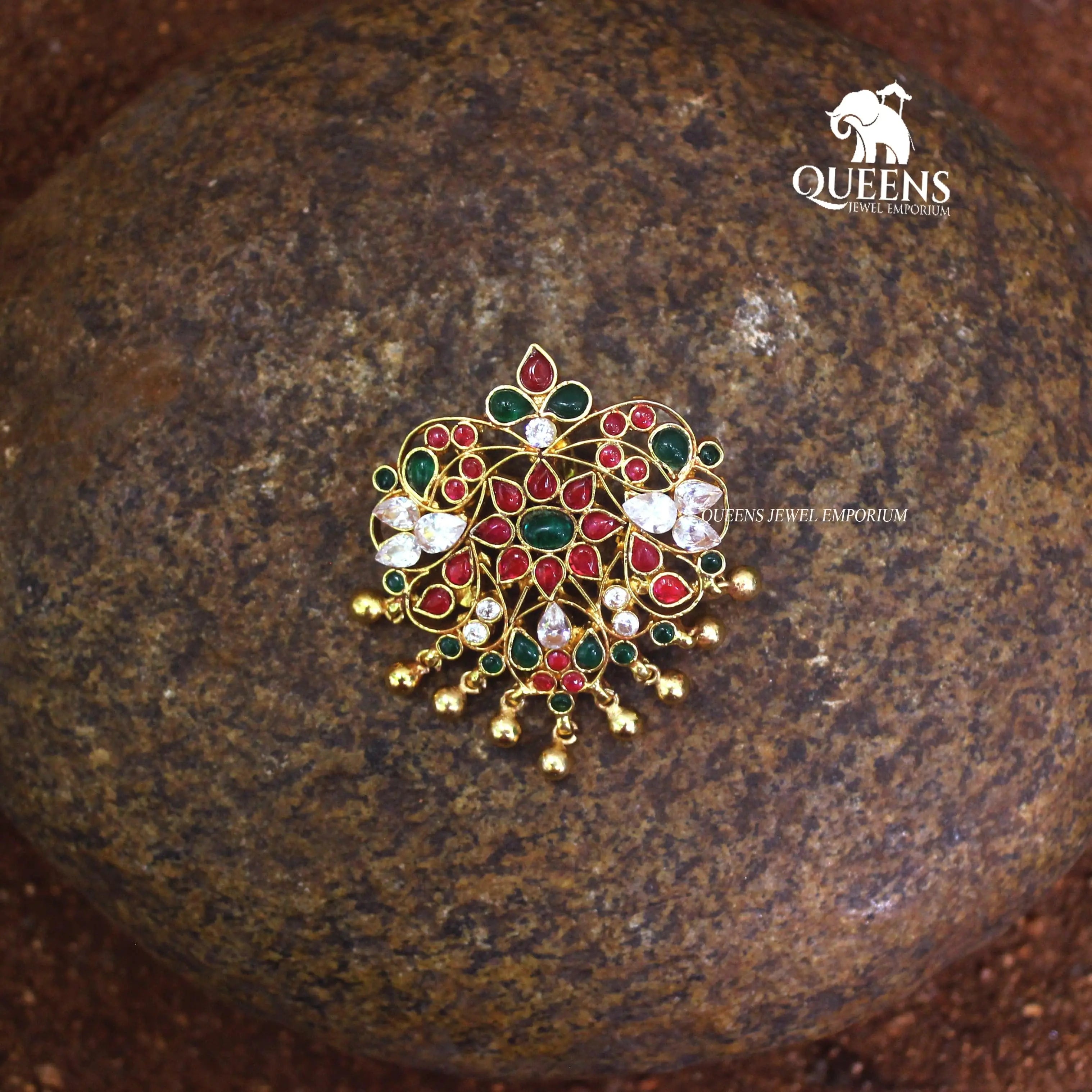 An elegant two-in-one, pendant come saree pin accessory studded with the Kemp stones is a real stunner to accessorize your pretty Kancheevarams.