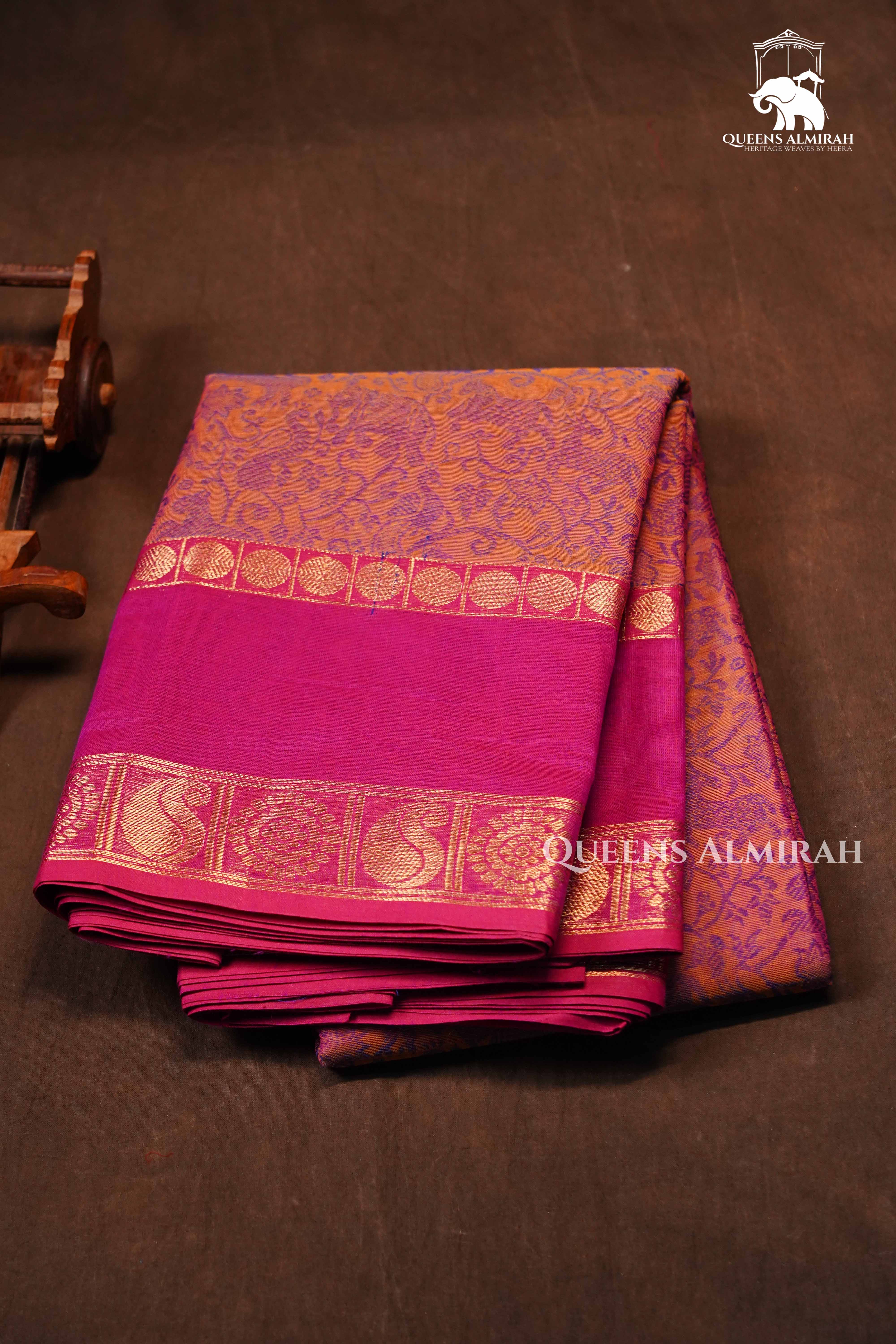 Experience elegance and tradition with our peach Orange With Pink Kanchi Cotton Saree. This beautifully crafted saree features a stunning golden border with intricate peacock and elephant designs. Delight in the detailed body, adorned with elephant, deer, flower, and leaf motifs. Made from high-quality kanchi cotton, this saree is a must-have for any occasion.
