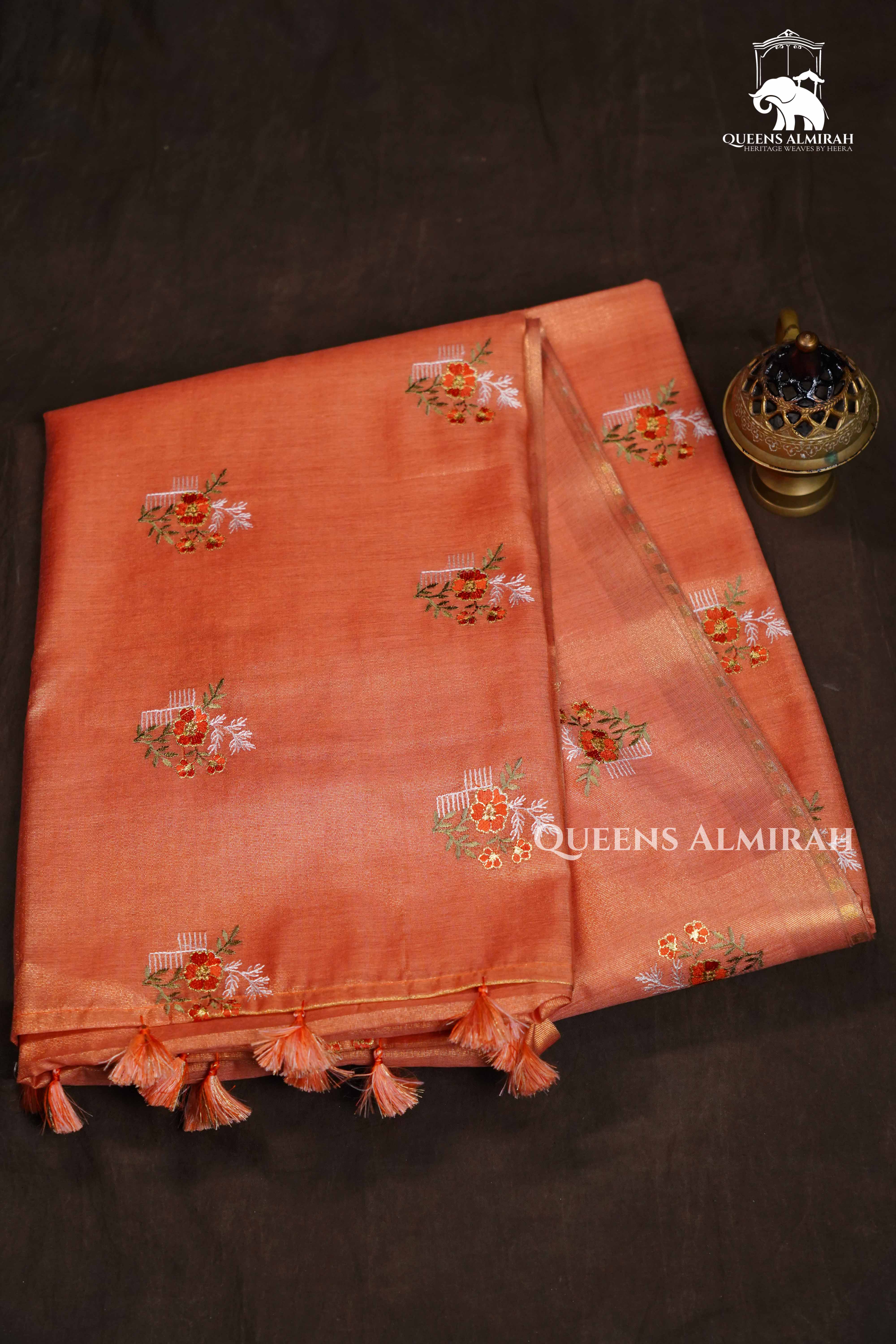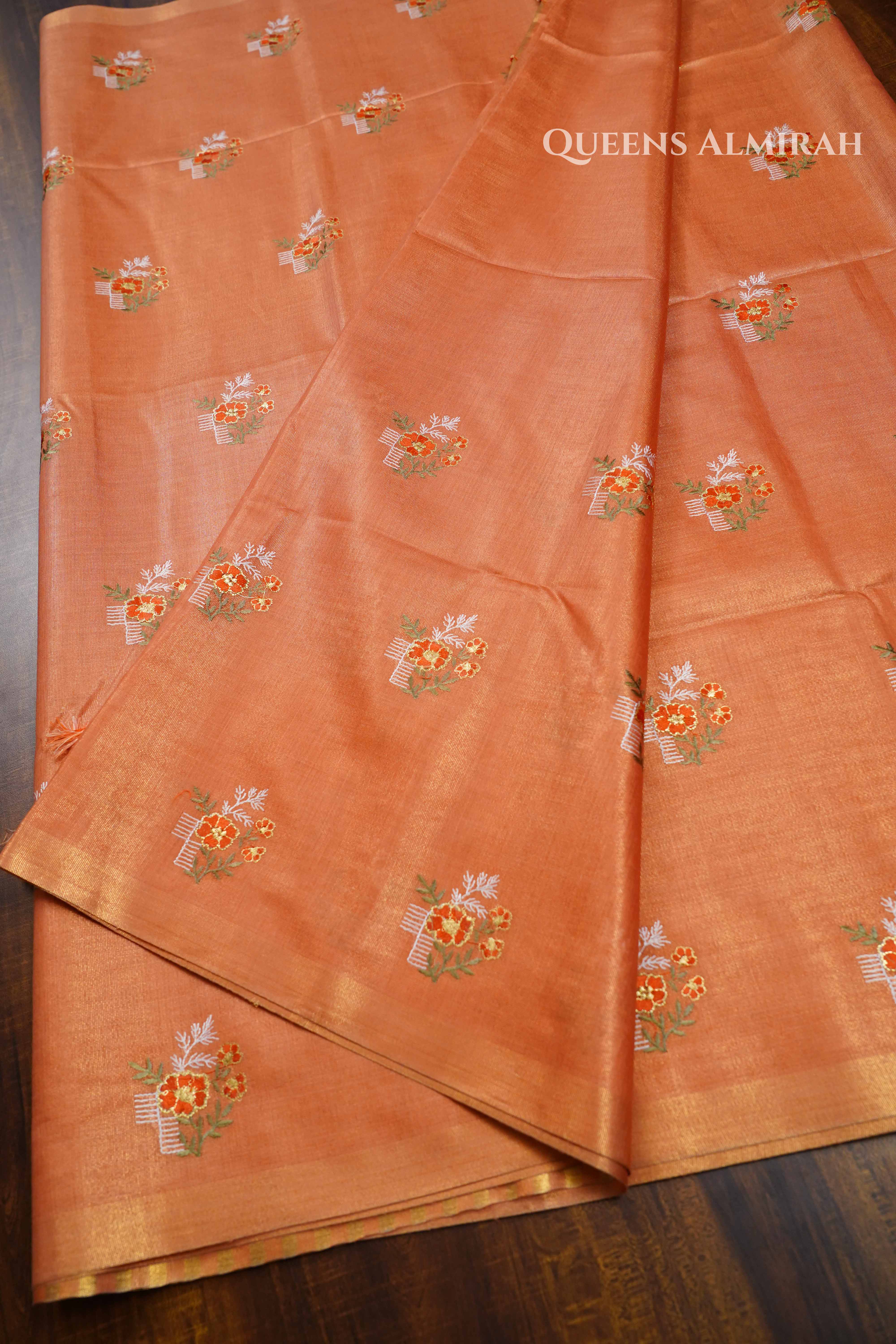 Charming and elegant, these Linen Tissue Saree feature delicate floral embroidery on warm peach tones. The lightweight, soft-textured fabric offers a graceful drape with a gentle sheen, perfect for day events and casual festive occasions.