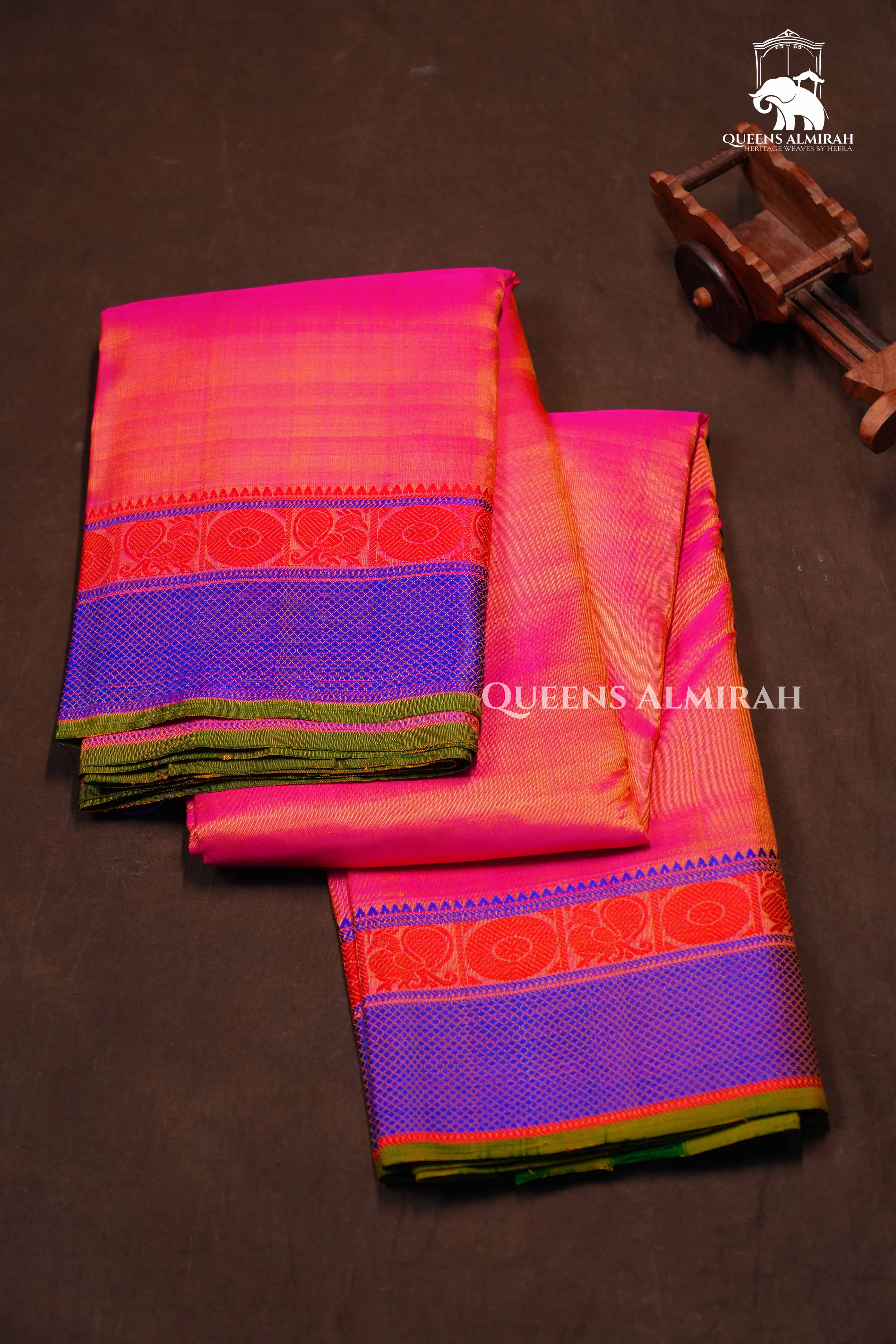 A stunning Kanchivaram silk saree in a unique peach-orange body, beautifully contrasted with a royal blue border and pallu. The border is adorned with intricate bird and floral motifs in zari, while the green selvedge adds a vibrant finishing touch. A perfect blend of tradition and elegance for festive and special occasions.