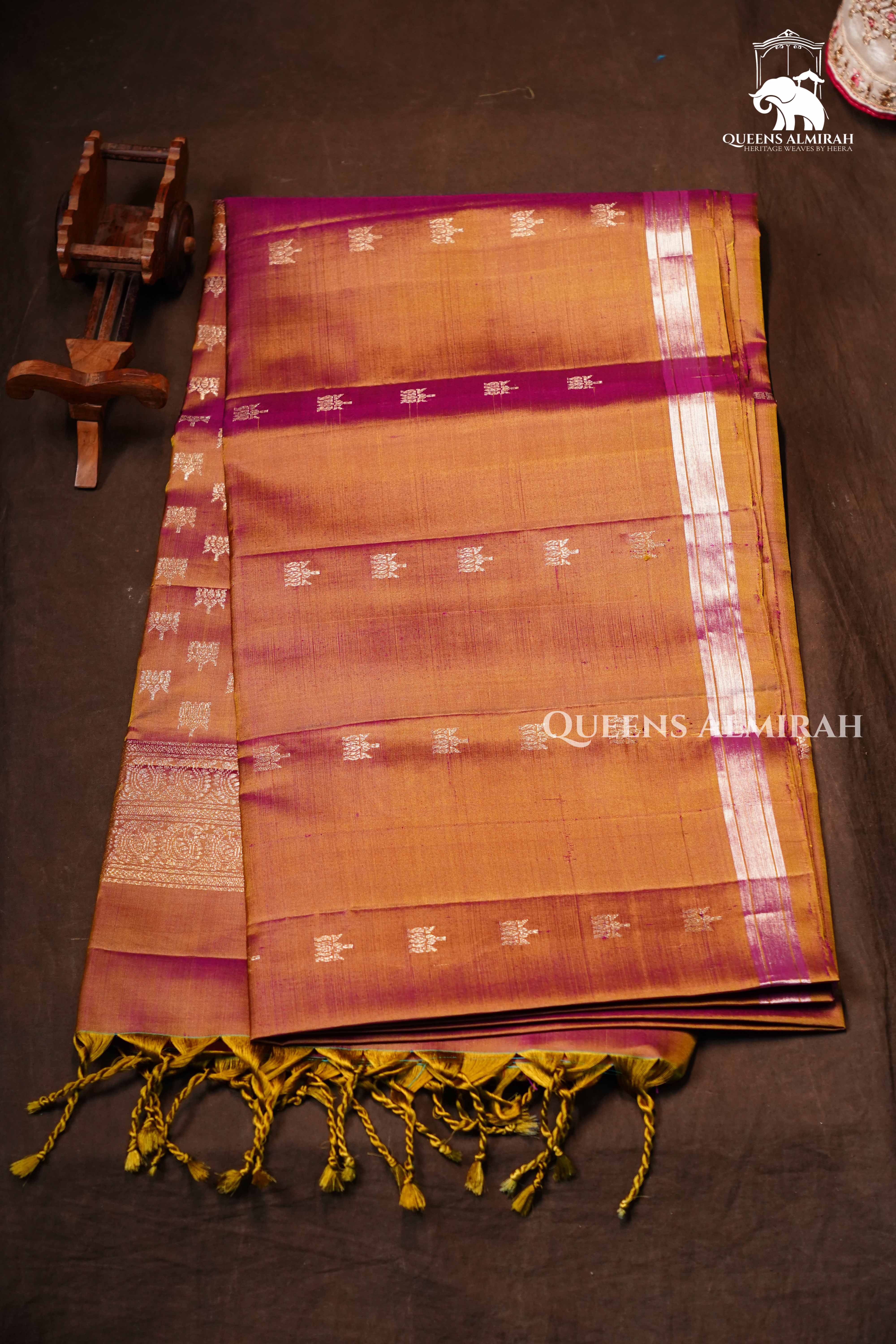 This Peach Orange Kanchi Cotton Saree beautifully blends golden yellow and soft pinkish-brown hues, creating a graceful dual-shaded effect. The body is adorned with delicate silver thread motifs, while the subtle zari borders and intricately woven pallu add a refined touch of tradition. Elegant, lightweight, and classy, this saree is perfect for festive gatherings, cultural events, and temple occasions, making it a timeless addition to your wardrobe.