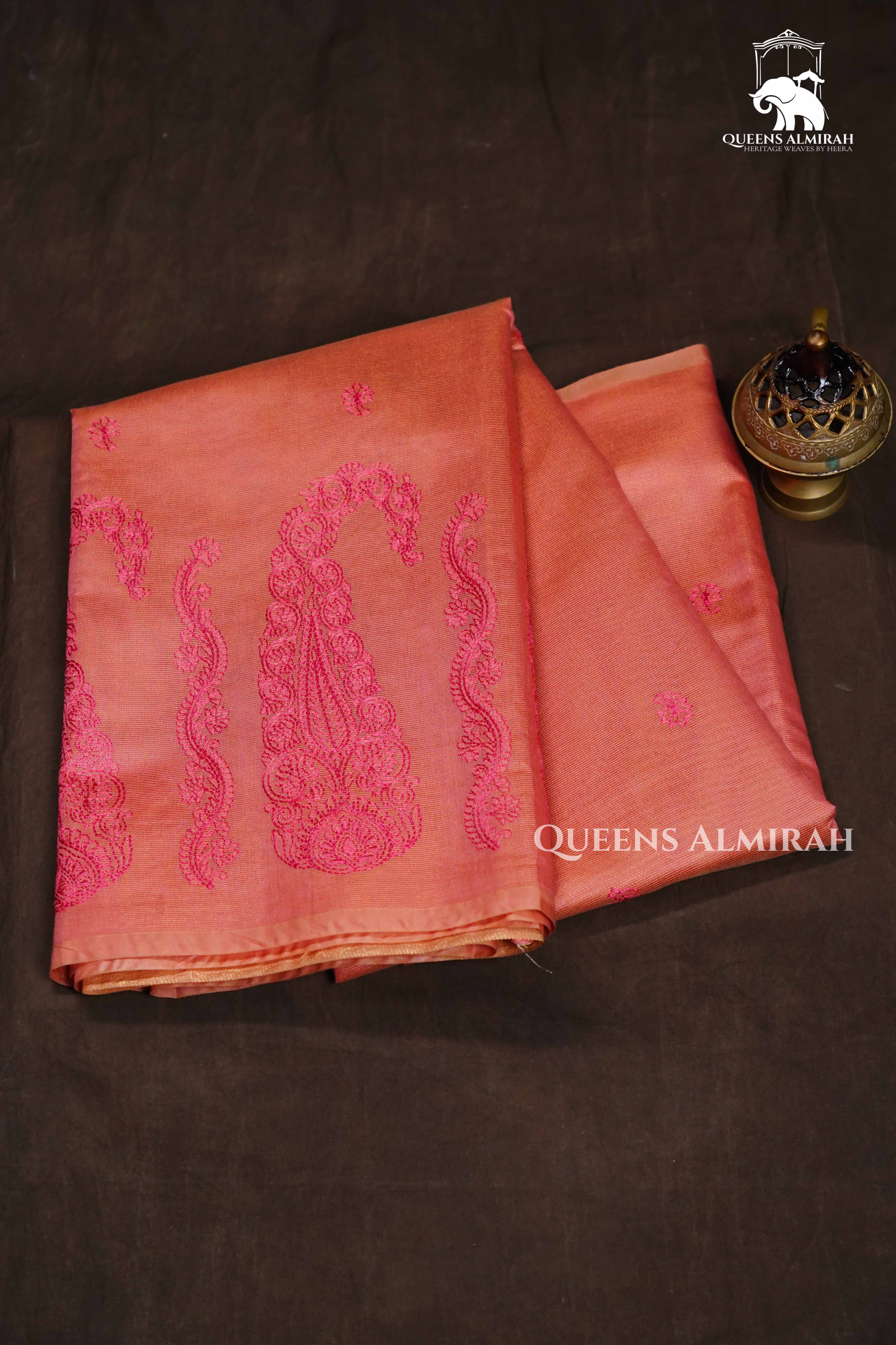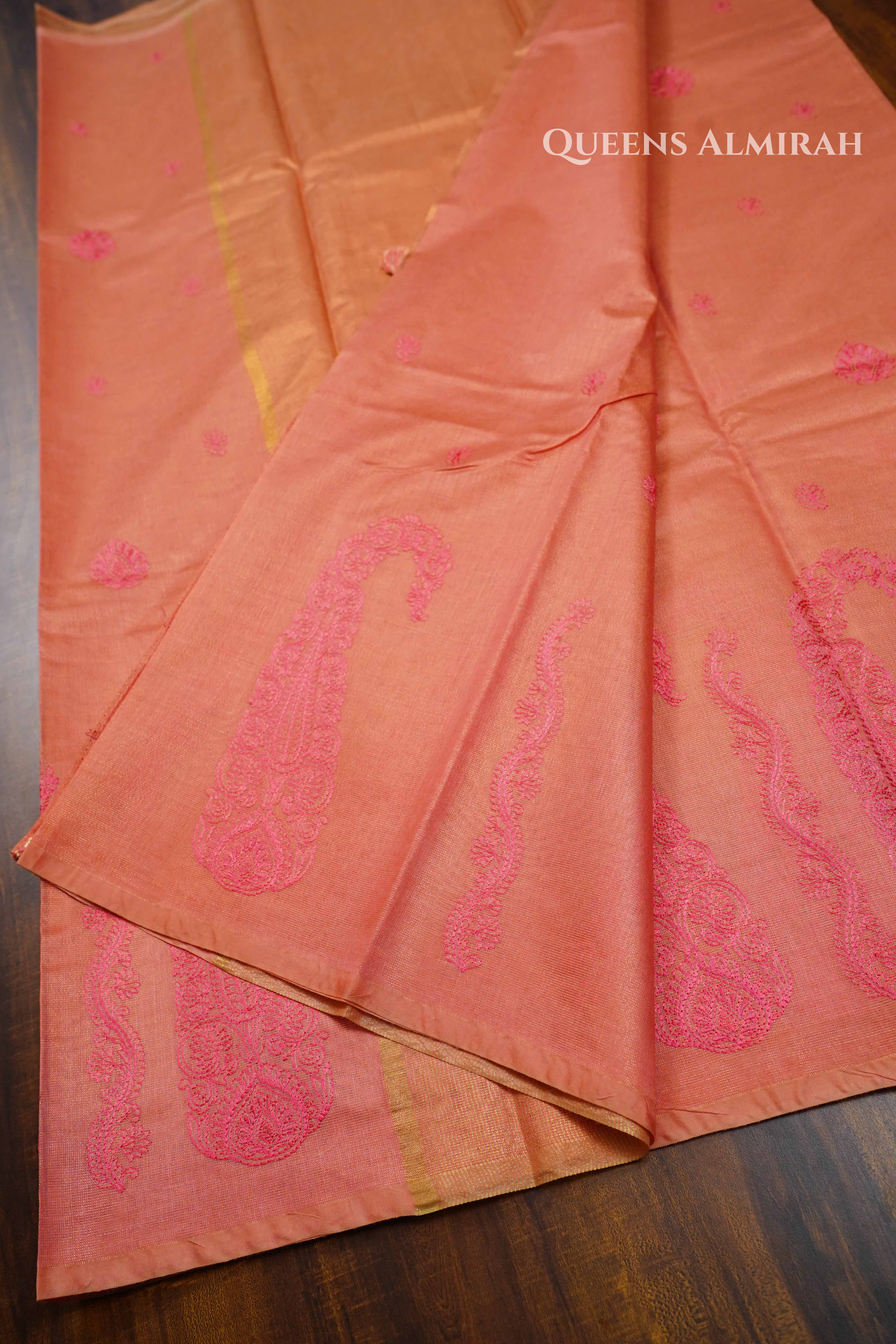 This soft Peach Pink Linen Tissue with embroidery Saree, adorned with delicate tone-on-tone embroidery and classic paisley motifs, reflects timeless femininity — perfect for intimate gatherings, bridal events, or elegant celebrations.