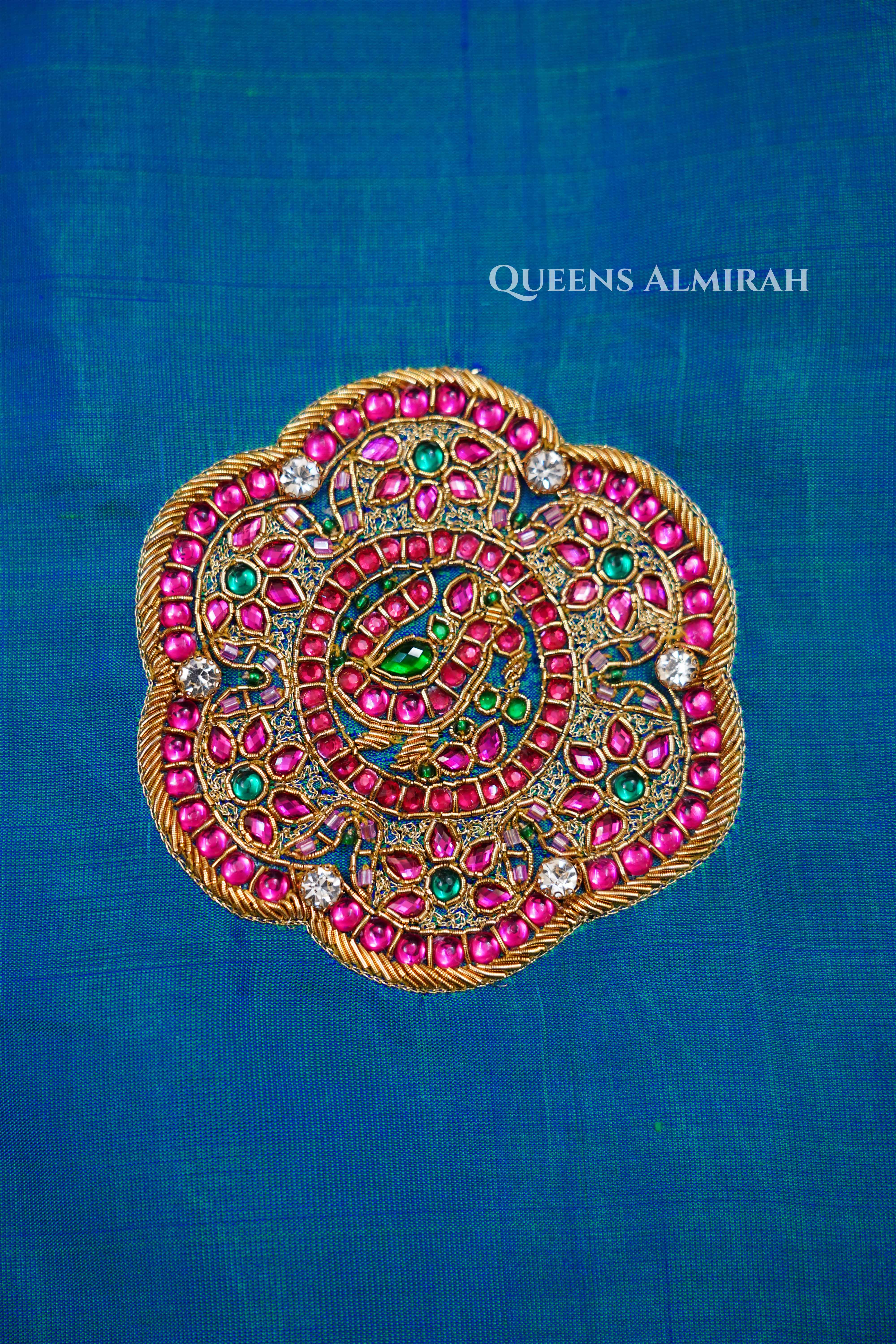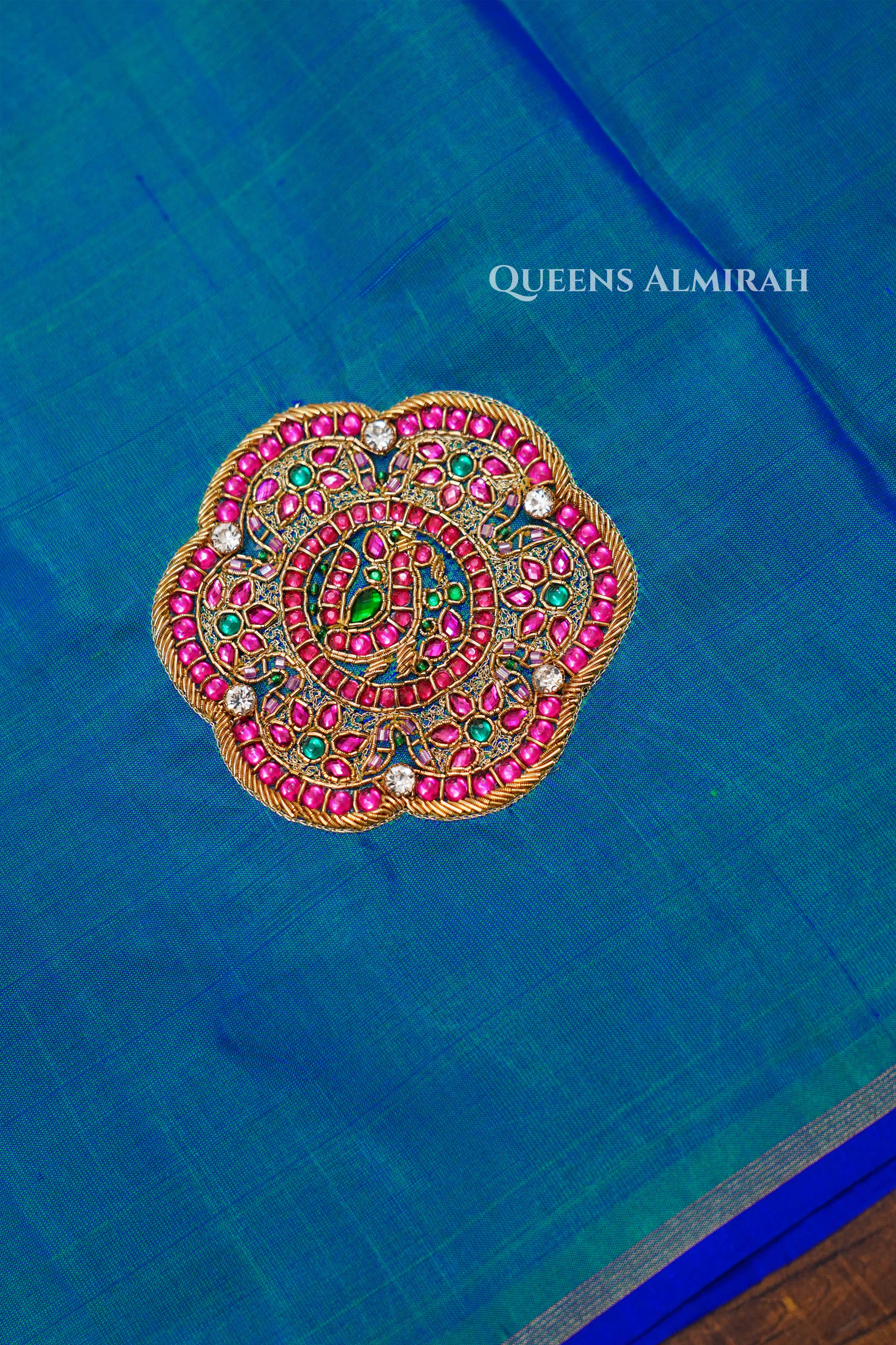 Gracefully crafted in Peacock Green pure kanchivaram silk, this saree features exquisite emposed jewellery-style embroidery with Floral motifs all over the body. The meticulous craftsmanship showcases classic artistry, while the grand pallu adds a regal finish. Lightweight and elegant, it offers unmatched comfort with a rich, heritage look — perfect for festive occasions and cultural celebrations.