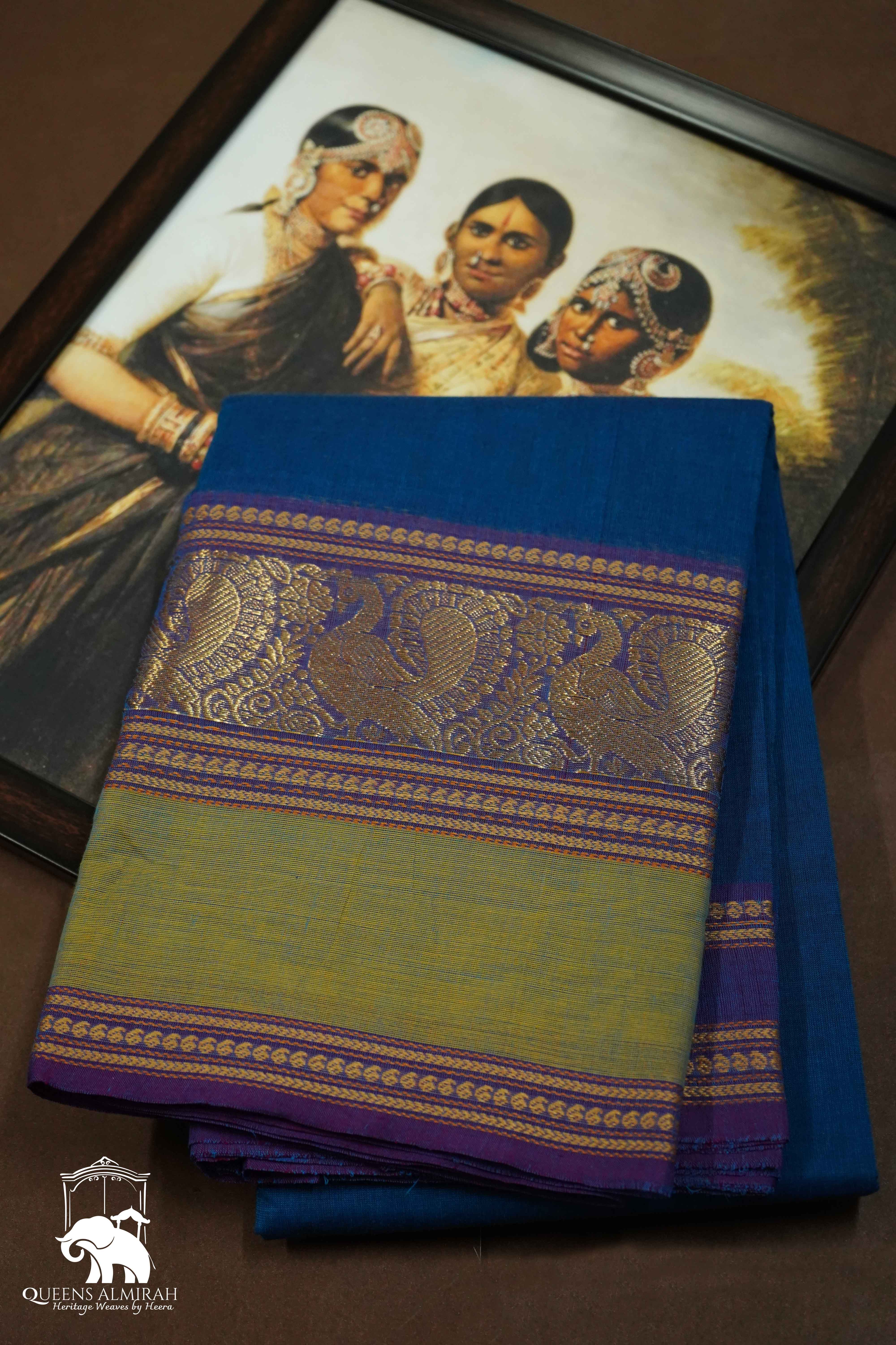 Experience the elegance of our PERISAN BLUE WITH DEEP PURPLE KANCHI COTTON SAREE. Its intricate Rettapet border, adorned with a golden peacock design, adds a touch of royalty to your wardrobe. Made with the finest quality Kanchi cotton, this saree is both comfortable and luxurious.
